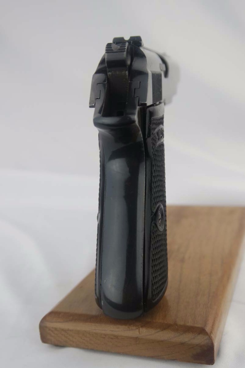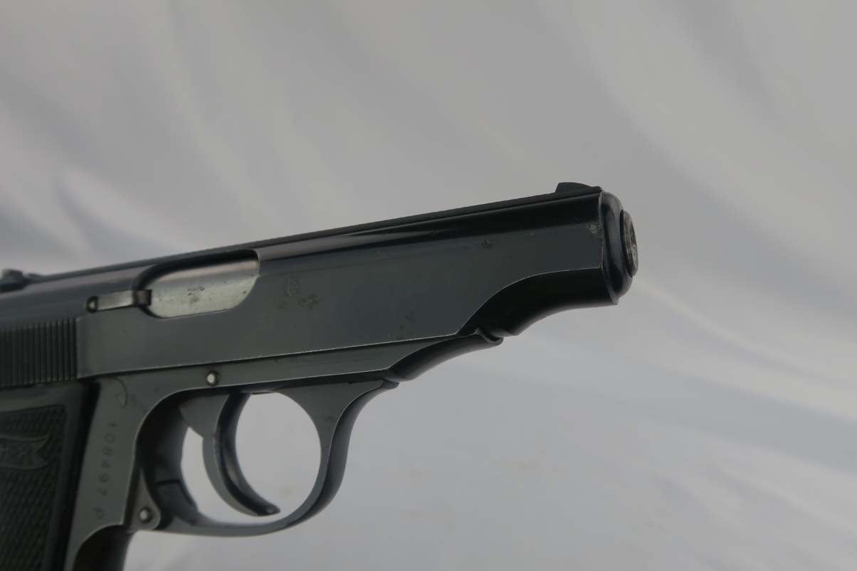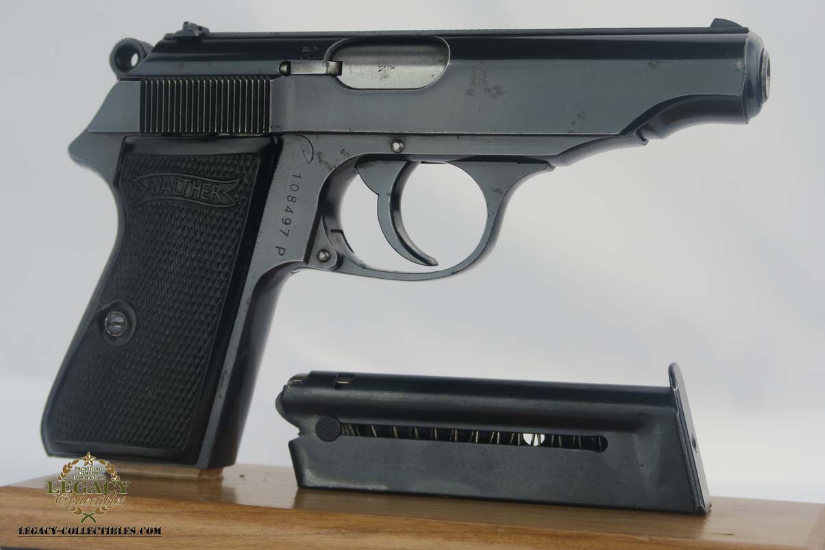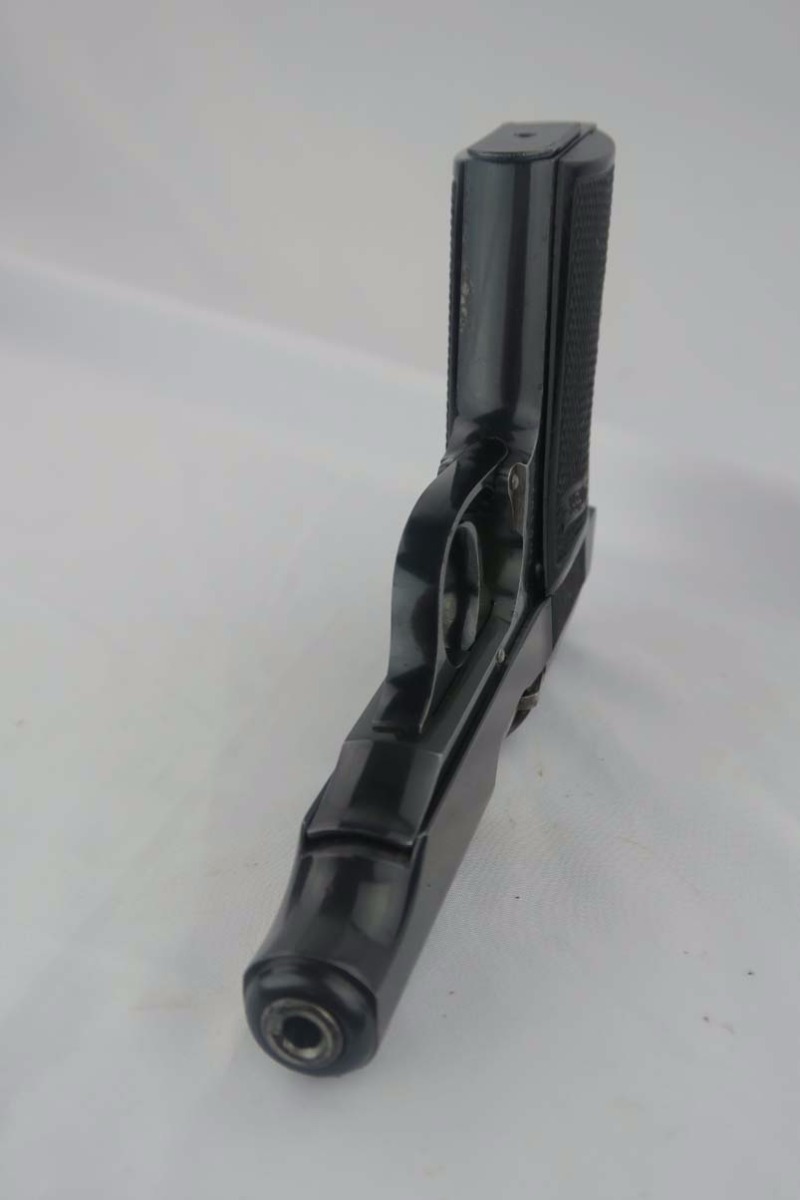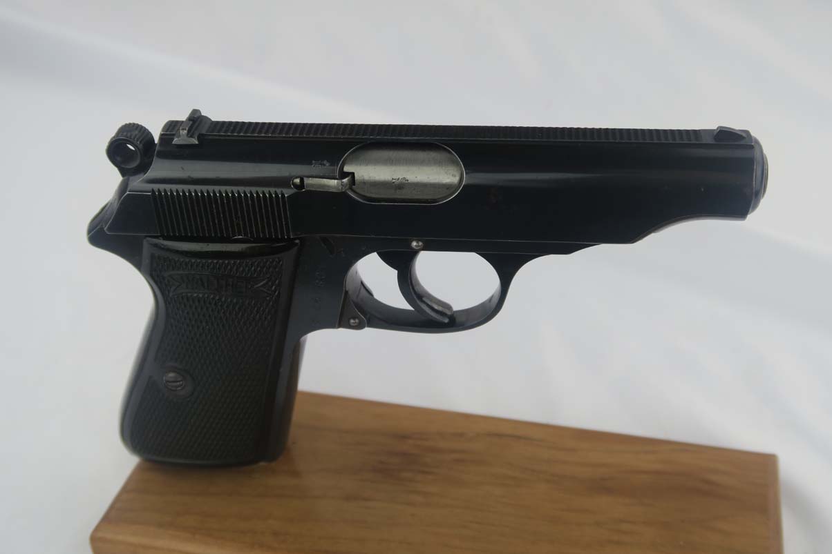 7/13/17 – This is a WW2 era Walther PP, chambered in .22.  The pistol is correct and original, with about 96-97% bluing remaining.  While it does have minimal finish loss, there is noticeable pitting on both sides of the slide.  Proper grips and mag, but the left panel does have a crack in it.  Minty bore.  Would make a great shooter!