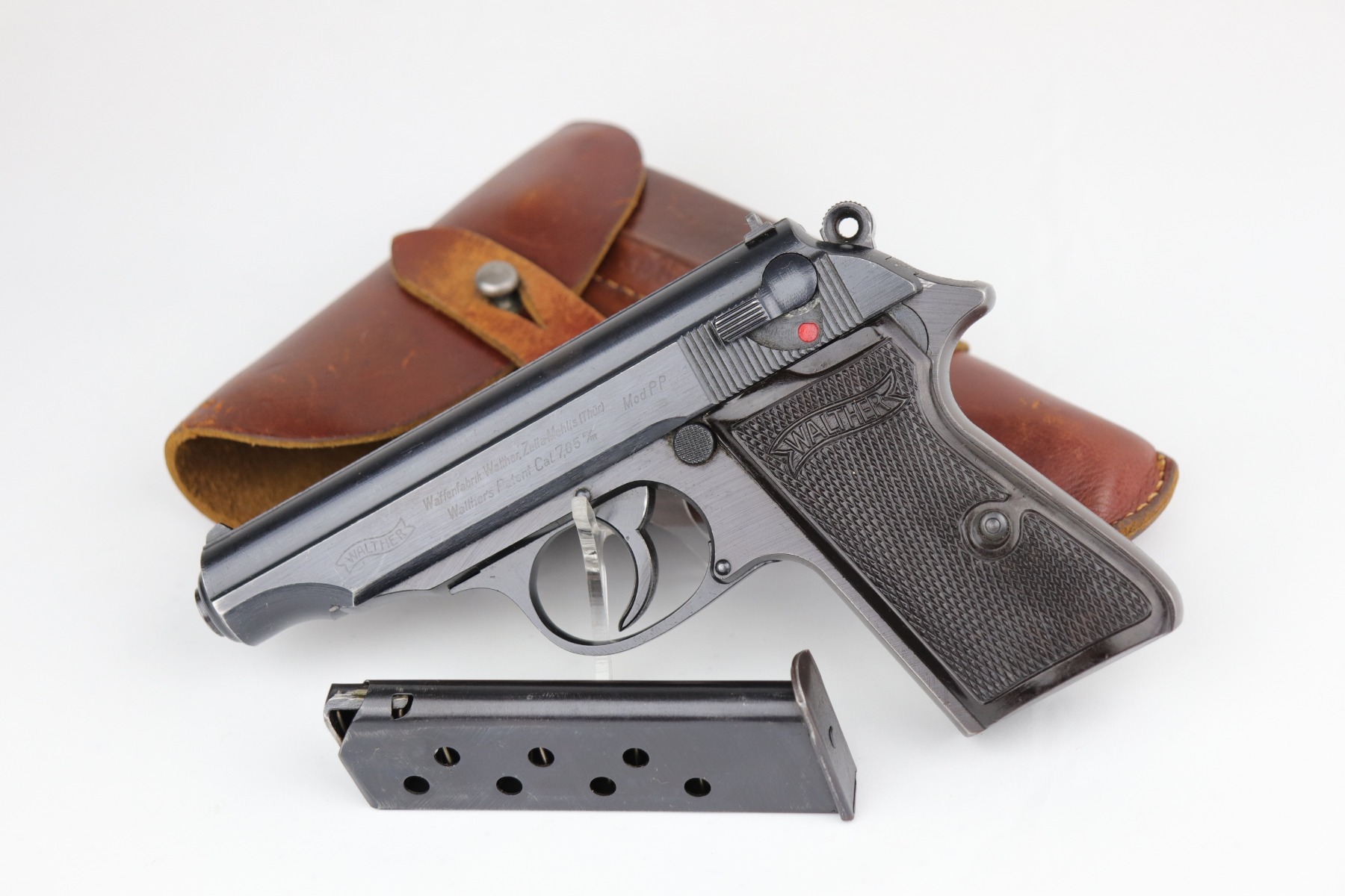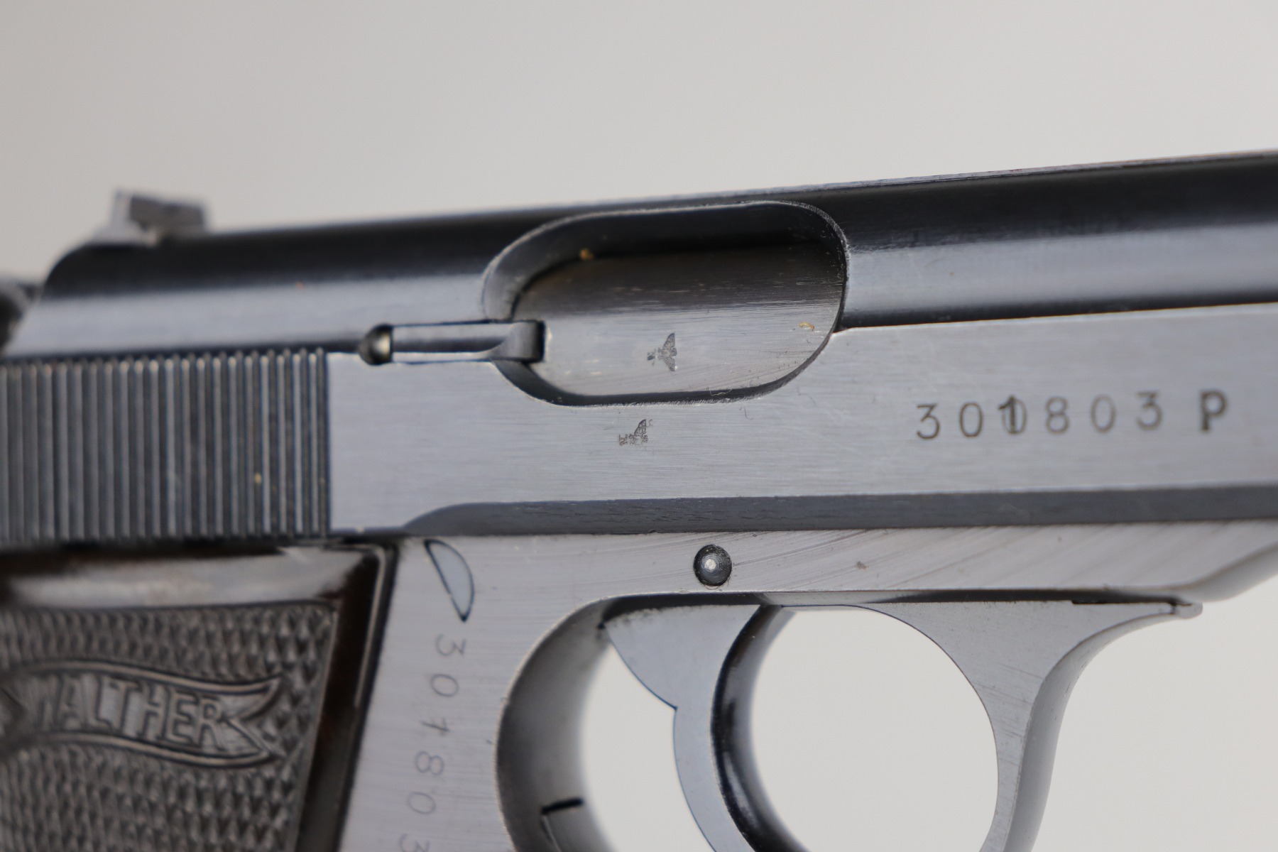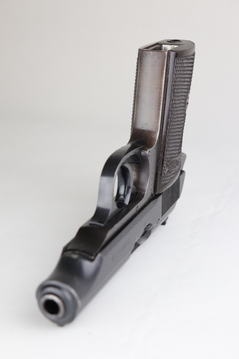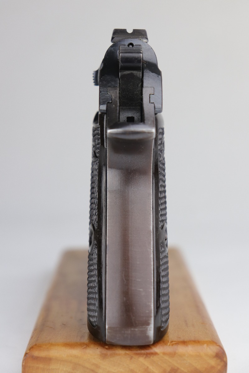7/9/20 – This is an excellent Walther PP rig, made in 1942. This is a commercial gun with the proper Eagle/N proofs. The gun is all matching. What makes this one special is that “1” in the serial number on the slide is factory overstamped. Overall, the gun is in excellent condition, retaining 90+% of its original finish. The profile views are excellent. There is one small spot of discoloration on the top of the slide. This one is difficult to rate, given the nature of the wear – both of the straps have minor thinning and an even layer of brown patina. The bore is minty. It comes with a period-correct wartime PP magazine and holster in great condition. Light handling marks on the holster throughout.