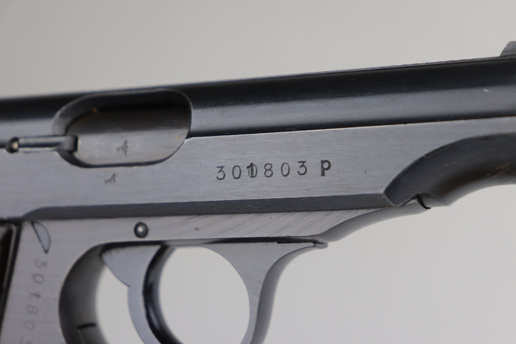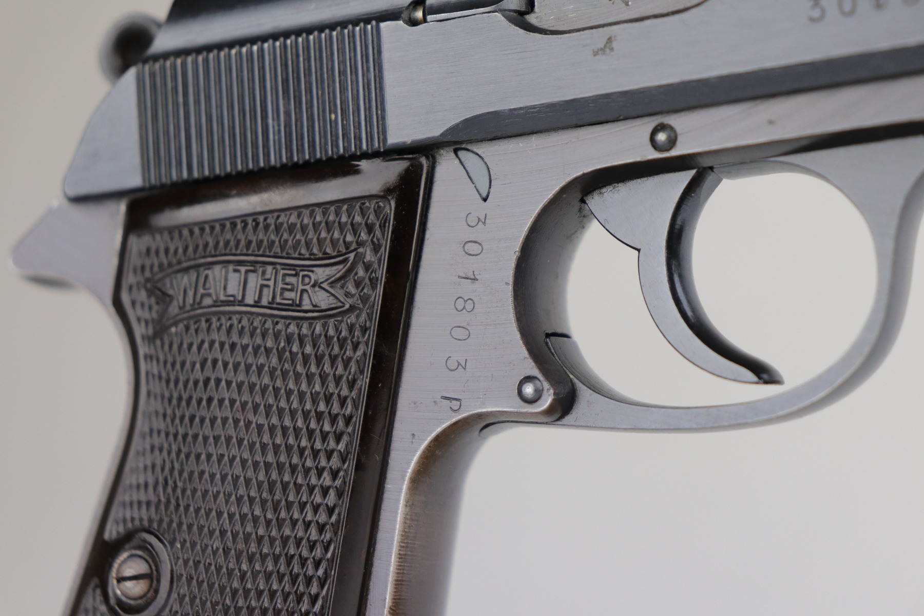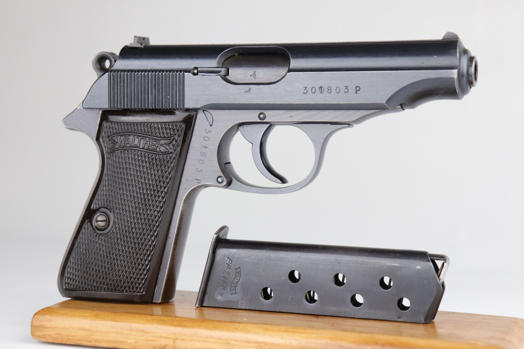 7/9/20 – This is an excellent Walther PP rig, made in 1942. This is a commercial gun with the proper Eagle/N proofs. The gun is all matching. What makes this one special is that “1” in the serial number on the slide is factory overstamped. Overall, the gun is in excellent condition, retaining 90+% of its original finish. The profile views are excellent. There is one small spot of discoloration on the top of the slide. This one is difficult to rate, given the nature of the wear – both of the straps have minor thinning and an even layer of brown patina. The bore is minty. It comes with a period-correct wartime PP magazine and holster in great condition. Light handling marks on the holster throughout.