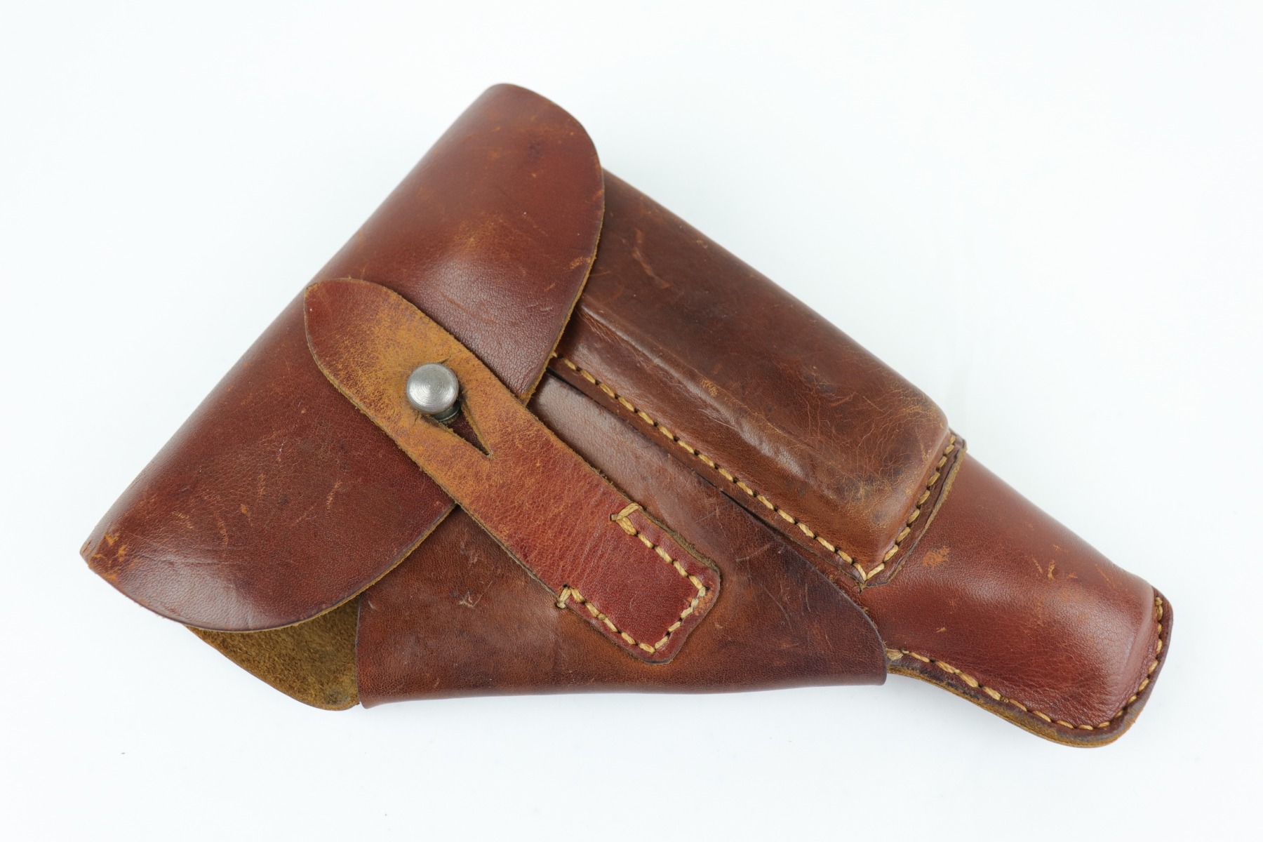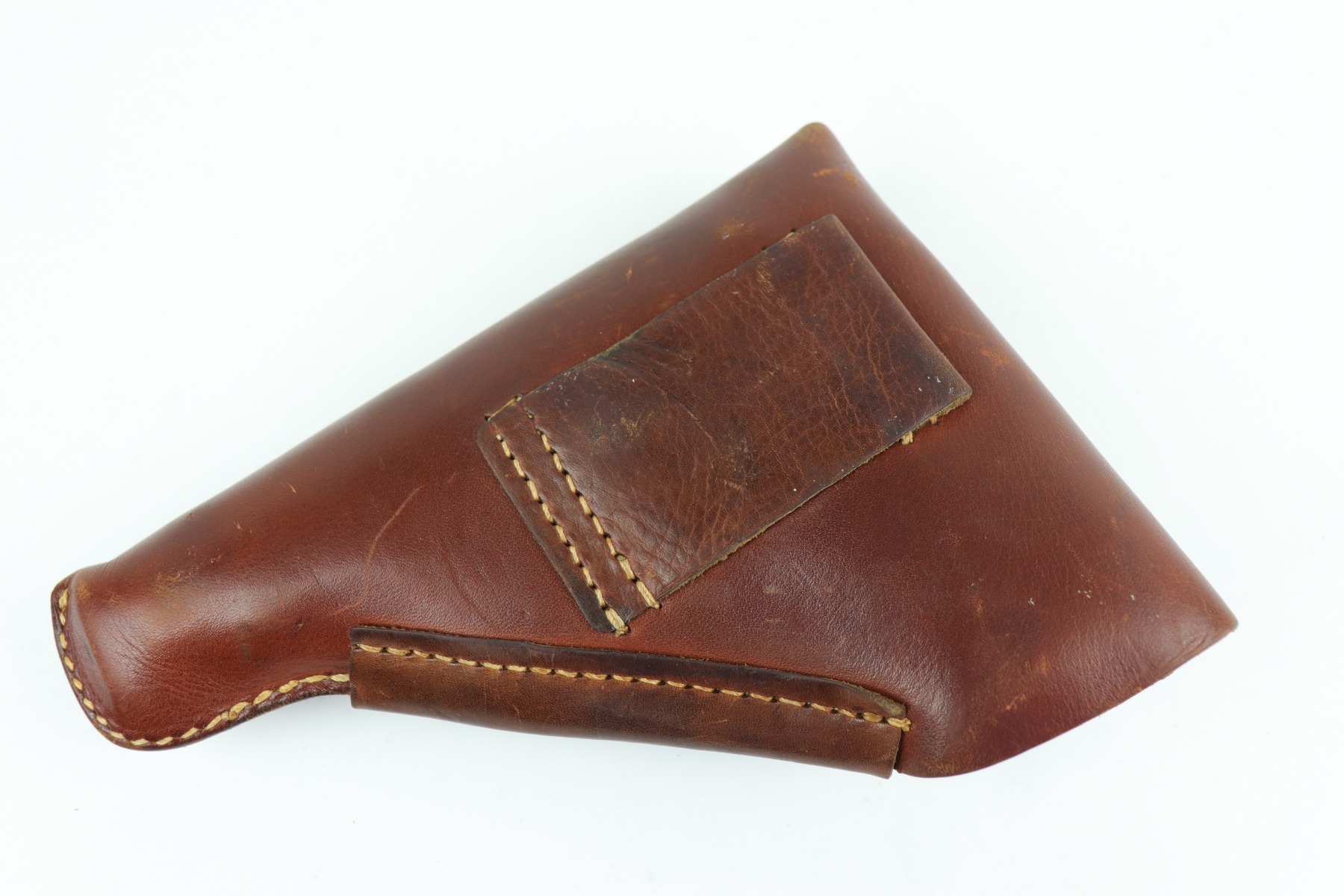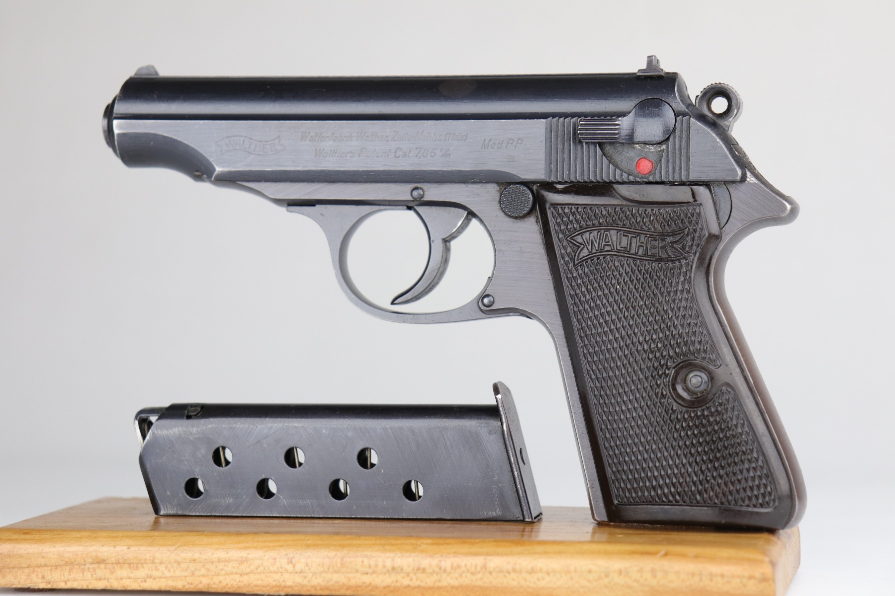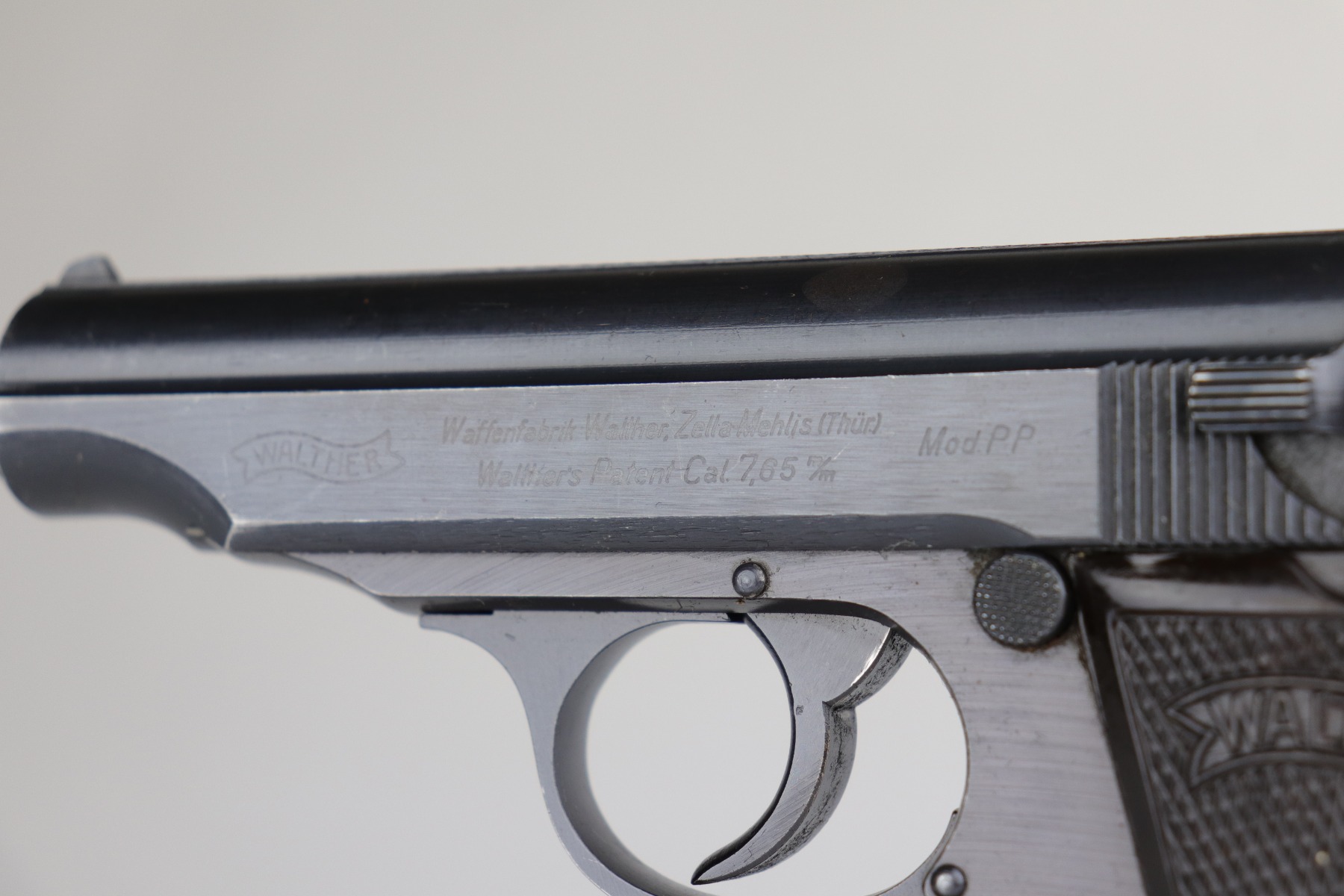 7/9/20 – This is an excellent Walther PP rig, made in 1942. This is a commercial gun with the proper Eagle/N proofs. The gun is all matching. What makes this one special is that “1” in the serial number on the slide is factory overstamped. Overall, the gun is in excellent condition, retaining 90+% of its original finish. The profile views are excellent. There is one small spot of discoloration on the top of the slide. This one is difficult to rate, given the nature of the wear – both of the straps have minor thinning and an even layer of brown patina. The bore is minty. It comes with a period-correct wartime PP magazine and holster in great condition. Light handling marks on the holster throughout.