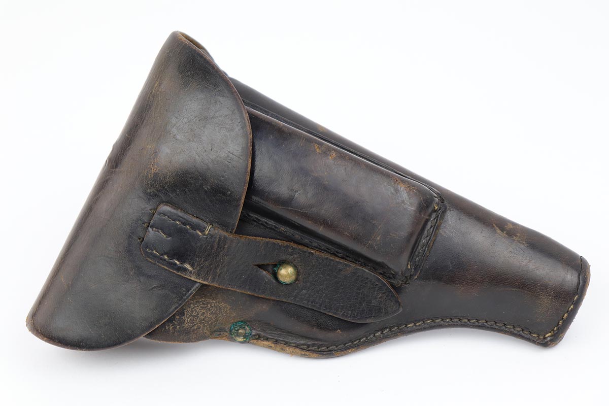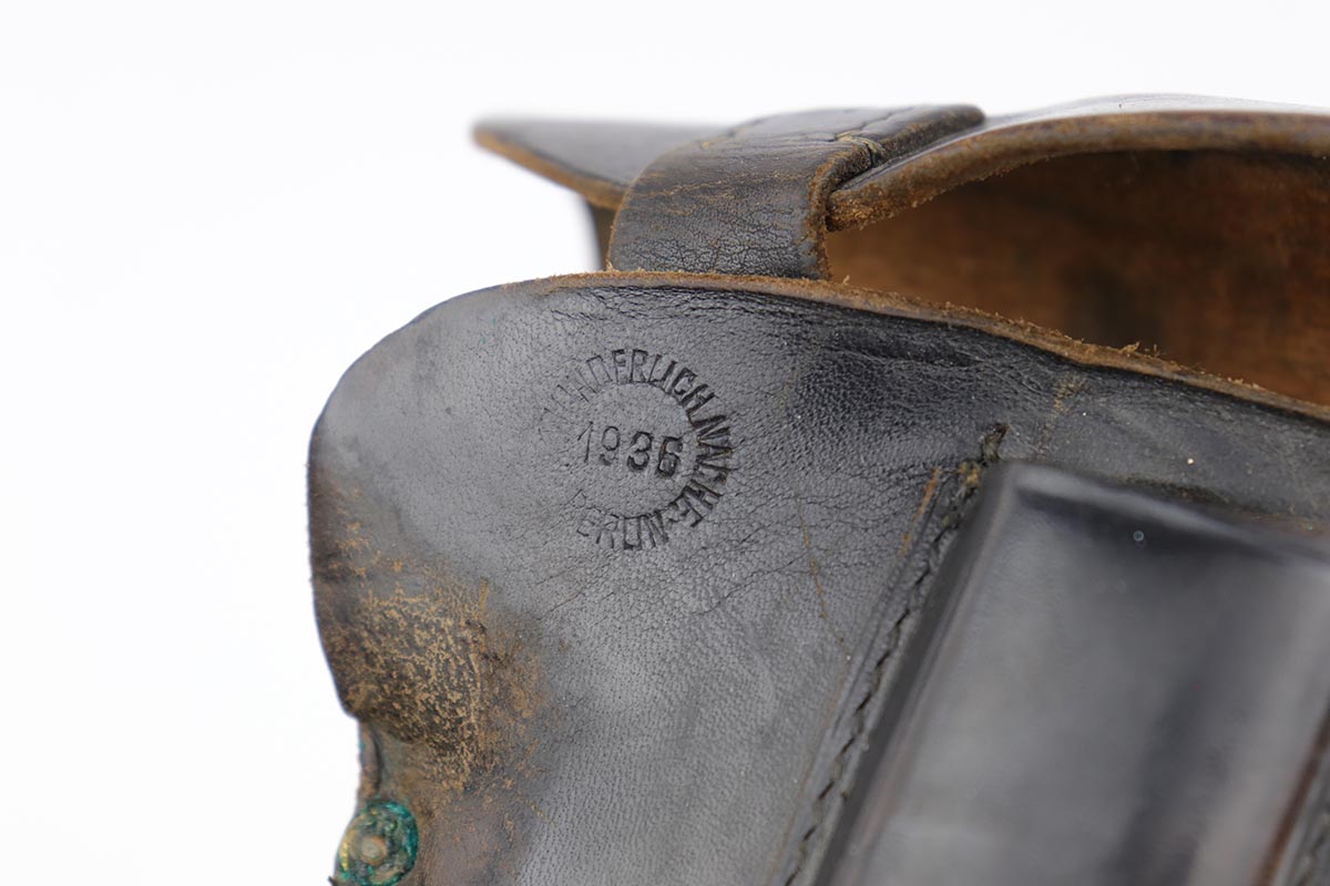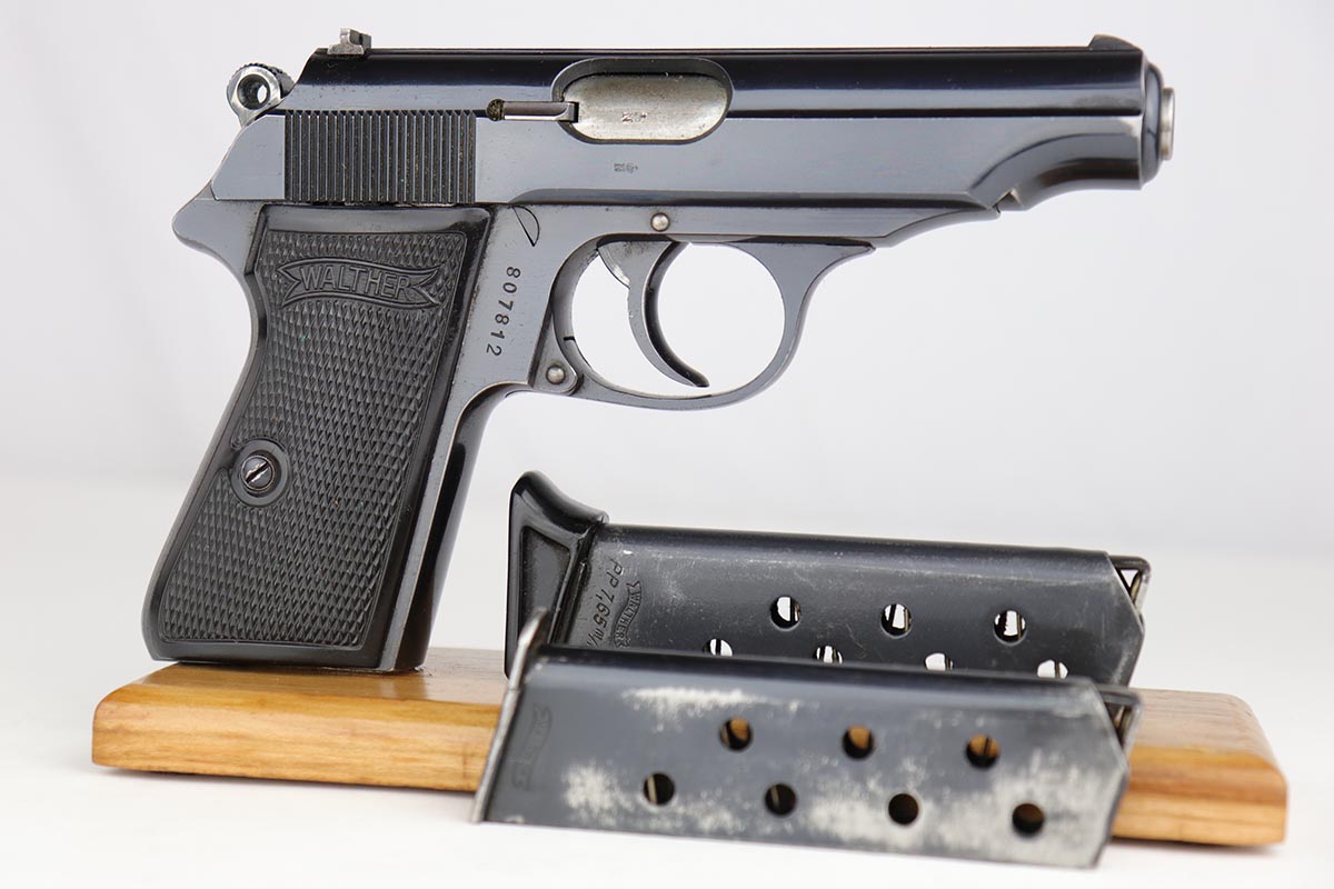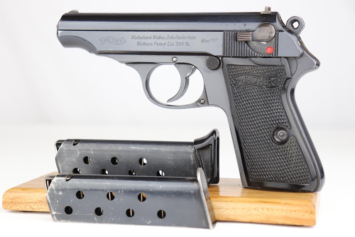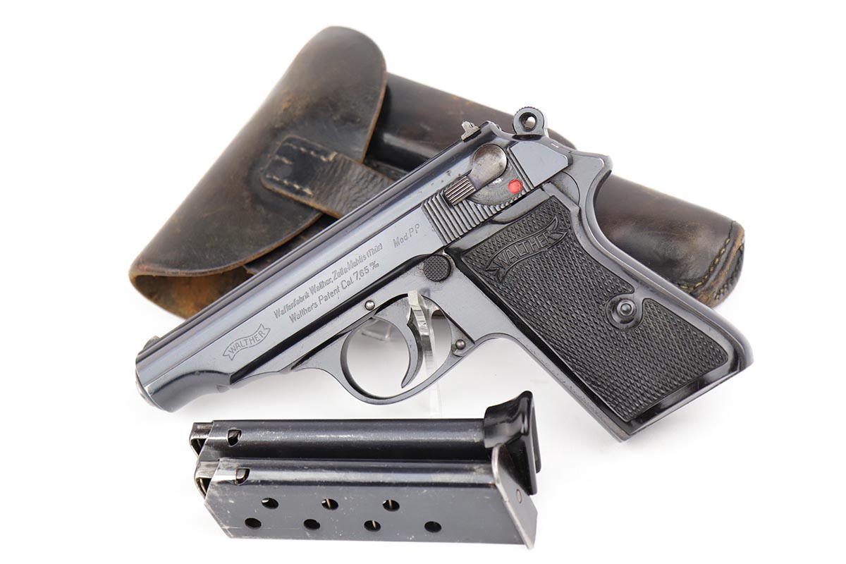 5/9/19 – This is a very nice example of a complete, early Walther PP rig at a very reasonable price. Made in about 1933, the pistol retains 97% high-polish blue, with minimal finish loss at the edges from being in a holster, but some notable oxidation on the straps. Early 90 degree safety. Very nice grips, with minor surface crack on left panel. Terrific bore. Rig includes two total magazines, one flat-bottom and one with nice finger extension. Extension does have a small chip in the back. Rig is completed by a 1936 dated and Berlin marked holster.