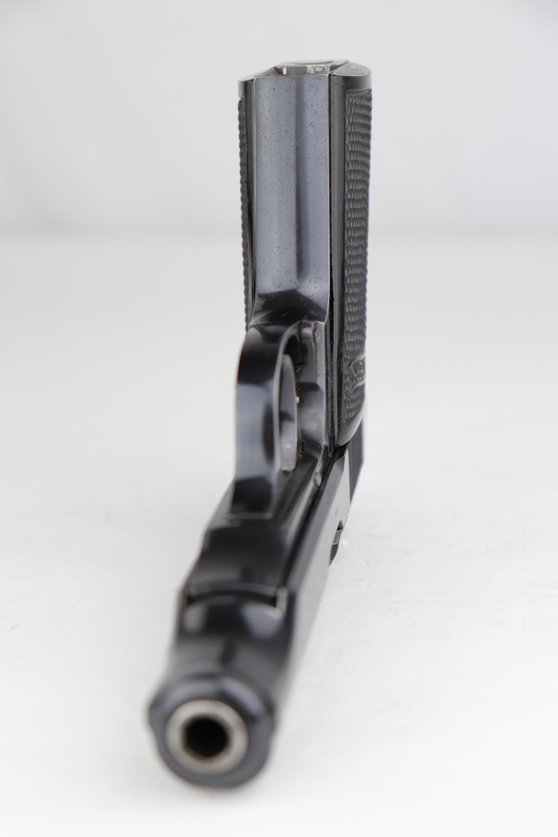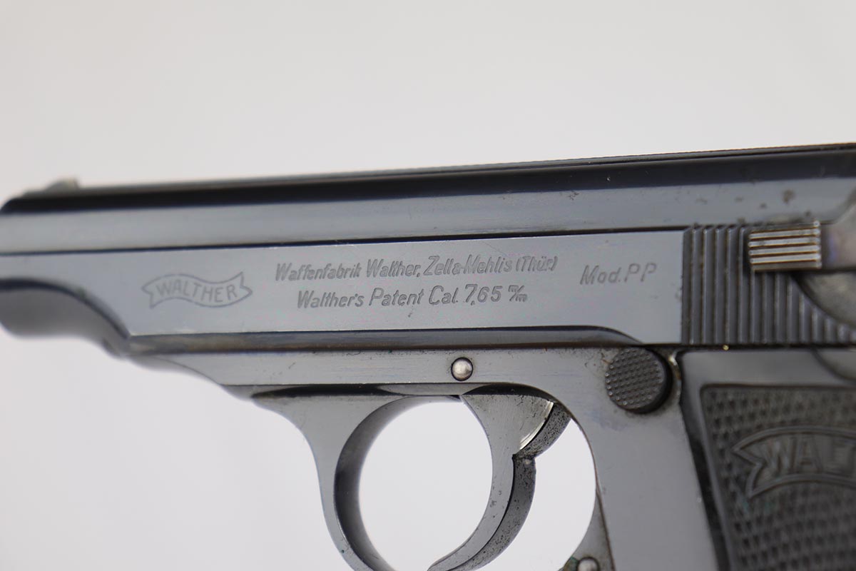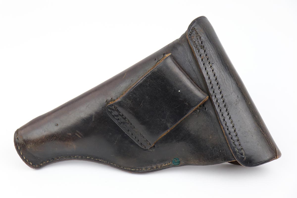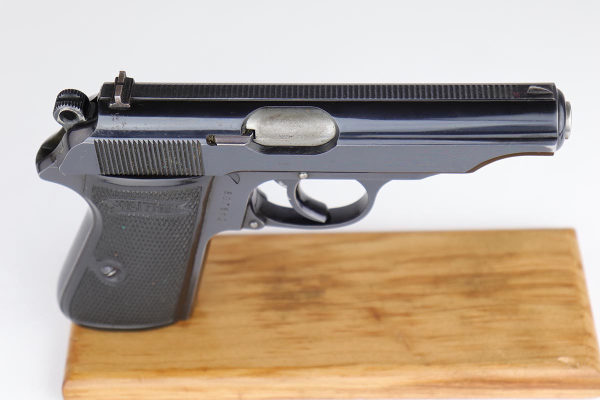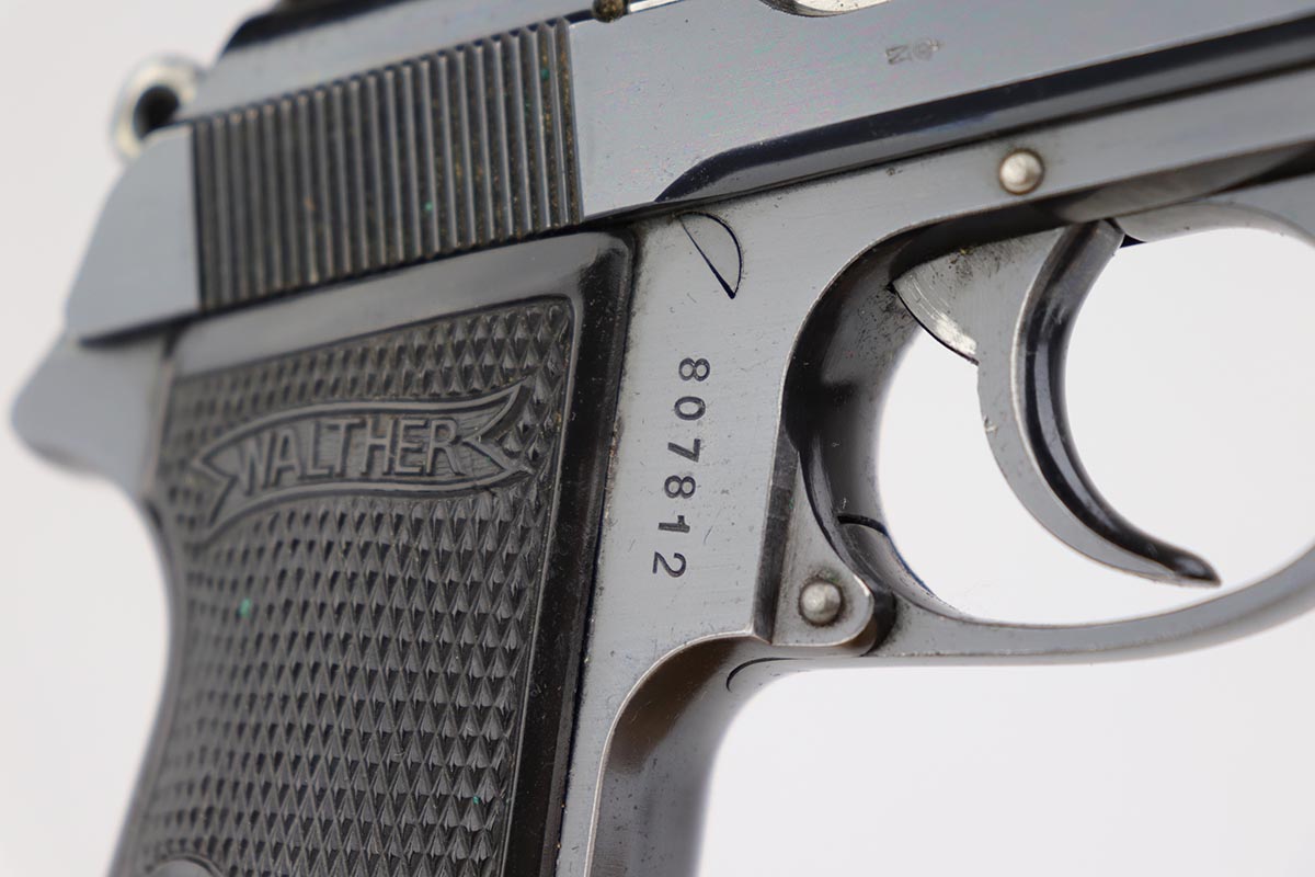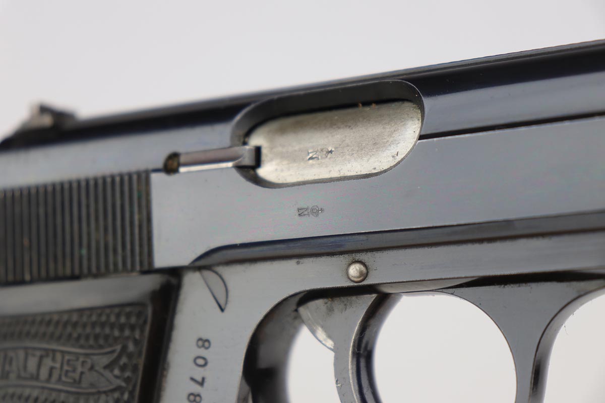 5/9/19 – This is a very nice example of a complete, early Walther PP rig at a very reasonable price. Made in about 1933, the pistol retains 97% high-polish blue, with minimal finish loss at the edges from being in a holster, but some notable oxidation on the straps. Early 90 degree safety. Very nice grips, with minor surface crack on left panel. Terrific bore. Rig includes two total magazines, one flat-bottom and one with nice finger extension. Extension does have a small chip in the back. Rig is completed by a 1936 dated and Berlin marked holster.