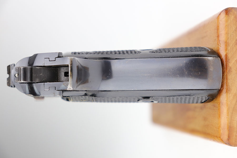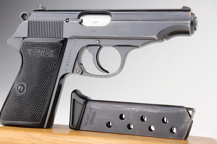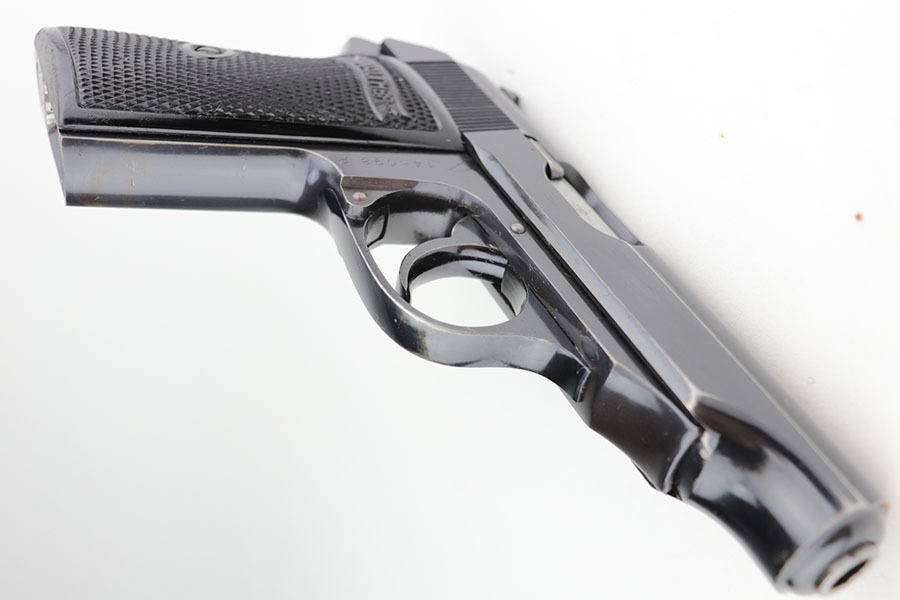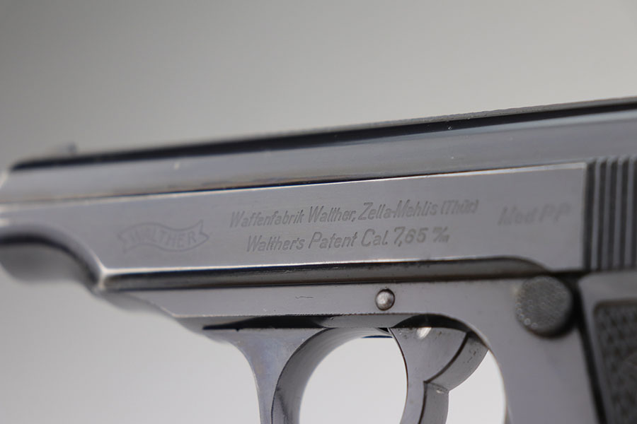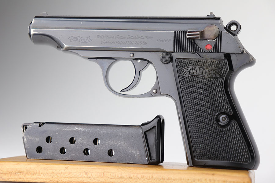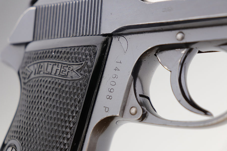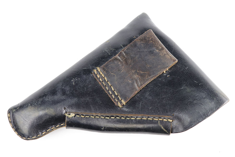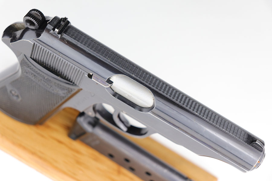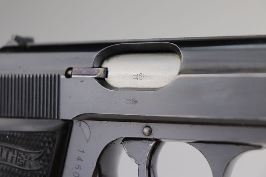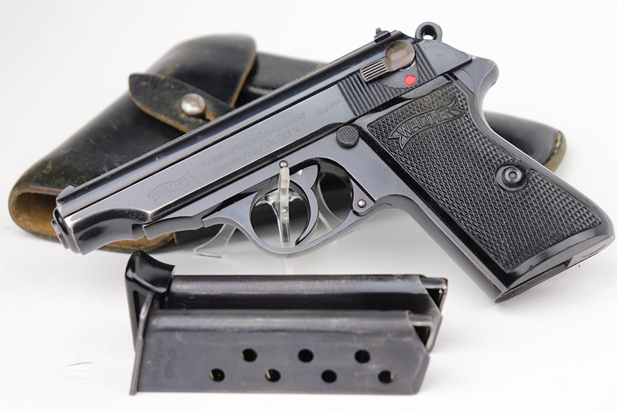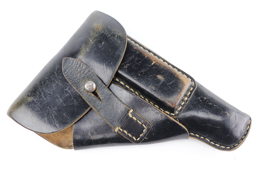 1/26/21 – This is a nice, honest example of a commercial Walther PP rig from 1939 with holster and spare magazine. The pistol has about 93-94% of the original, high-polish blue remaining. Excellent profile view with most of the wear and patina on the straps. Minty bore and excellent grips. Crown//N proofs on slide and frame. Rig includes one finger extension magazine and one flat bottom. Period, unmarked holster has a name scratched into the flap.