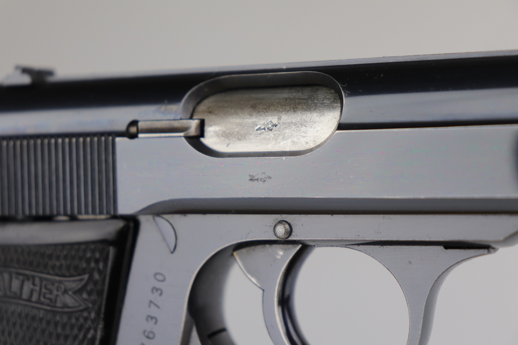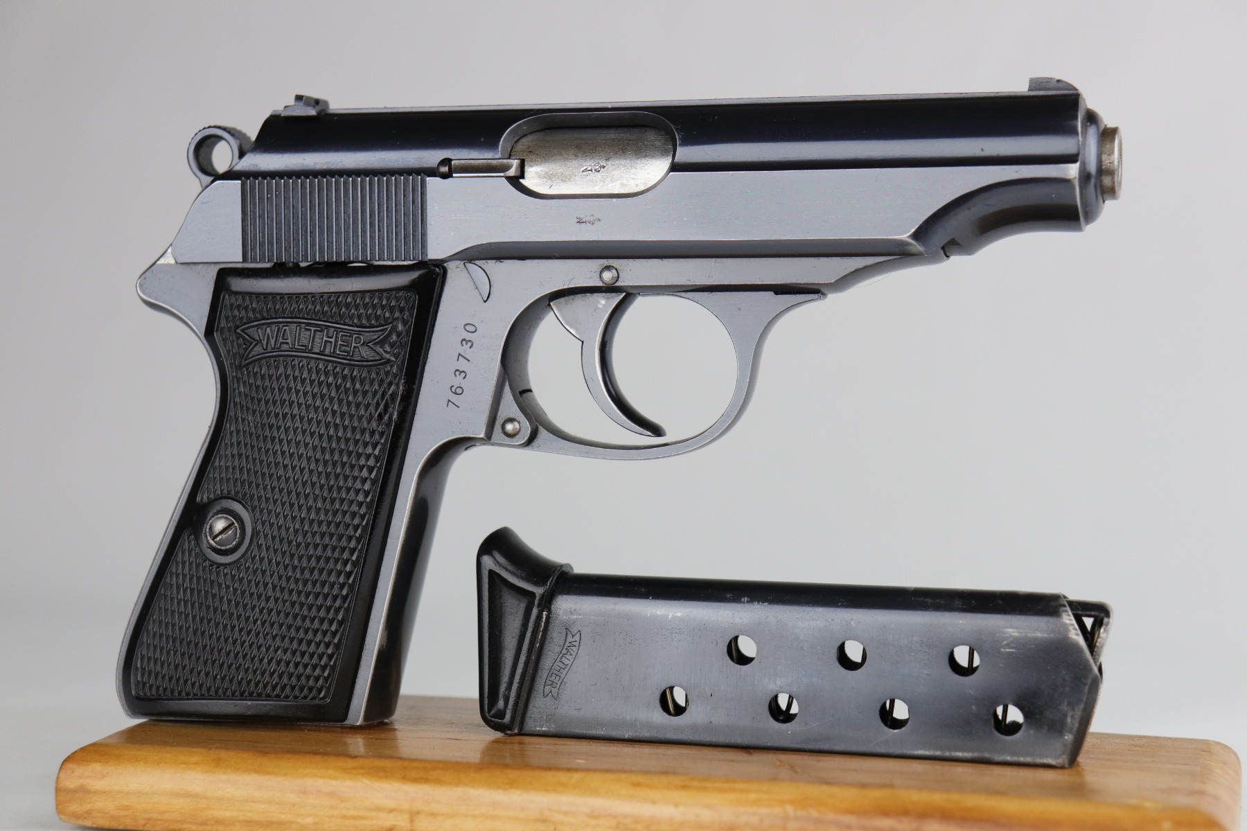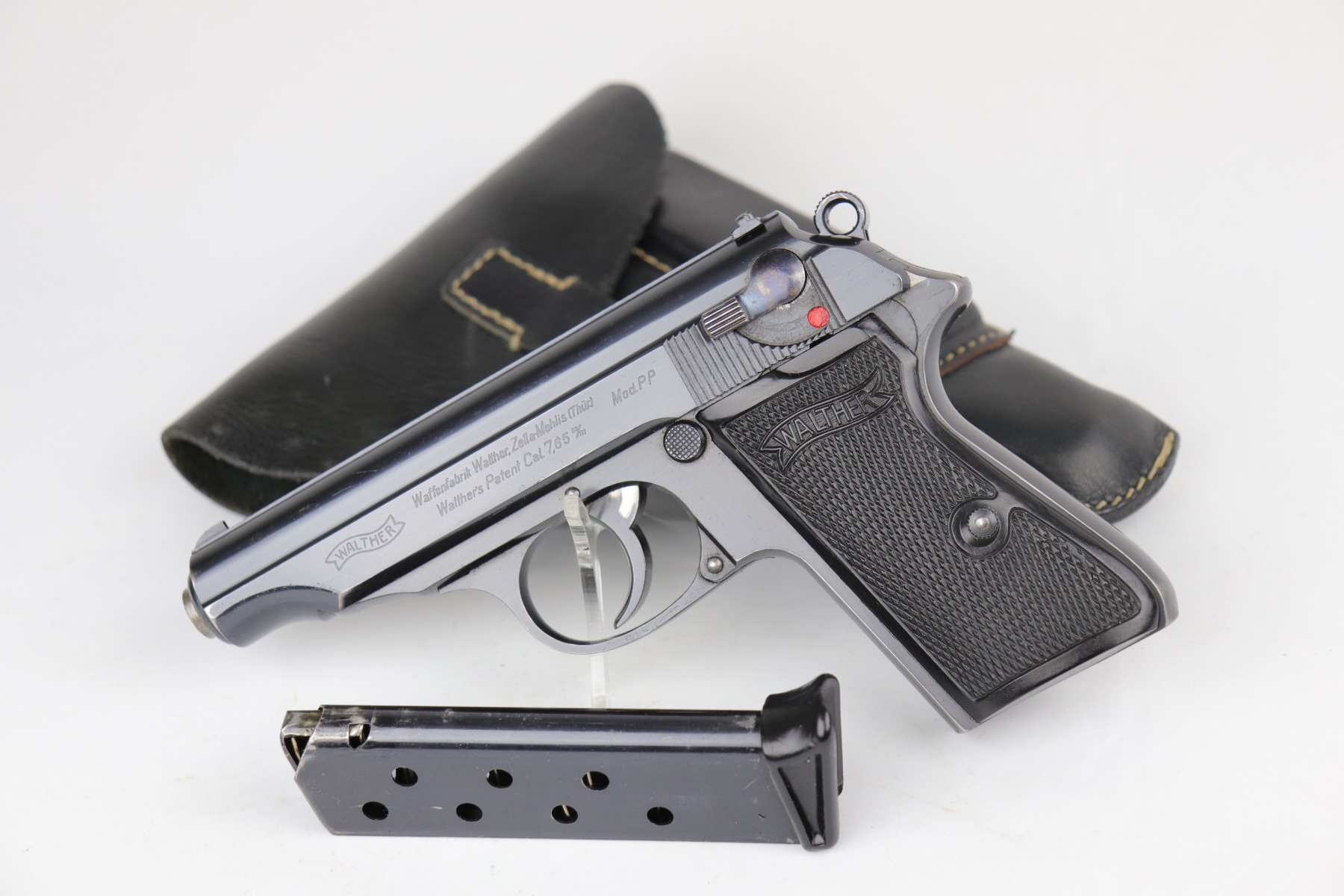 7/28/20 – This is a WW2-era commercial Walther PP rig made in about 1931. The slide and ejection port are marked with “Crown N” proofs. The gun has retained about 90% of its original bluing. Most of the wear is areas of wear on the straps. There is also very minor muzzle and high edge wear. The bore is very nice – shiny with strong rifling. Excellent original grips. It comes with a correct banner-only finger extension magazine and an unmarked black leather holster.