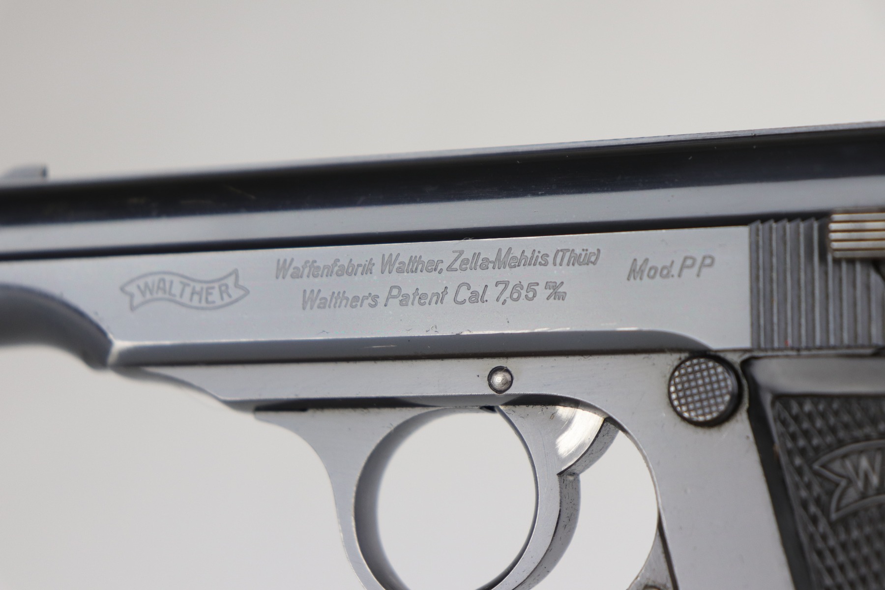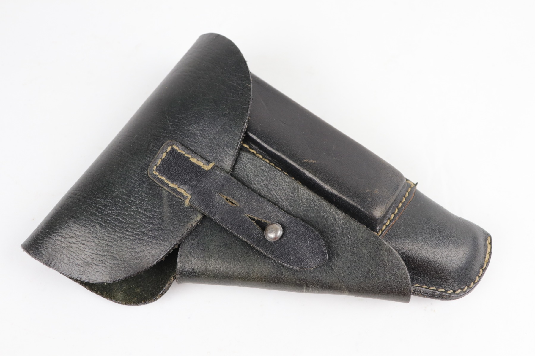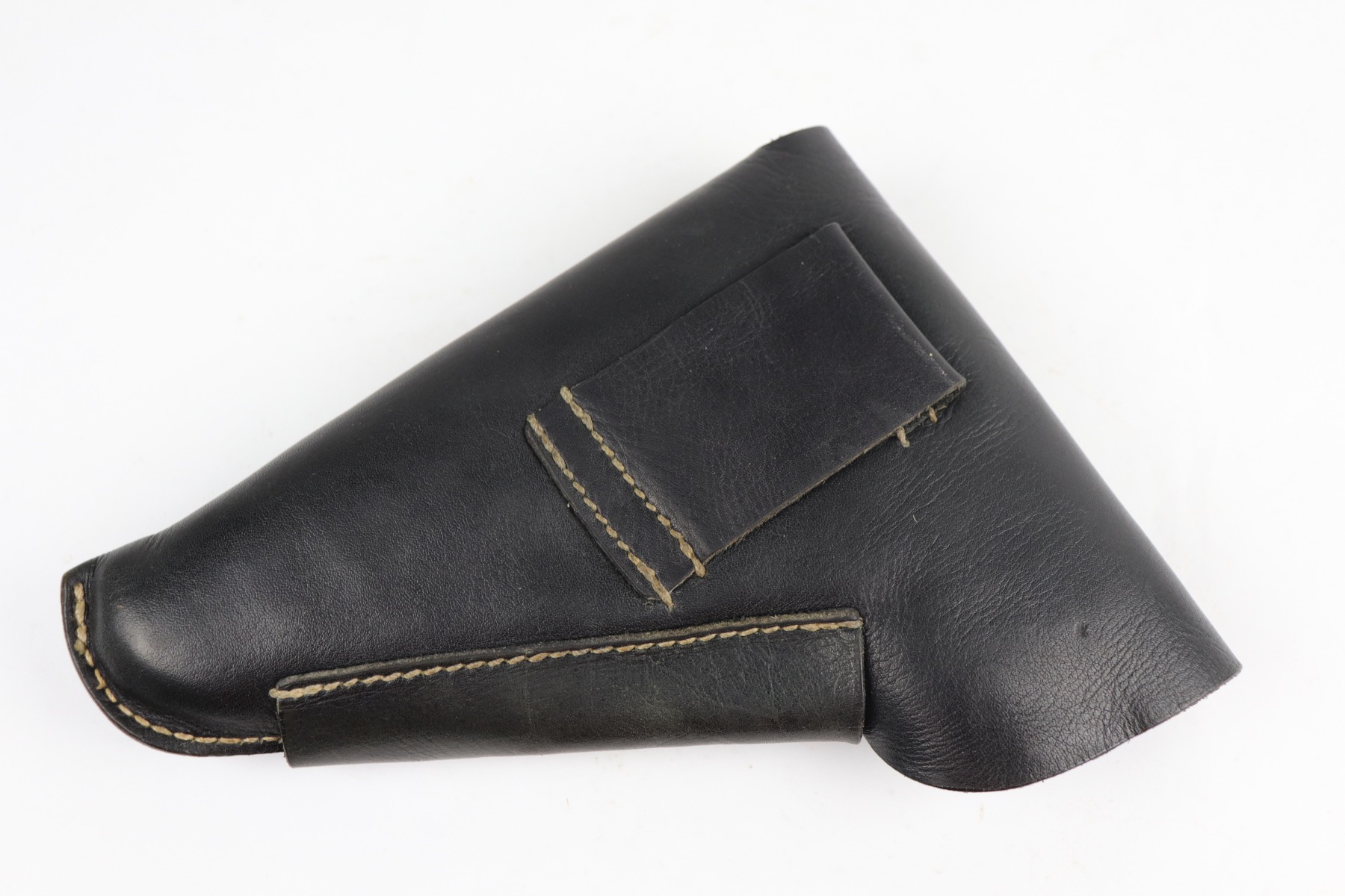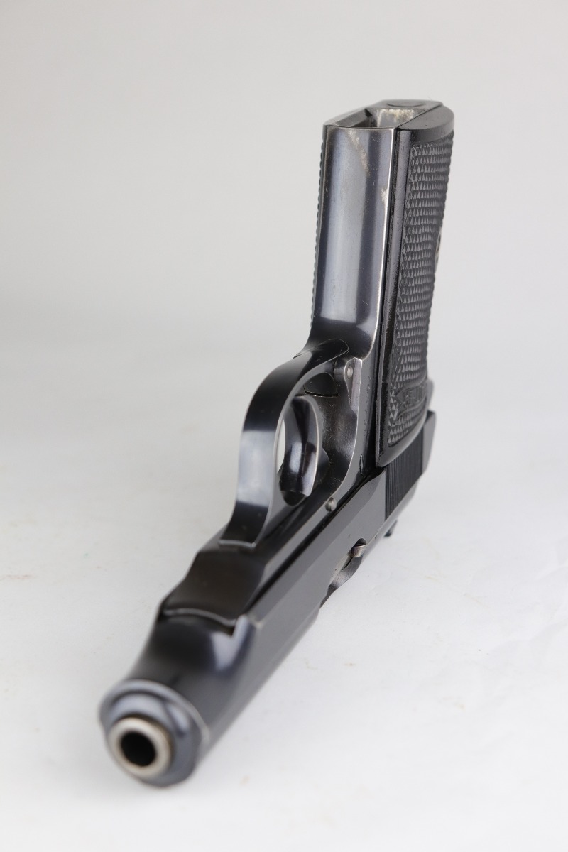 7/28/20 – This is a WW2-era commercial Walther PP rig made in about 1931. The slide and ejection port are marked with “Crown N” proofs. The gun has retained about 90% of its original bluing. Most of the wear is areas of wear on the straps. There is also very minor muzzle and high edge wear. The bore is very nice – shiny with strong rifling. Excellent original grips. It comes with a correct banner-only finger extension magazine and an unmarked black leather holster.