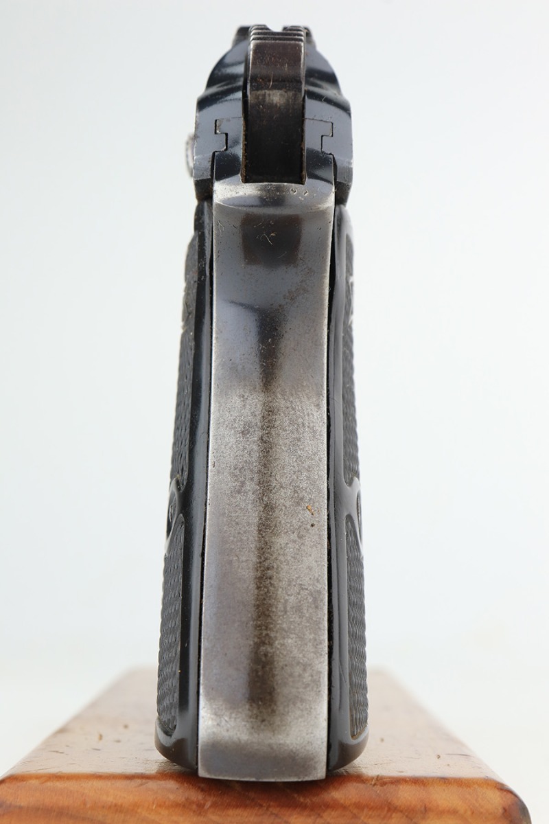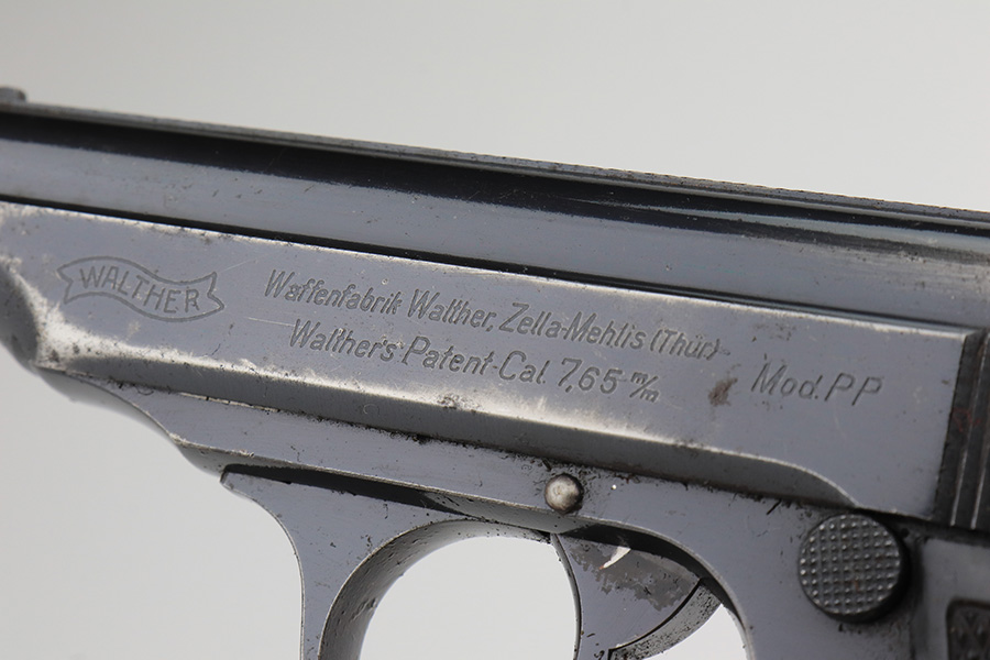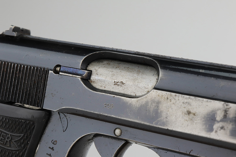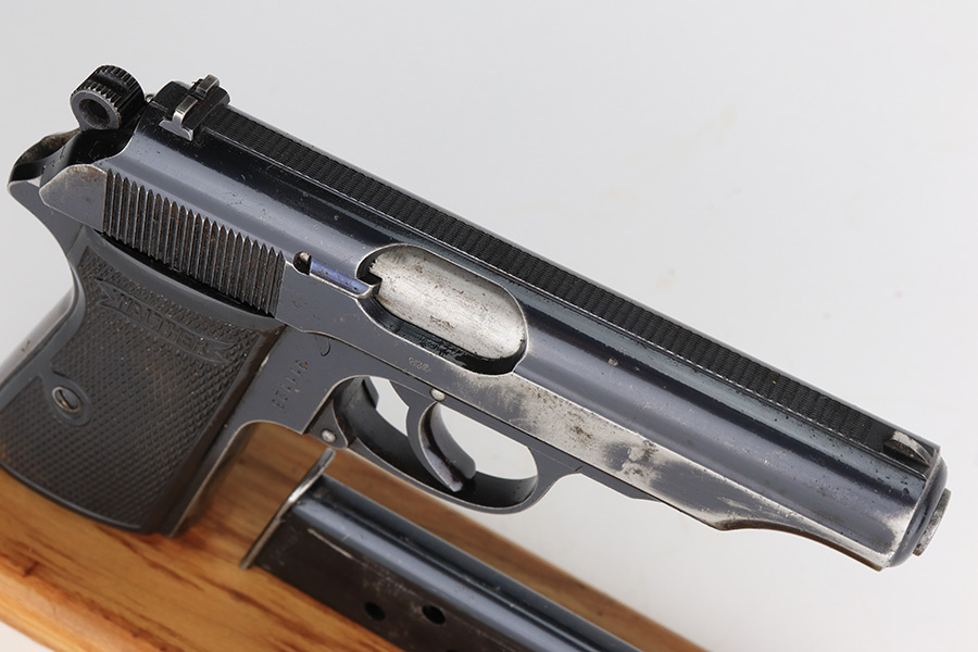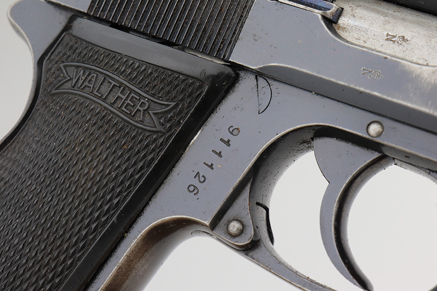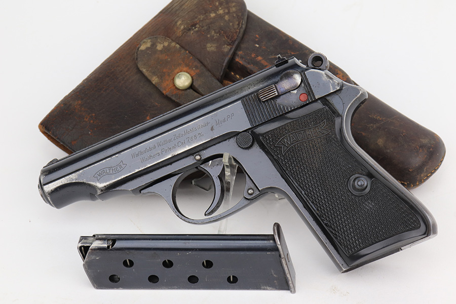 2/1/23 – This is a nice example of a Walther PP sold in the commercial market in 1935. It is all matching and has the proper “Crown N” commercial proofs. It comes as a rig with one proper Walther banner-only magazine and an Akah leather holster. The holster has seen better days – the leather is fairly dried with surface cracking throughout and some small mold spores here and there. There are what appear to be the remnants of an old sticker on the back. The gun itself has retained roughly 85% of its original high polish finish. There is finish loss and light spotty oxidation on the grip straps. An area of obvious wear on the right side of the slide. There is wear around the muzzle and along both sides of the slide, concentrated mostly around the high edges. Fitted with a pair of period-correct black bakelite grips – noticeable cracking along the left edge of the left panel. Minty bore.