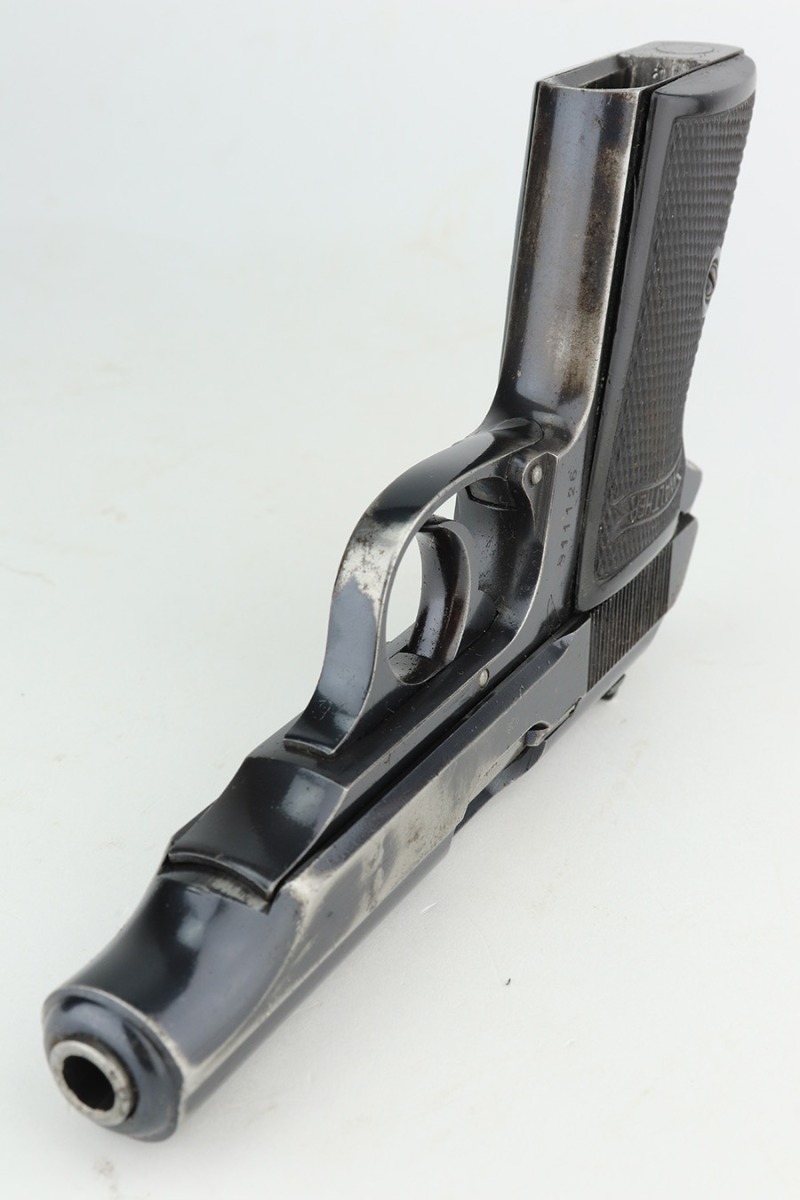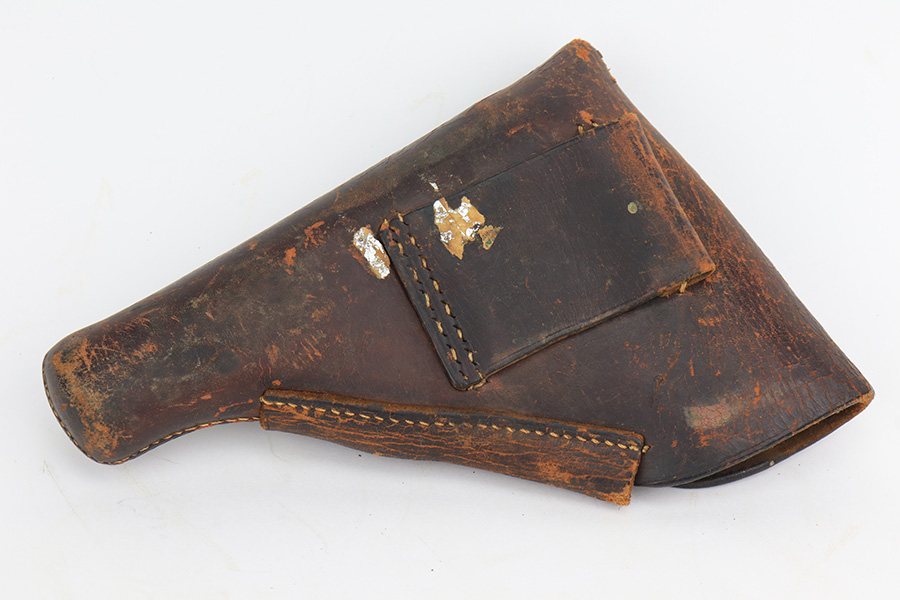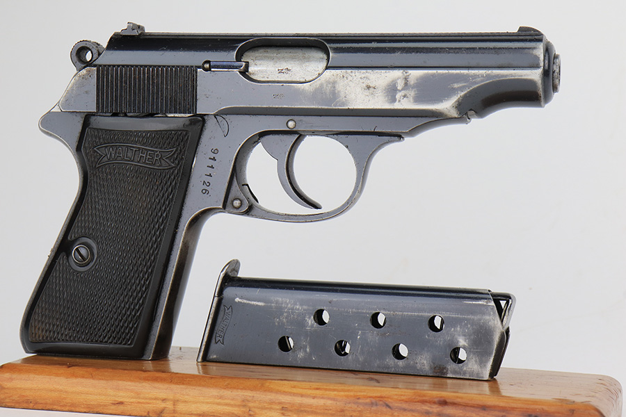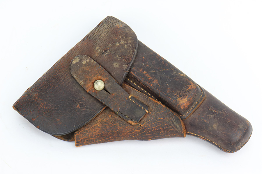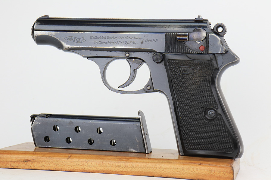 2/1/23 – This is a nice example of a Walther PP sold in the commercial market in 1935. It is all matching and has the proper “Crown N” commercial proofs. It comes as a rig with one proper Walther banner-only magazine and an Akah leather holster. The holster has seen better days – the leather is fairly dried with surface cracking throughout and some small mold spores here and there. There are what appear to be the remnants of an old sticker on the back. The gun itself has retained roughly 85% of its original high polish finish. There is finish loss and light spotty oxidation on the grip straps. An area of obvious wear on the right side of the slide. There is wear around the muzzle and along both sides of the slide, concentrated mostly around the high edges. Fitted with a pair of period-correct black bakelite grips – noticeable cracking along the left edge of the left panel. Minty bore.