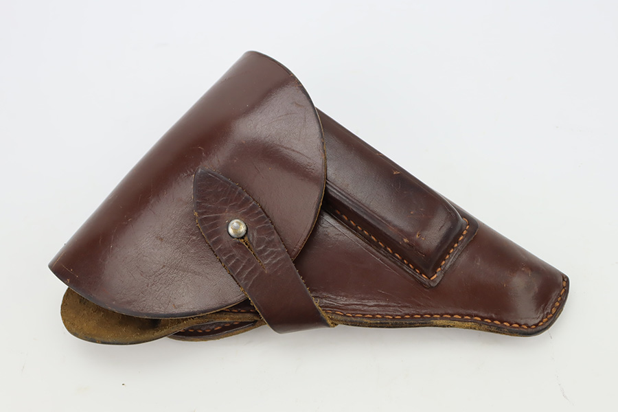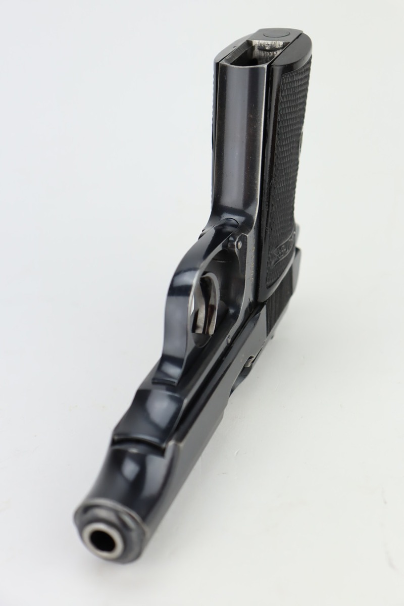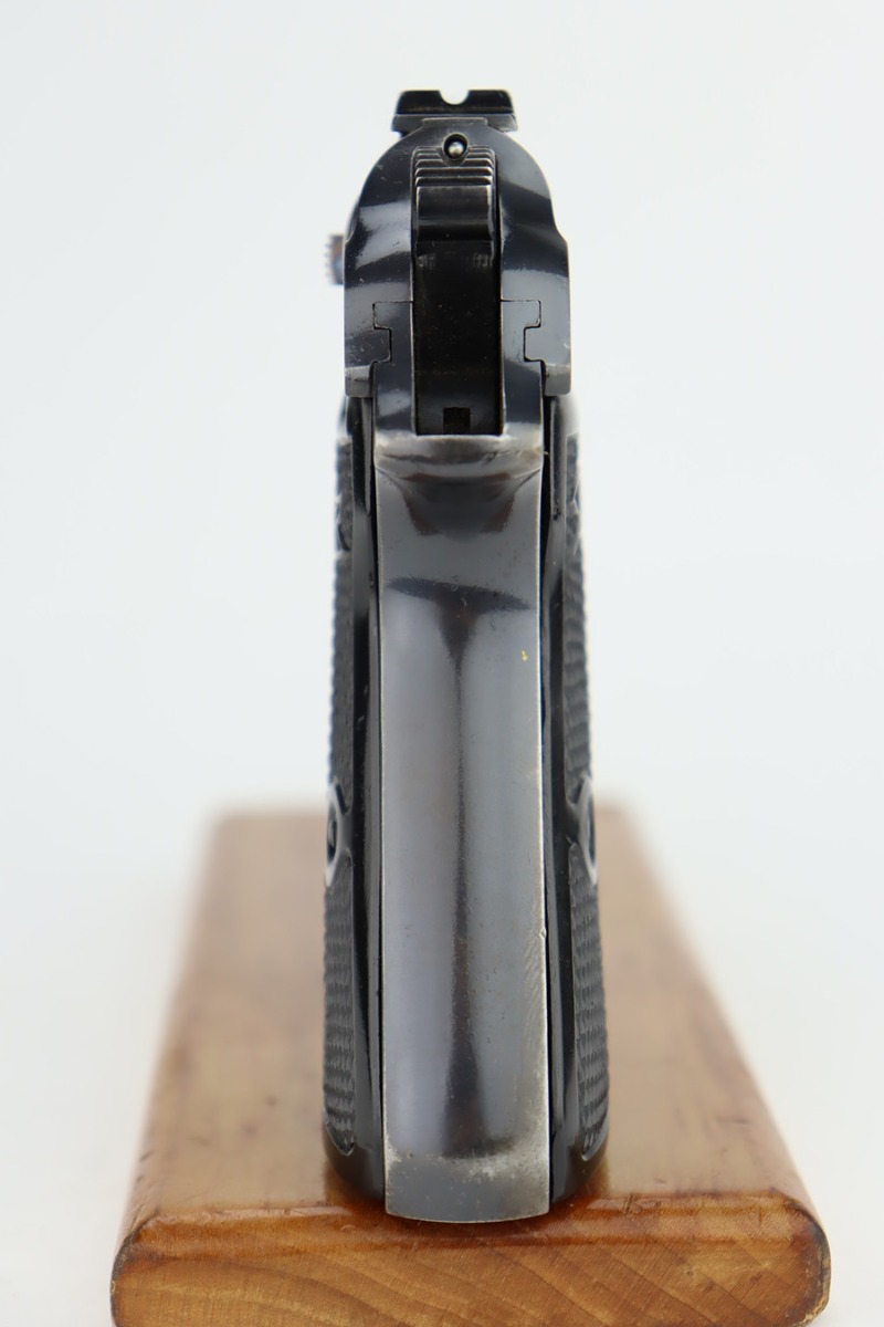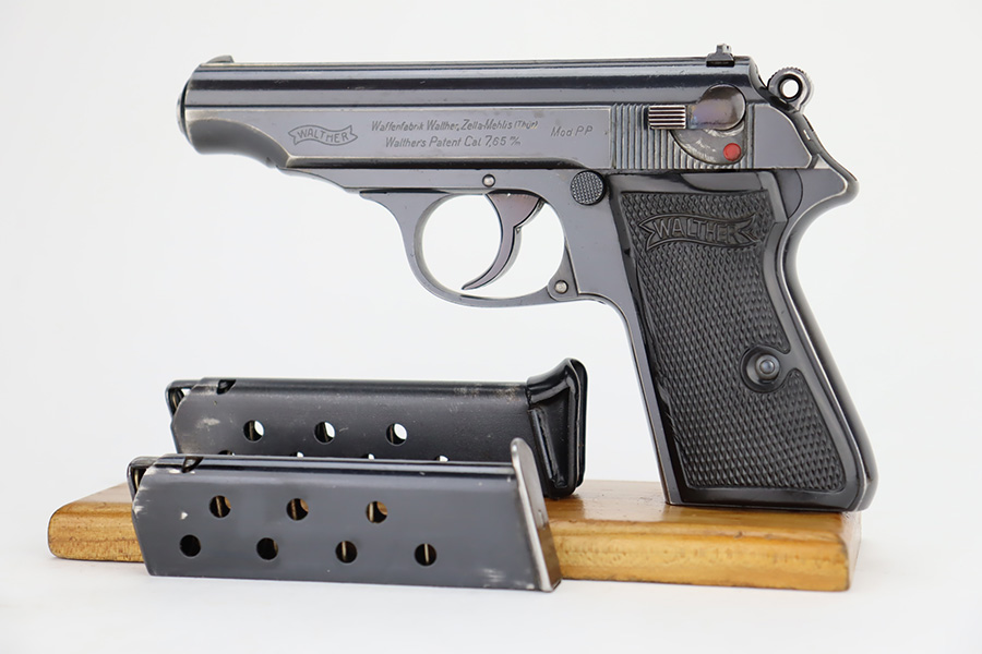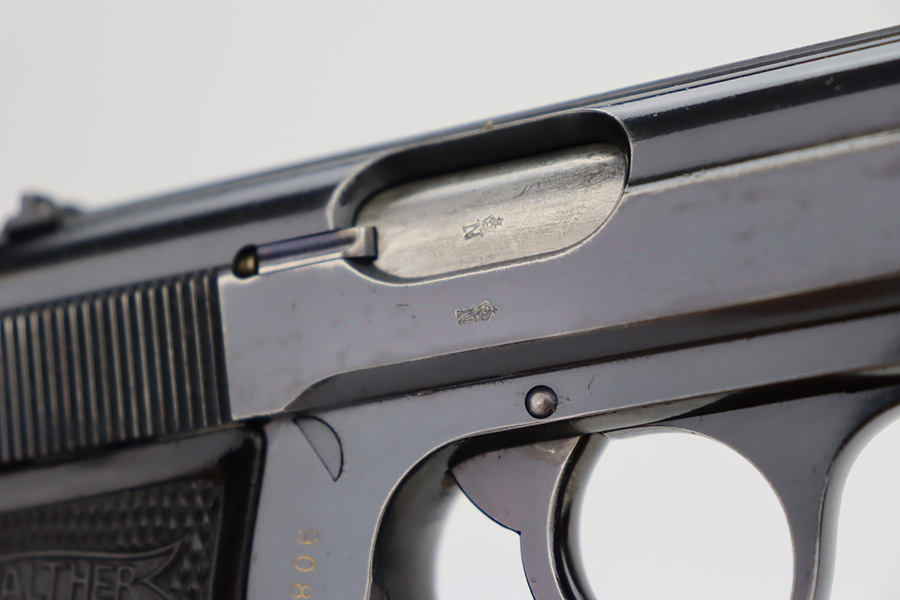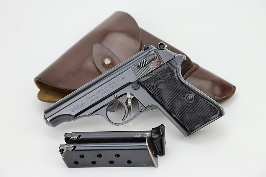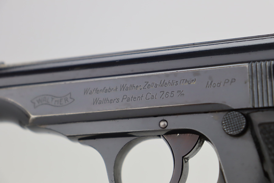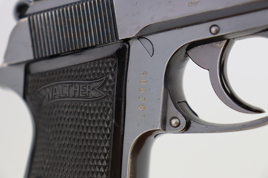 12/1/23 – This is a Walther PP sold in the commercial market in 1935. All matching with the proper “Crown N” proofs. It comes as a rig with Walther banner-only finger extension magazine, a spare flat-bottom magazine, and a post-war reproduction holster. The gun itself has retained about 94% of its original high polish finish. There is general high edge wear and some minor dulling / thinning on the grip straps. Fitted with period-correct black bakelite grips – some cracking along the edge of the left panel. Mint bore.