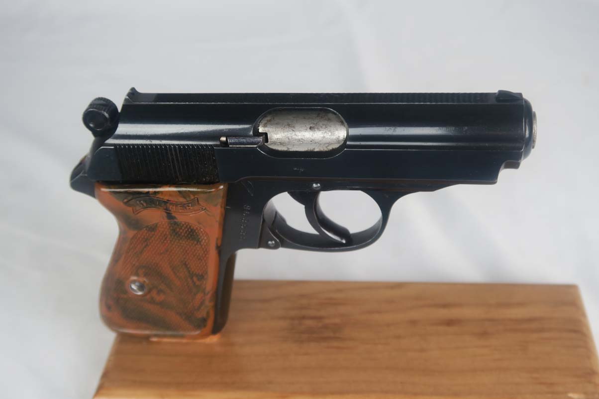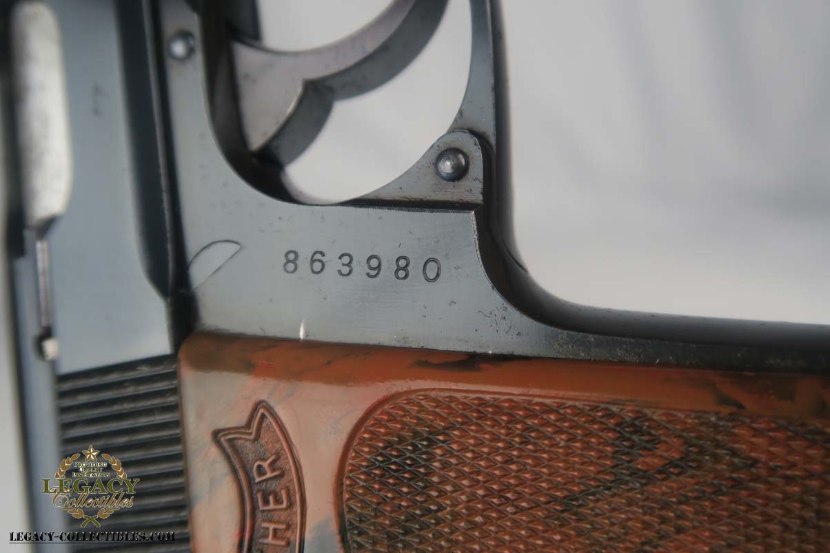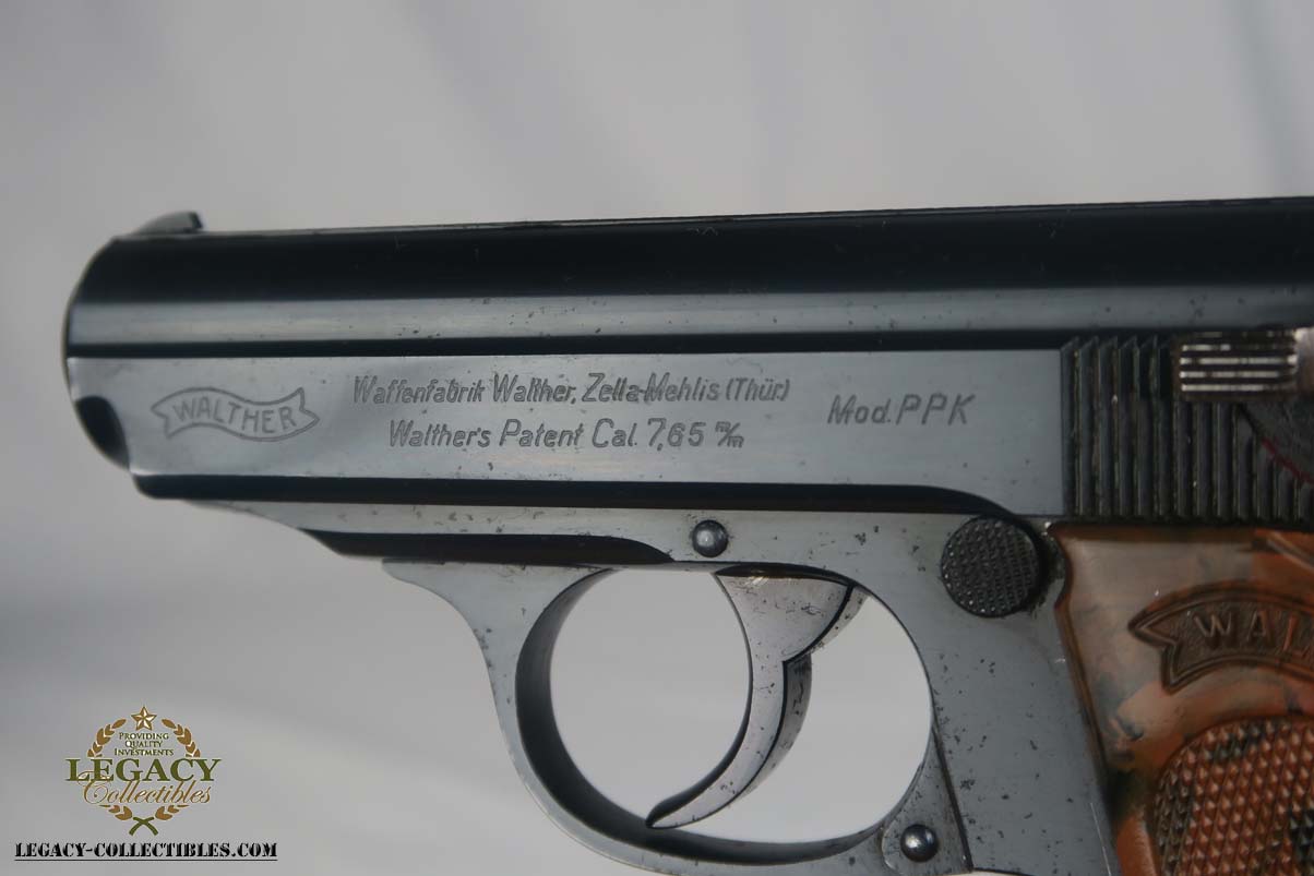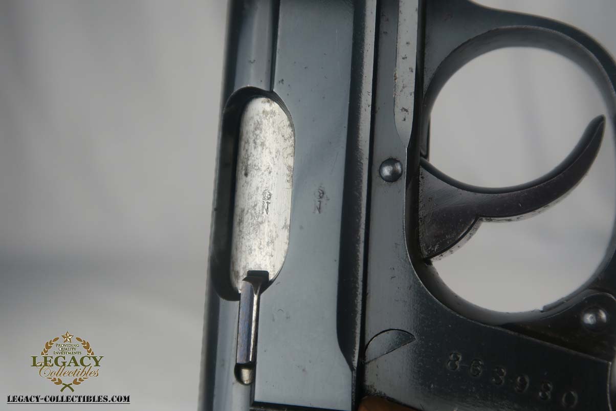 5/30/17 – This is a commercially issued Walther PPK, manufactured in 1935.  The original finish rates at about 98-99%, with minor finish loss near the muzzle.  The pistol does show some patina and pinpricking throughout though, which is reflected in the price.  Crown over N proofs on slide and frame, and slide has matching serial etched inside.  Grip is near mint, but the escutcheon turns when you try to remove the screw, so it would be difficult to take off.  Walther banner mag.  Minty bore.