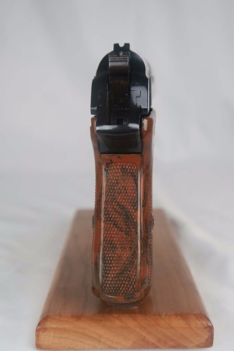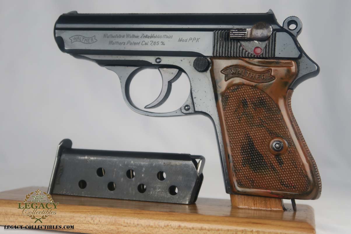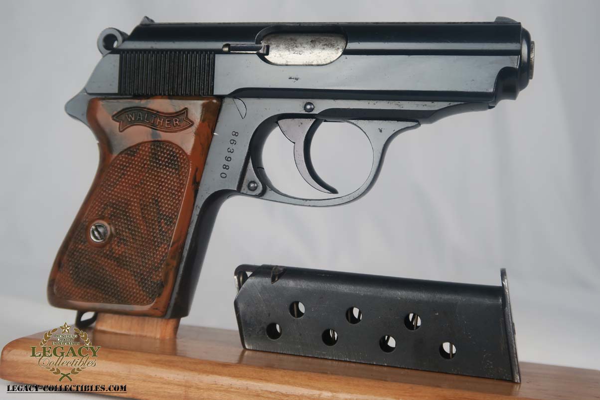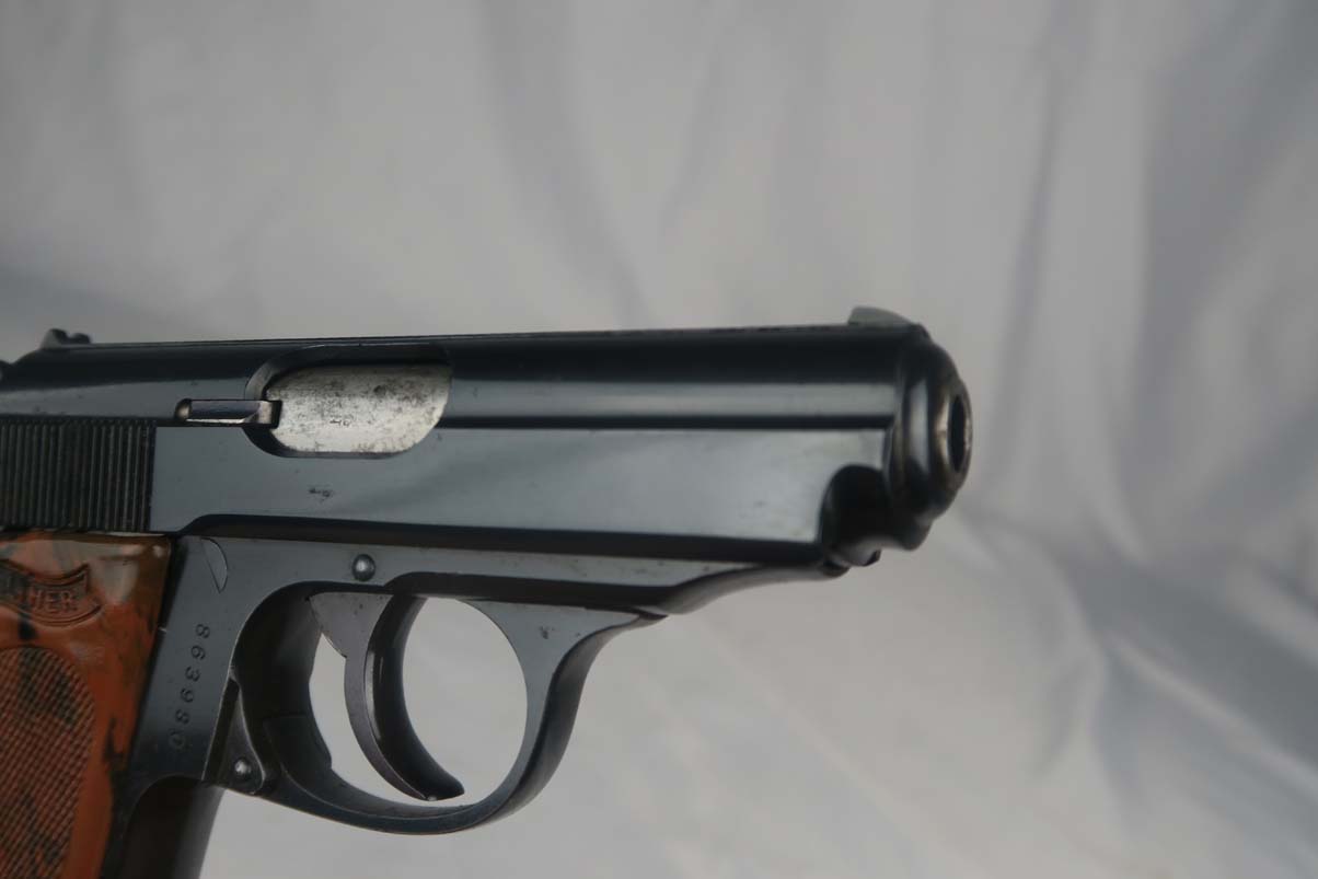 5/30/17 – This is a commercially issued Walther PPK, manufactured in 1935.  The original finish rates at about 98-99%, with minor finish loss near the muzzle.  The pistol does show some patina and pinpricking throughout though, which is reflected in the price.  Crown over N proofs on slide and frame, and slide has matching serial etched inside.  Grip is near mint, but the escutcheon turns when you try to remove the screw, so it would be difficult to take off.  Walther banner mag.  Minty bore.
