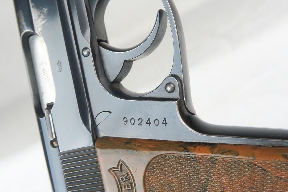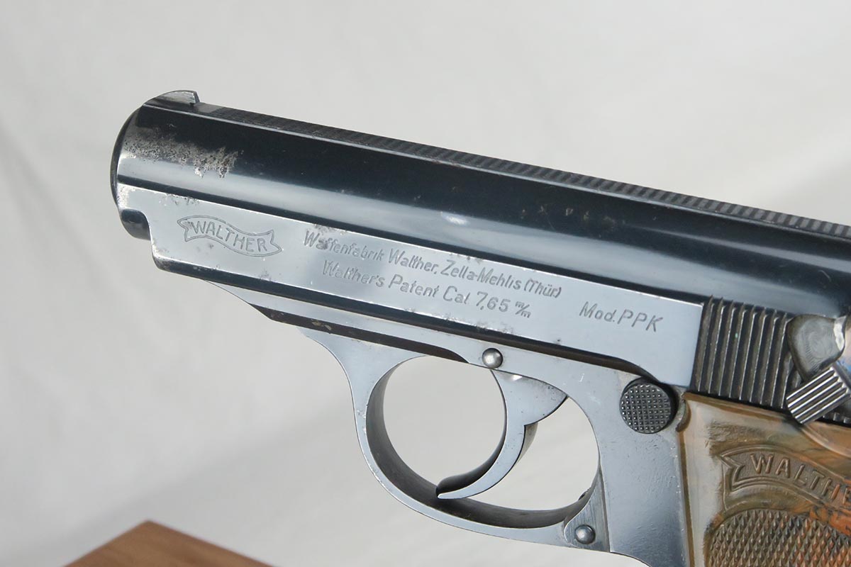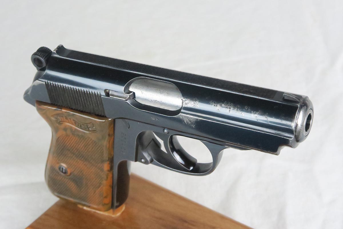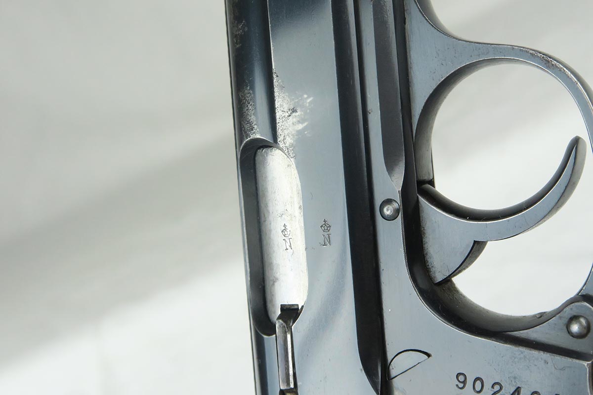 1/8/18 – This is a pre-WW2 Walther PPK, in all original condition.  The bluing rates at about 90% with most of the wear on the rounded portion of either side of the slide.  There is also some minor pitting in both of those areas.  Serial dates this pistol to 1935, and it has early features such as the 90 degree safety and Crown/N proofs.  Excellent grip and finger extension magazine, both of which have no major cracks or chips.  Bore is shiny and shows only minor use.
