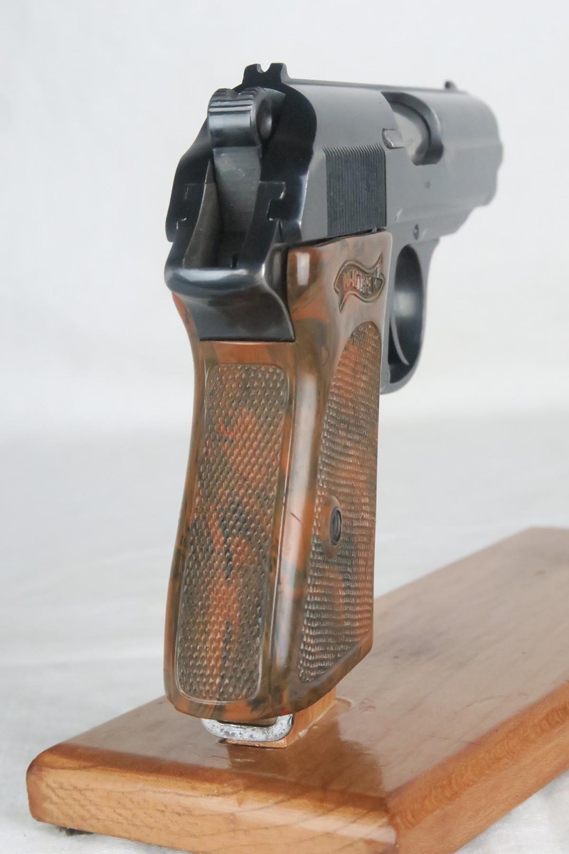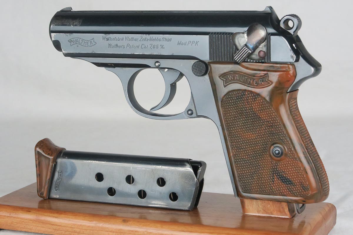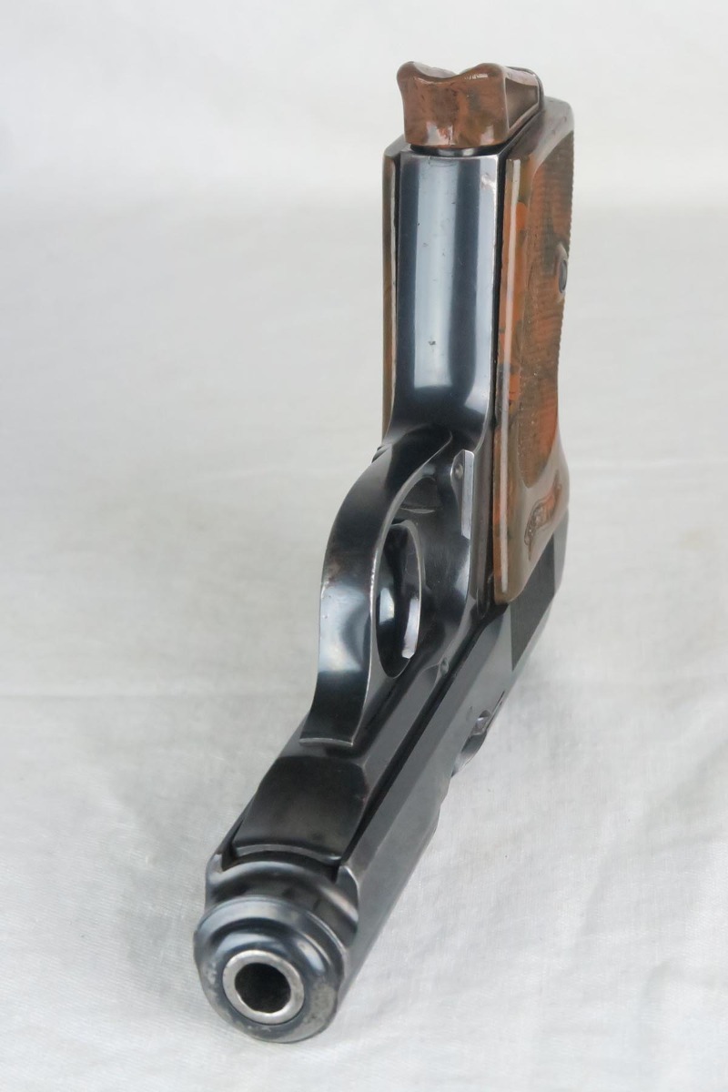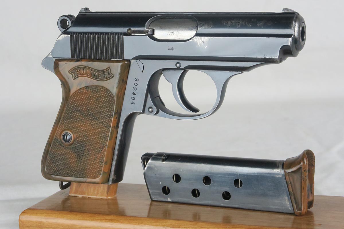 1/8/18 – This is a pre-WW2 Walther PPK, in all original condition.  The bluing rates at about 90% with most of the wear on the rounded portion of either side of the slide.  There is also some minor pitting in both of those areas.  Serial dates this pistol to 1935, and it has early features such as the 90 degree safety and Crown/N proofs.  Excellent grip and finger extension magazine, both of which have no major cracks or chips.  Bore is shiny and shows only minor use.
