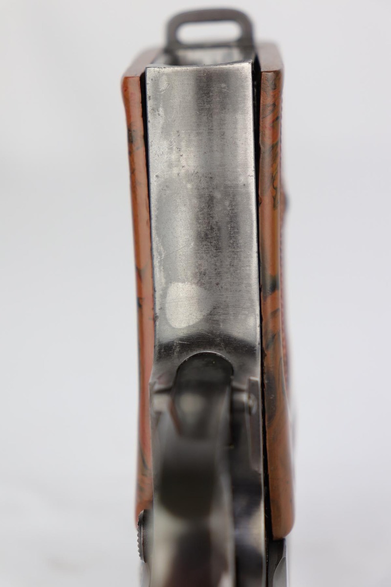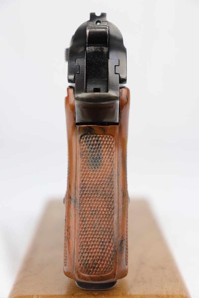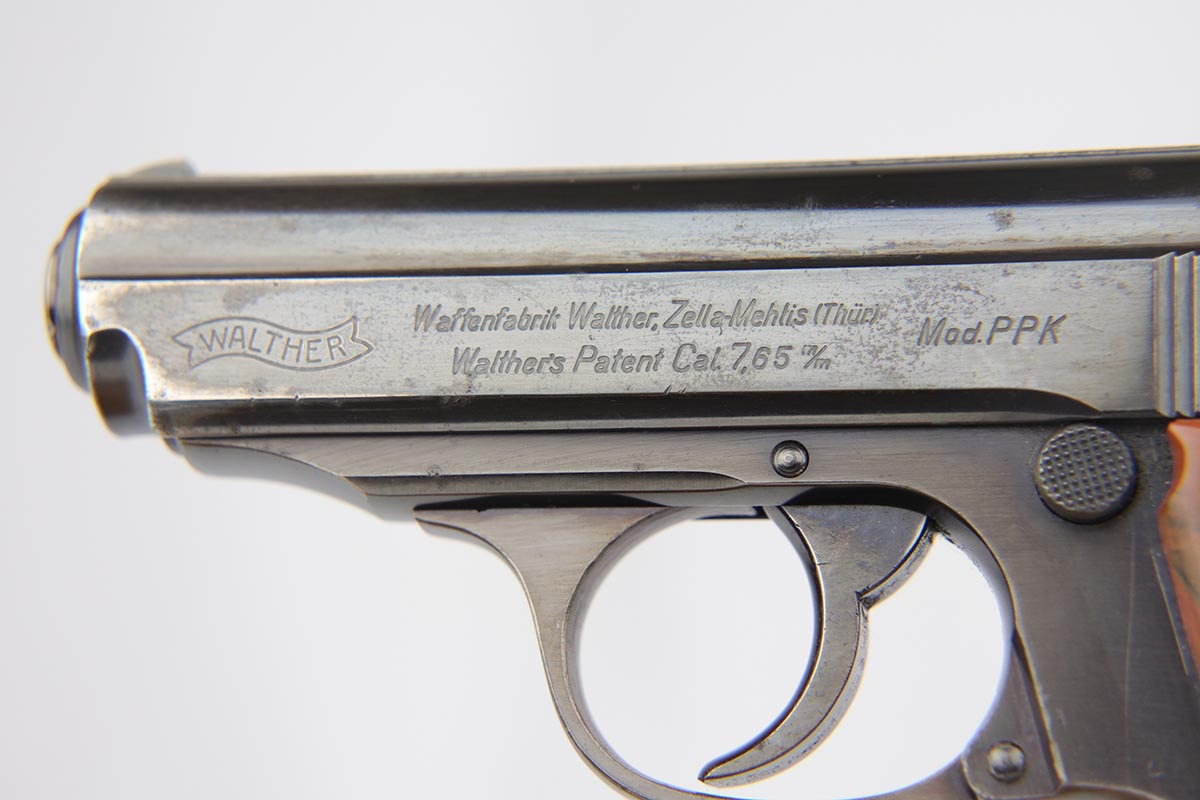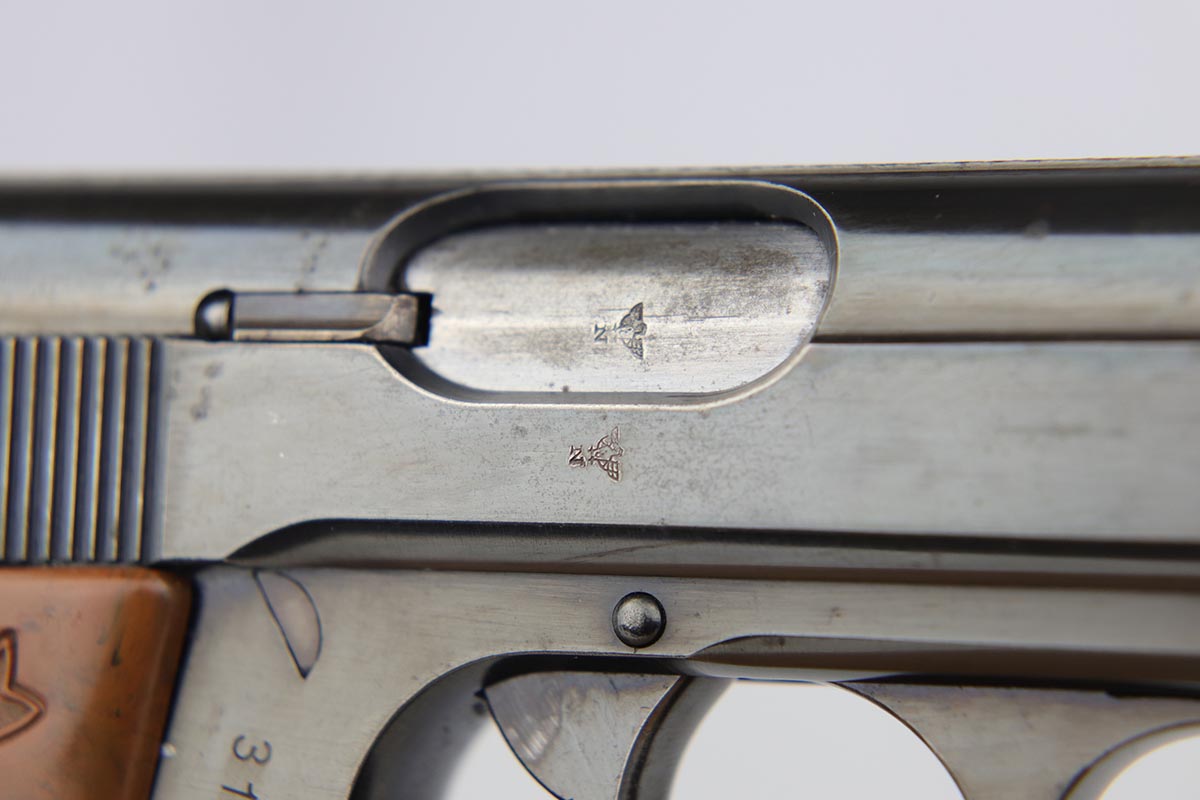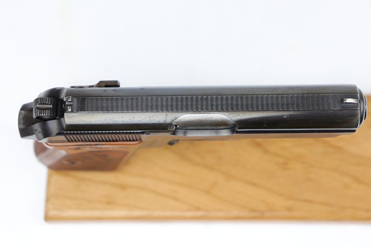 11/21/18 – This is a wartime commercial Walther PPK from the Nazi era. All original and correct with 80-85% original high-polish blue. The slide is very nice with basic muzzle wear, but the front strap is missing most of the finish. Excellent grip with no cracks or chips. Wartime magazine. Shiny, strong bore that would make this one a good shooting candidate.