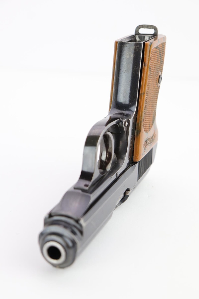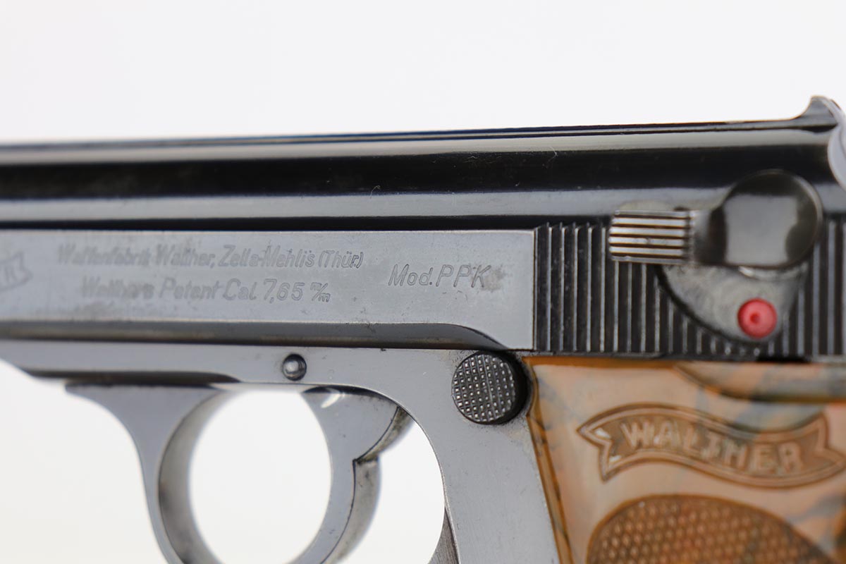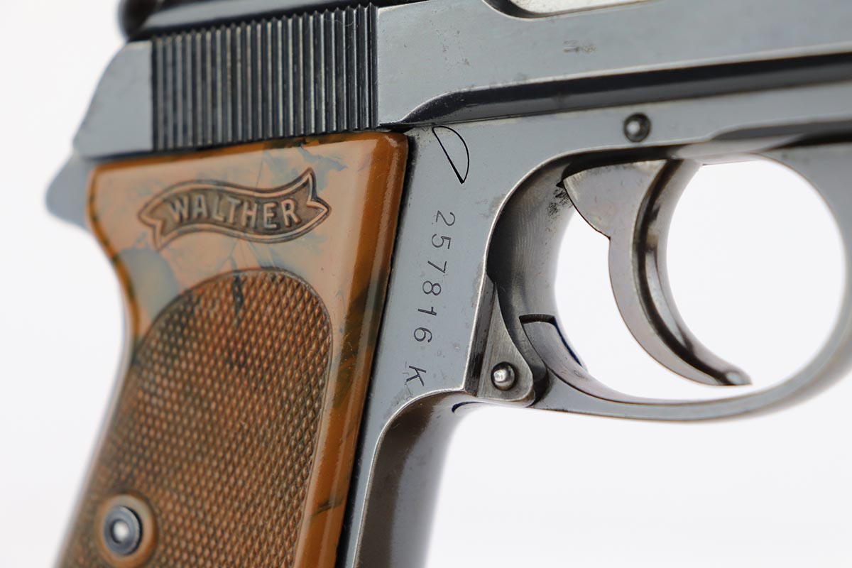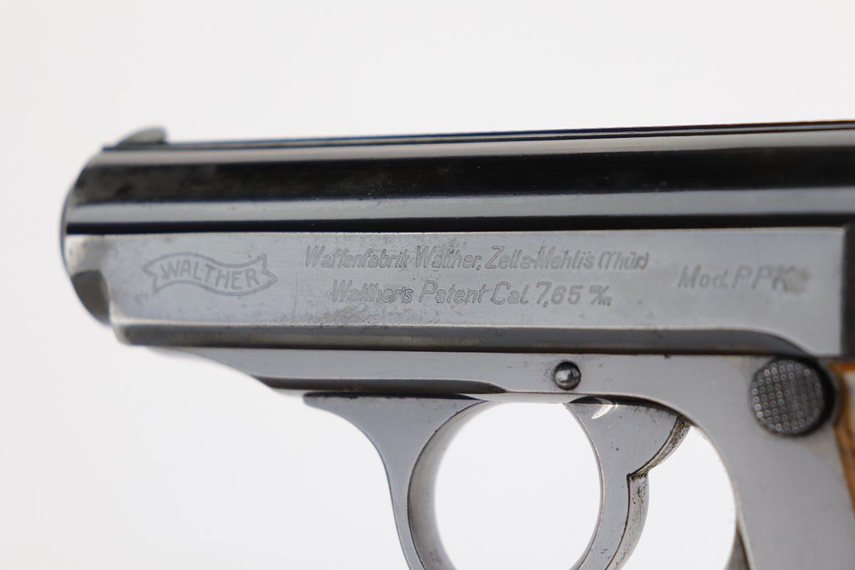 2/13/20 – This is a matching and original Walther PPK that was made for the German commercial market in 1939-40. The high-polish blue rates at about 90% with areas of thinning on the front strap, trigger guard, forward portion of left side slide, and rear portion of right side. Terrific bore and good mechanics, so this one could make a good shooter. Small surface crack on right side of grip. Banner only magazine.