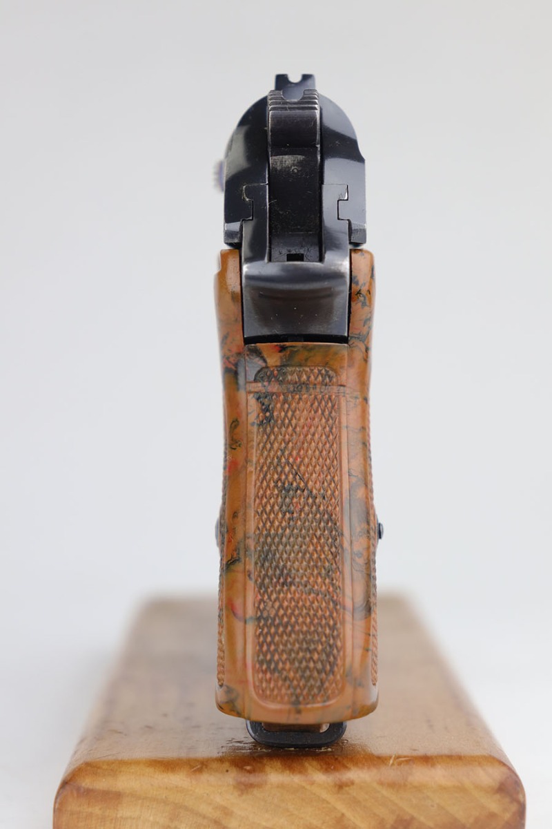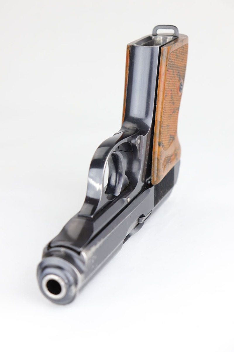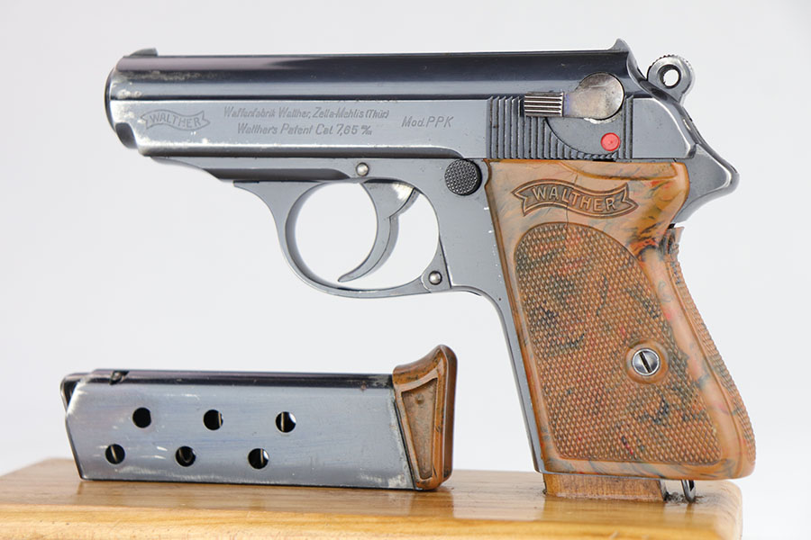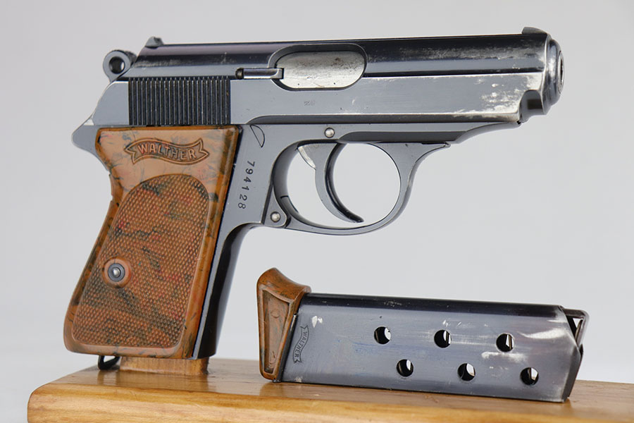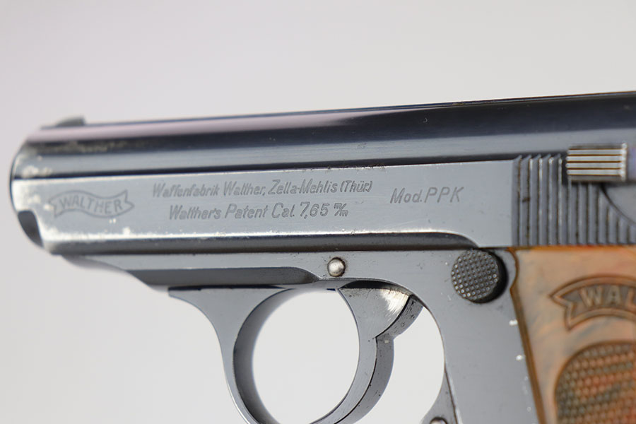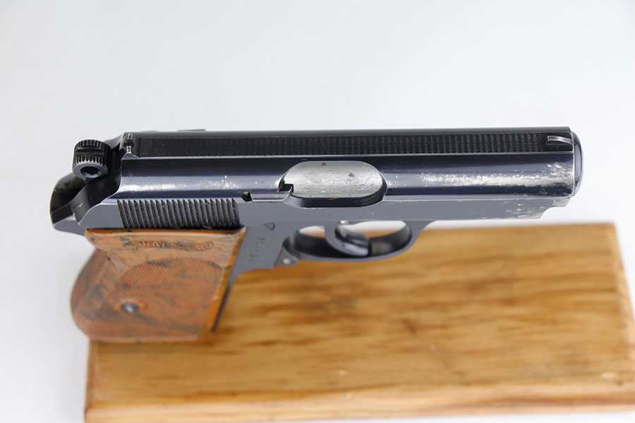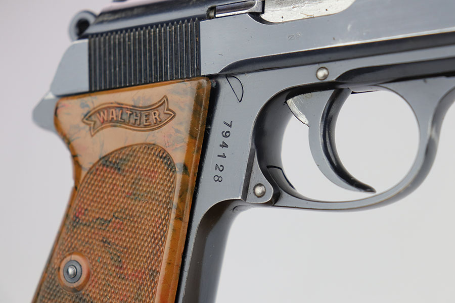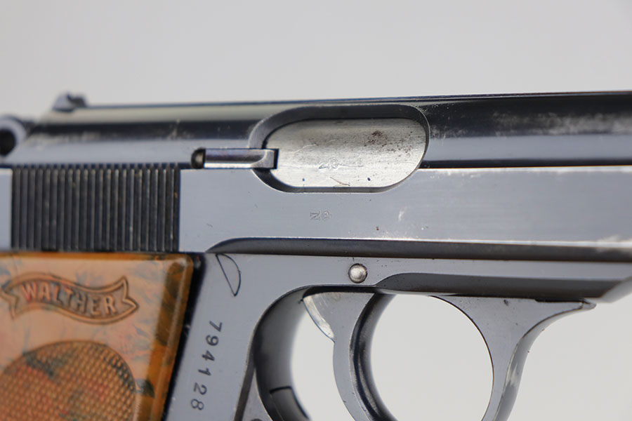 5/14/20 – This is an early and original commercial Walther PPK from about 1933. The gun has about 5% bluing loss on each side of the slide, generally near the muzzle from being inside a holster. Frame bluing is in fantastic condition. Terrific bore and excellent finger extension magazine. Early 90 degree safety. Grip has one or two small surface cracks, and the spine has a thin gouge in it.
