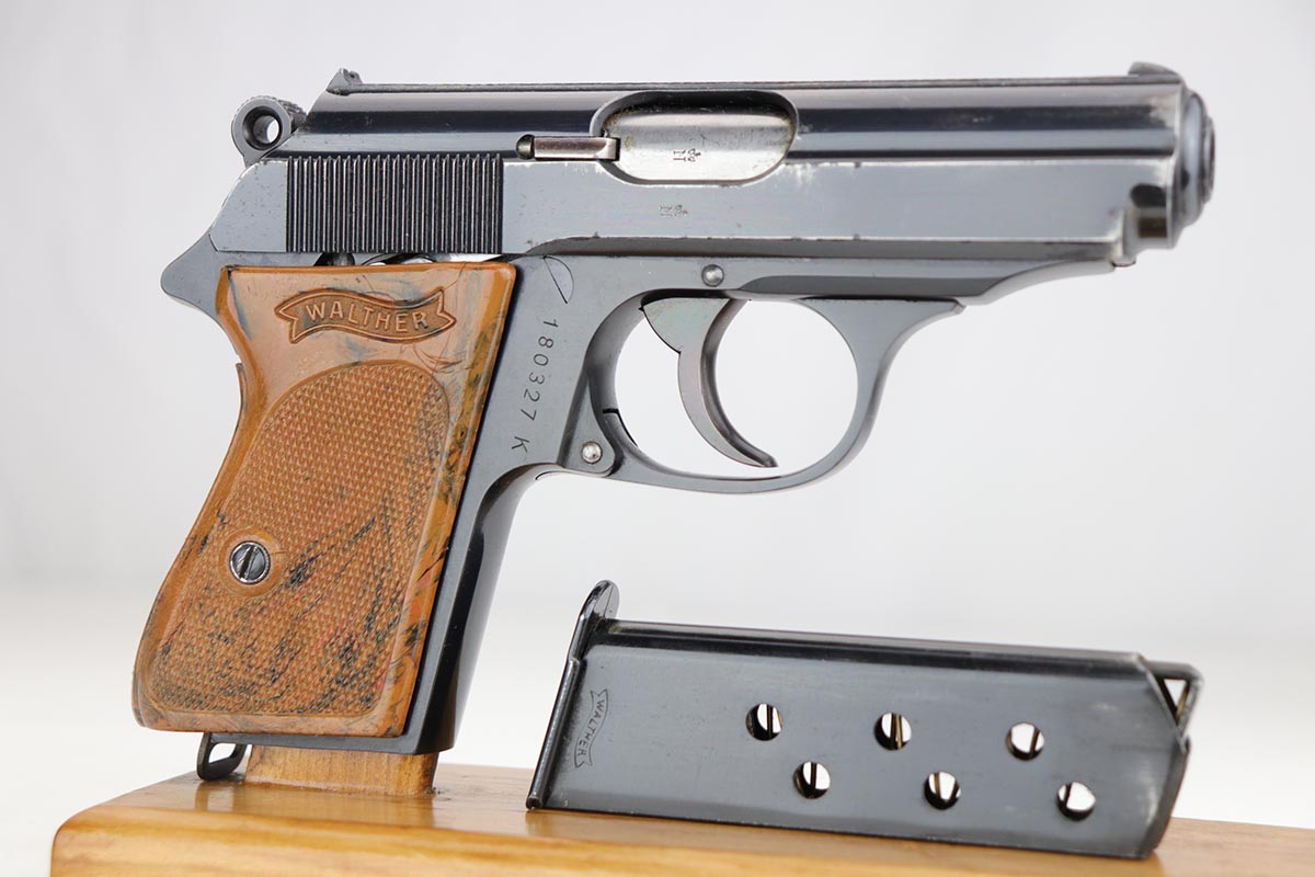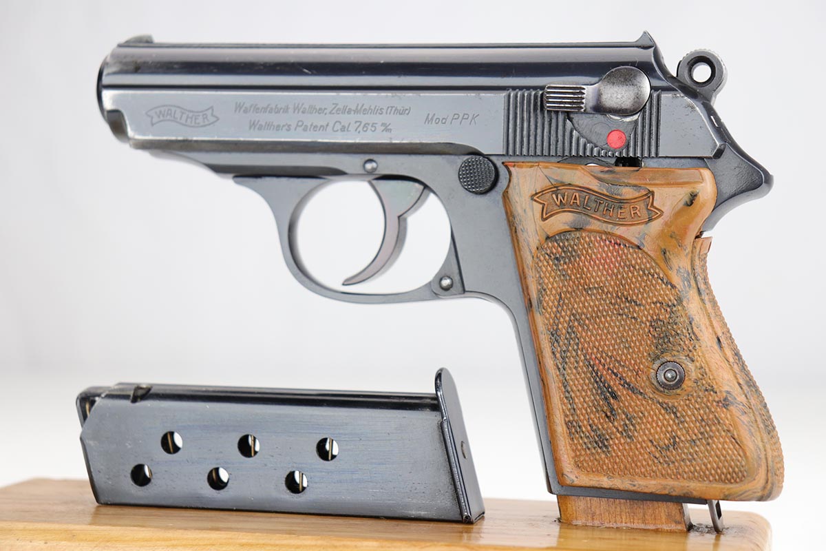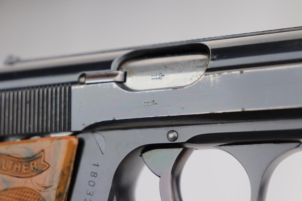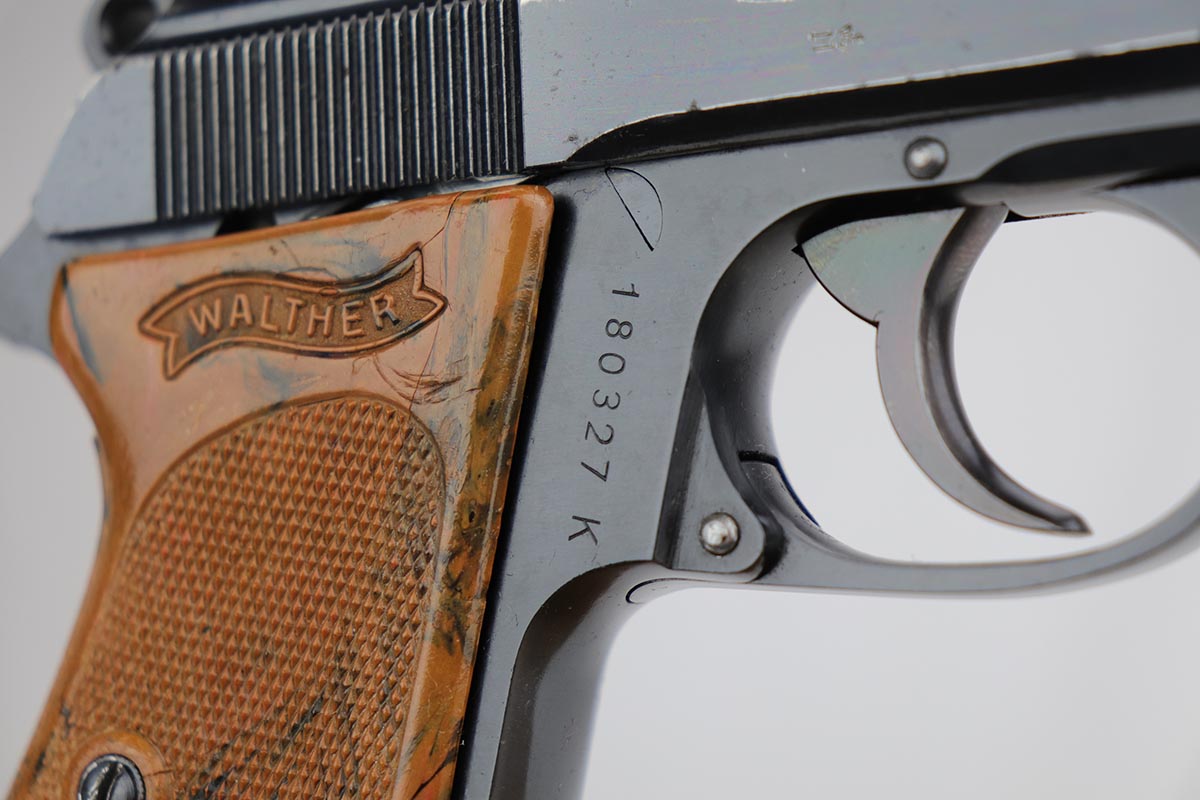 1/7/20 – This is a very nice example of a Walther PPK that was made in 1939 for the commercial market. Original, high-polish blue rates at 94-95% with nearly all finish loss toward the muzzle, on either side of the slide. Minty bore and good mechanics. Early banner magazine in terrific condition. Grip shows age and handling wear, with a small crack in spine and another surface crack or scratch on either side.