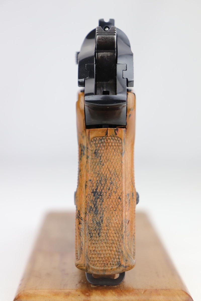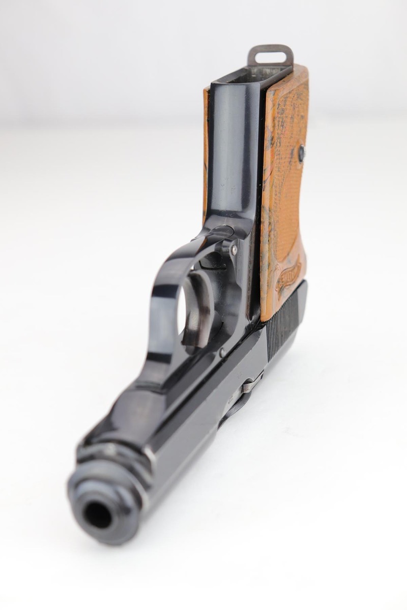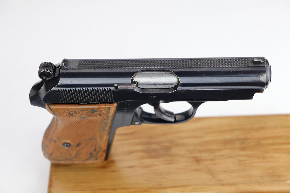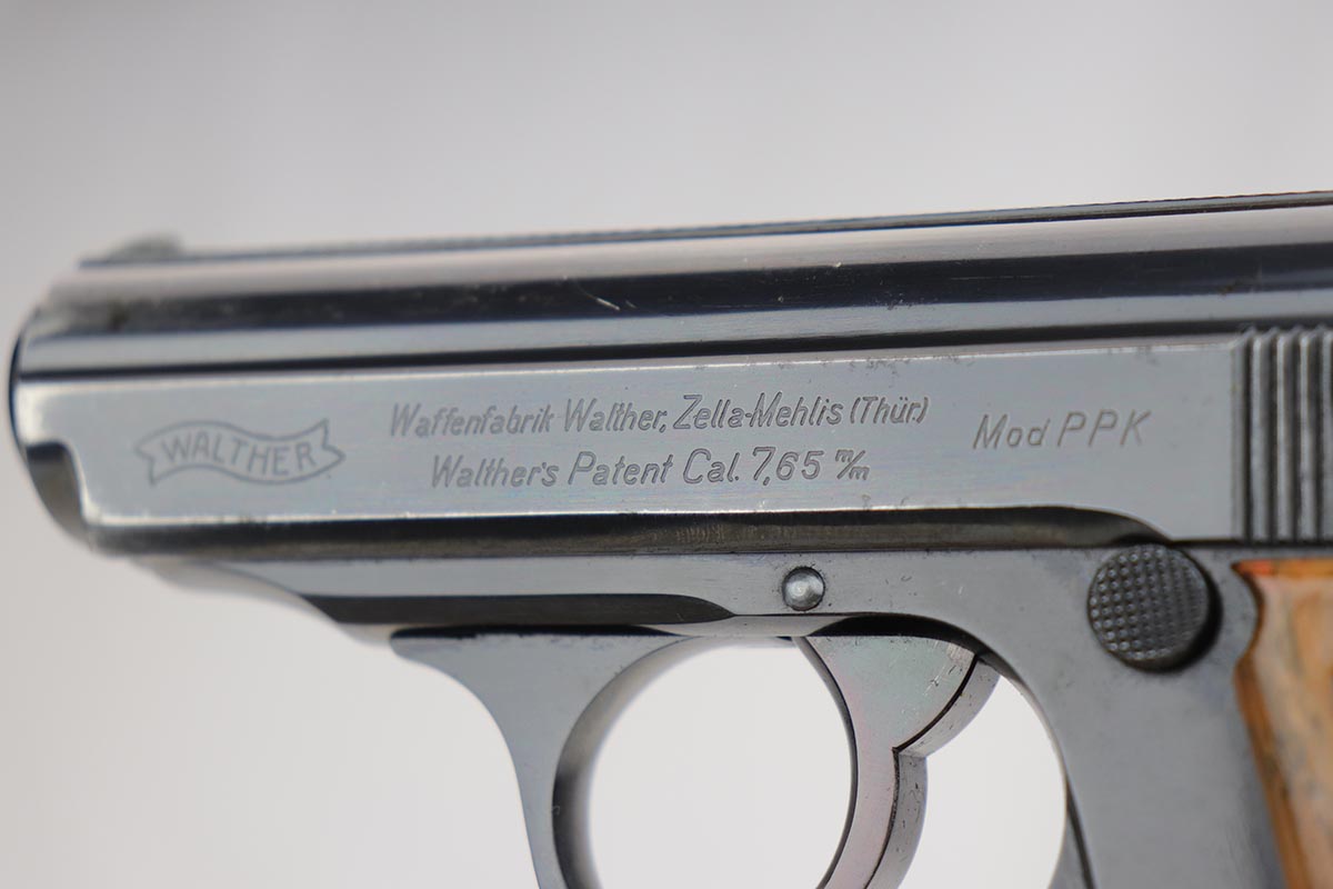 1/7/20 – This is a very nice example of a Walther PPK that was made in 1939 for the commercial market. Original, high-polish blue rates at 94-95% with nearly all finish loss toward the muzzle, on either side of the slide. Minty bore and good mechanics. Early banner magazine in terrific condition. Grip shows age and handling wear, with a small crack in spine and another surface crack or scratch on either side.
