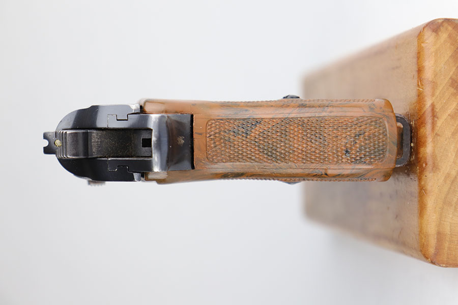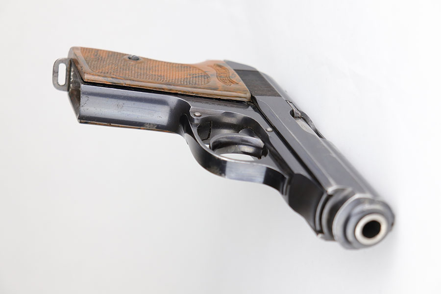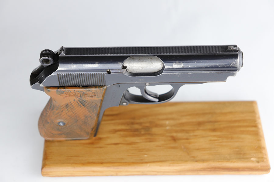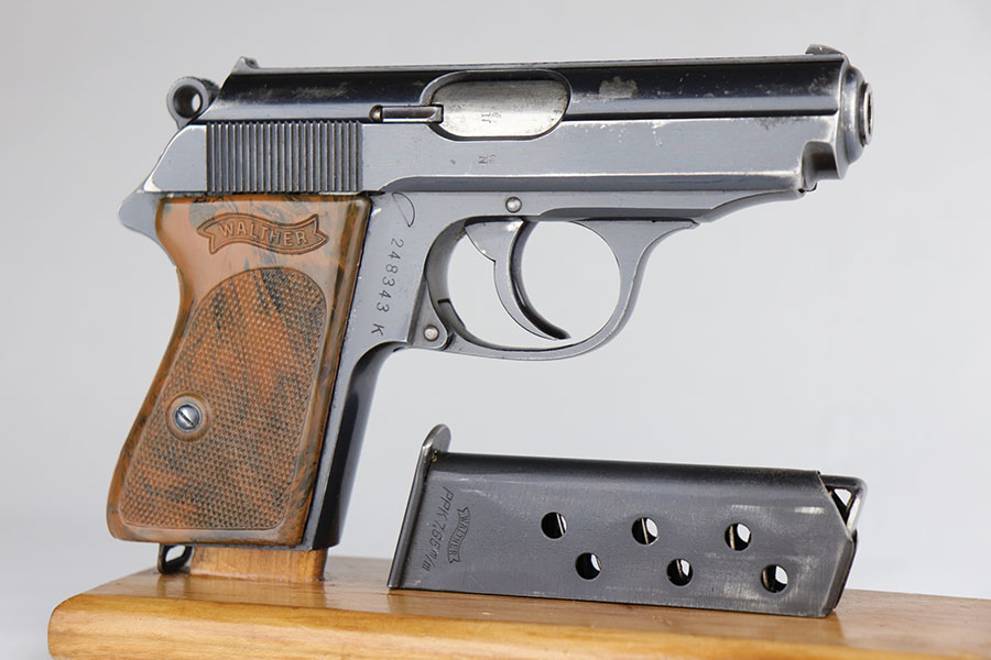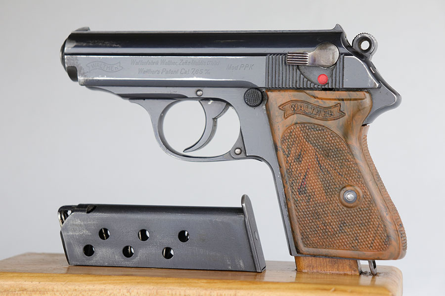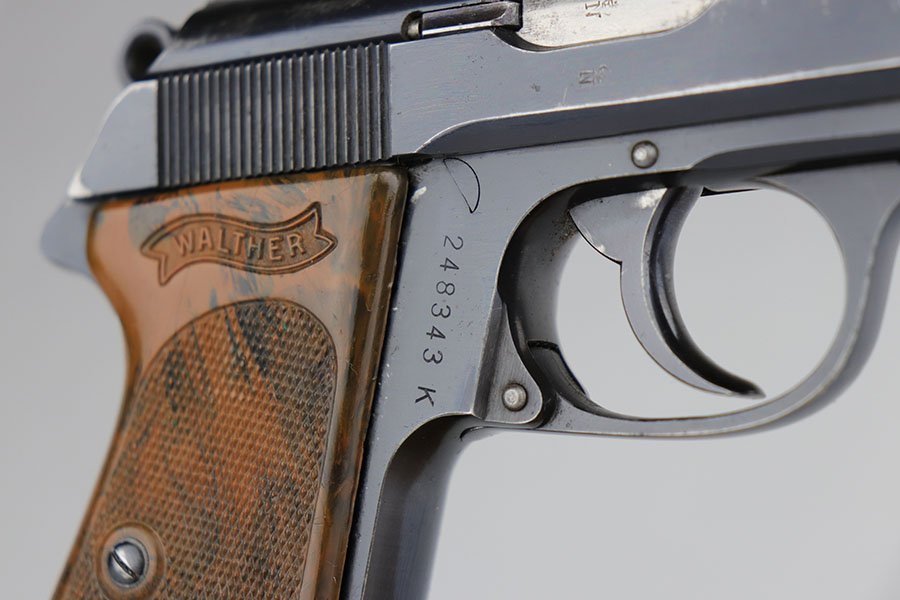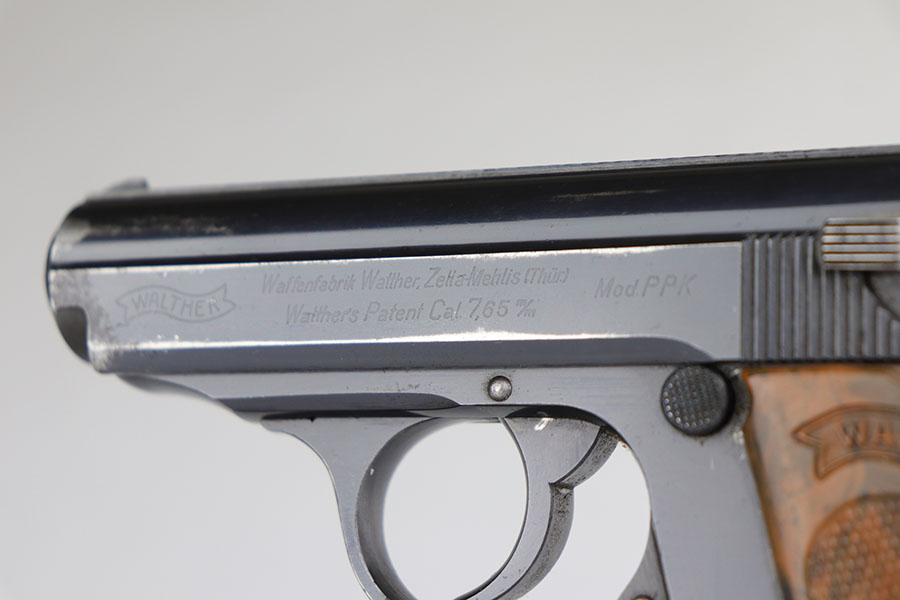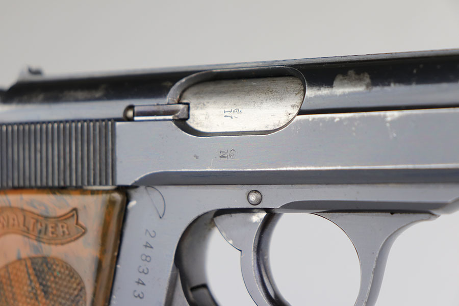 6/25/20 – This is a nice, honest Walther PPK made in 1939 for the German commercial market. The high-polish blue rates at about 90% with muzzle and edge wear on both sides of the slide, and some finish loss along the rounded portion of the right side slide. There are also minor spots of finish loss on front strap and trigger guard. Little bit of freckling on the left side of the muzzle and right side high edge. Crown/N proofs on slide and frame. Proper mechanics and excellent bore. Nice grip with a few scratches but no cracks or chips. Wartime magazine with flat bottom.