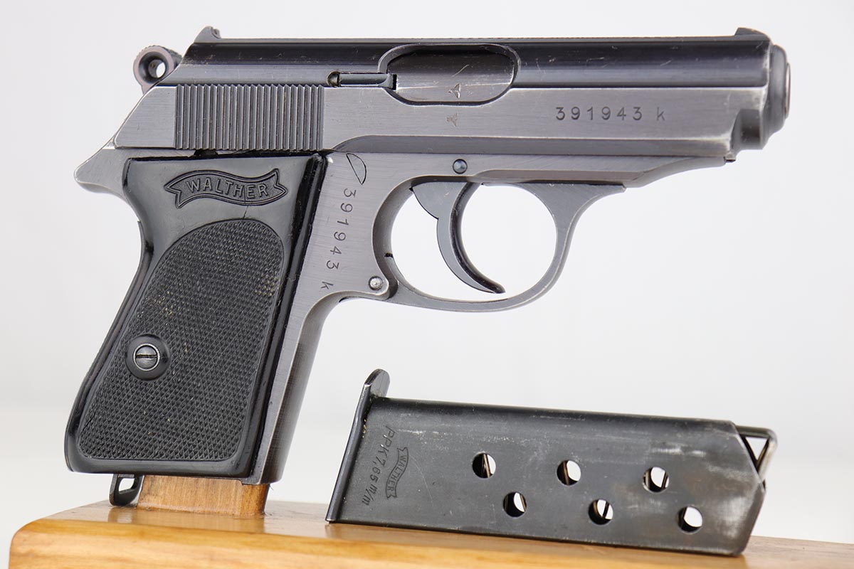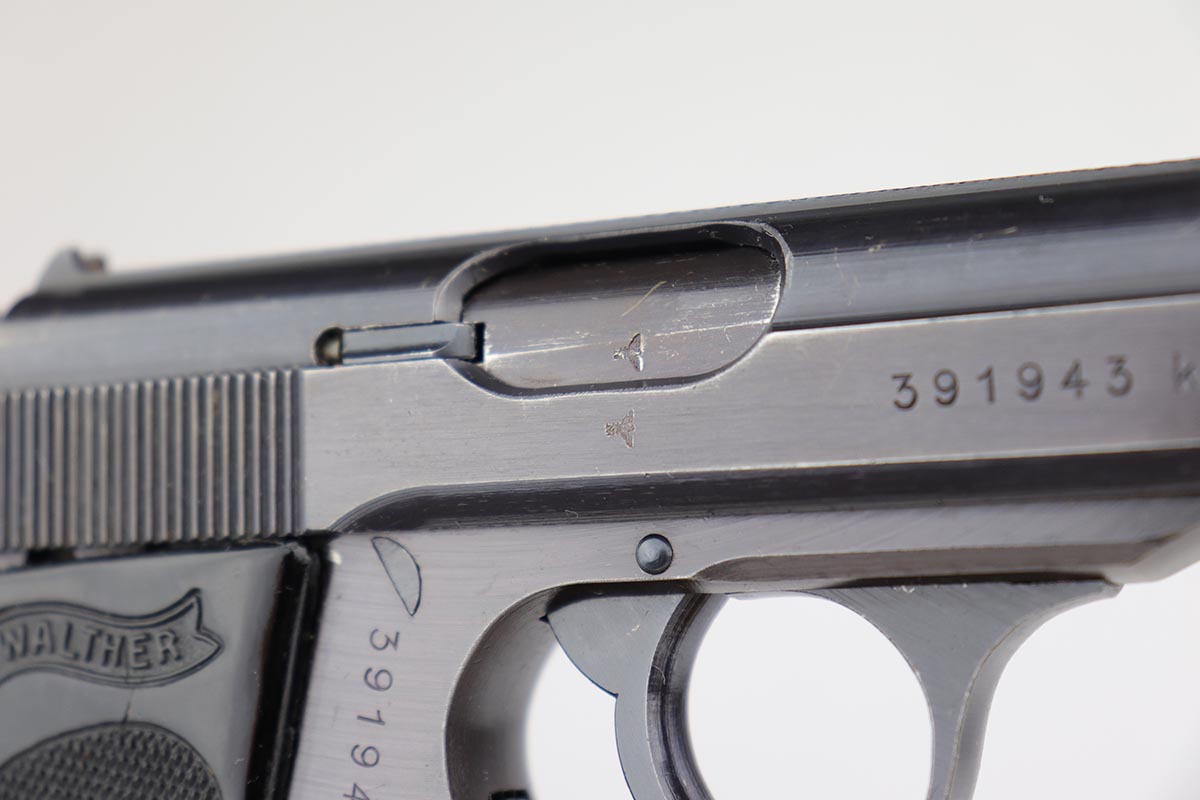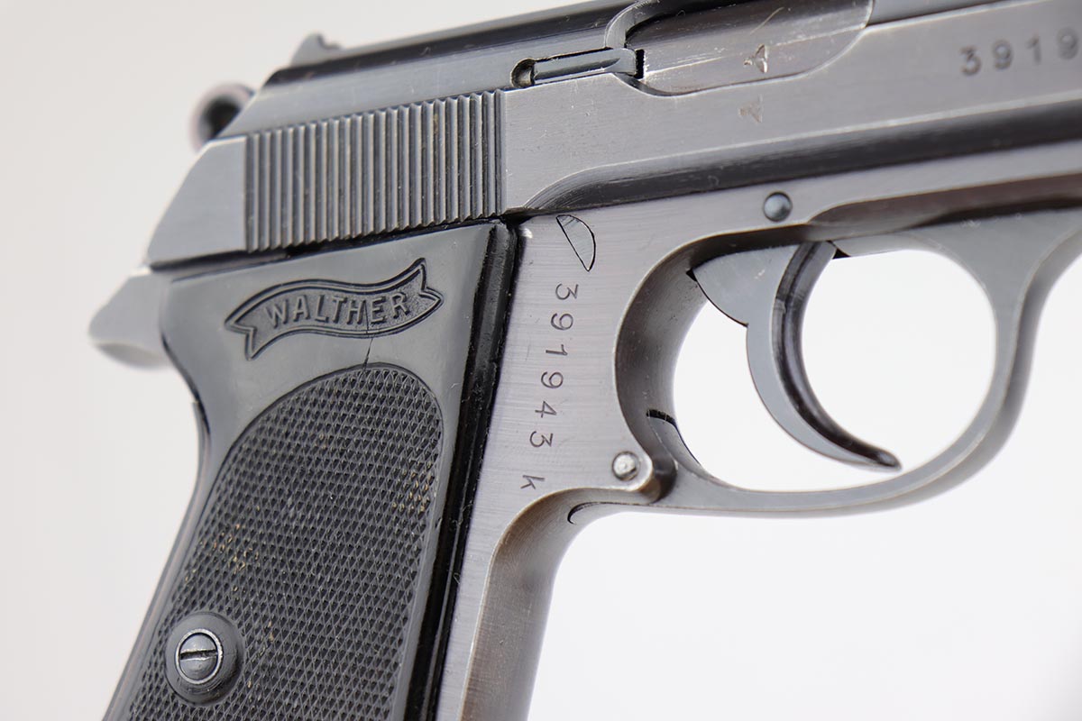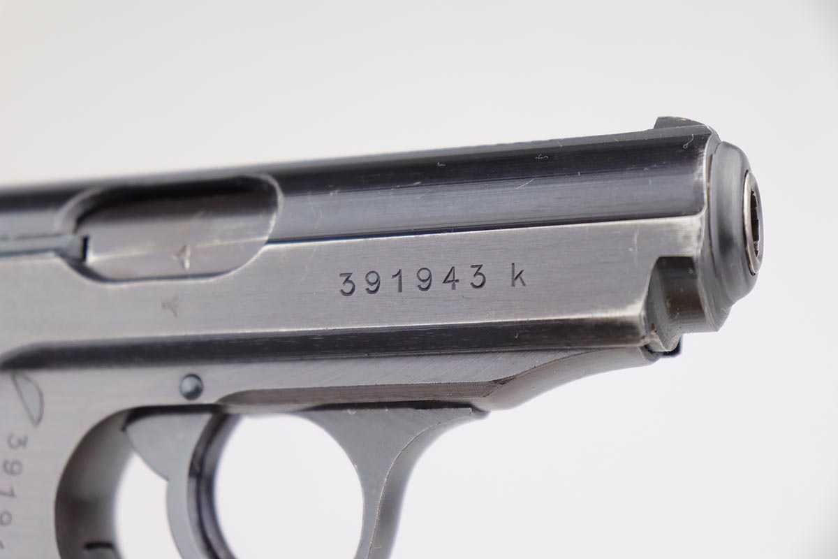 5/7/19 – This is a commercial Walther PPK from the Nazi era in matching, original condition. The military style bluing rates at about 93-94% with muzzle wear on both sides of the slide, minor thinning of the front strap and a couple splotchy areas on the slide. Original black grip with a few notable scratches but no actual cracks. Minty bore.