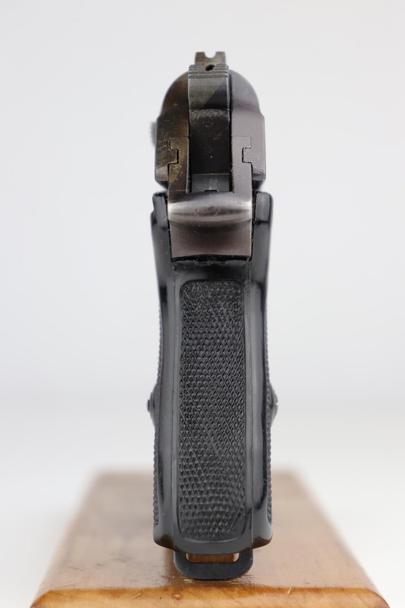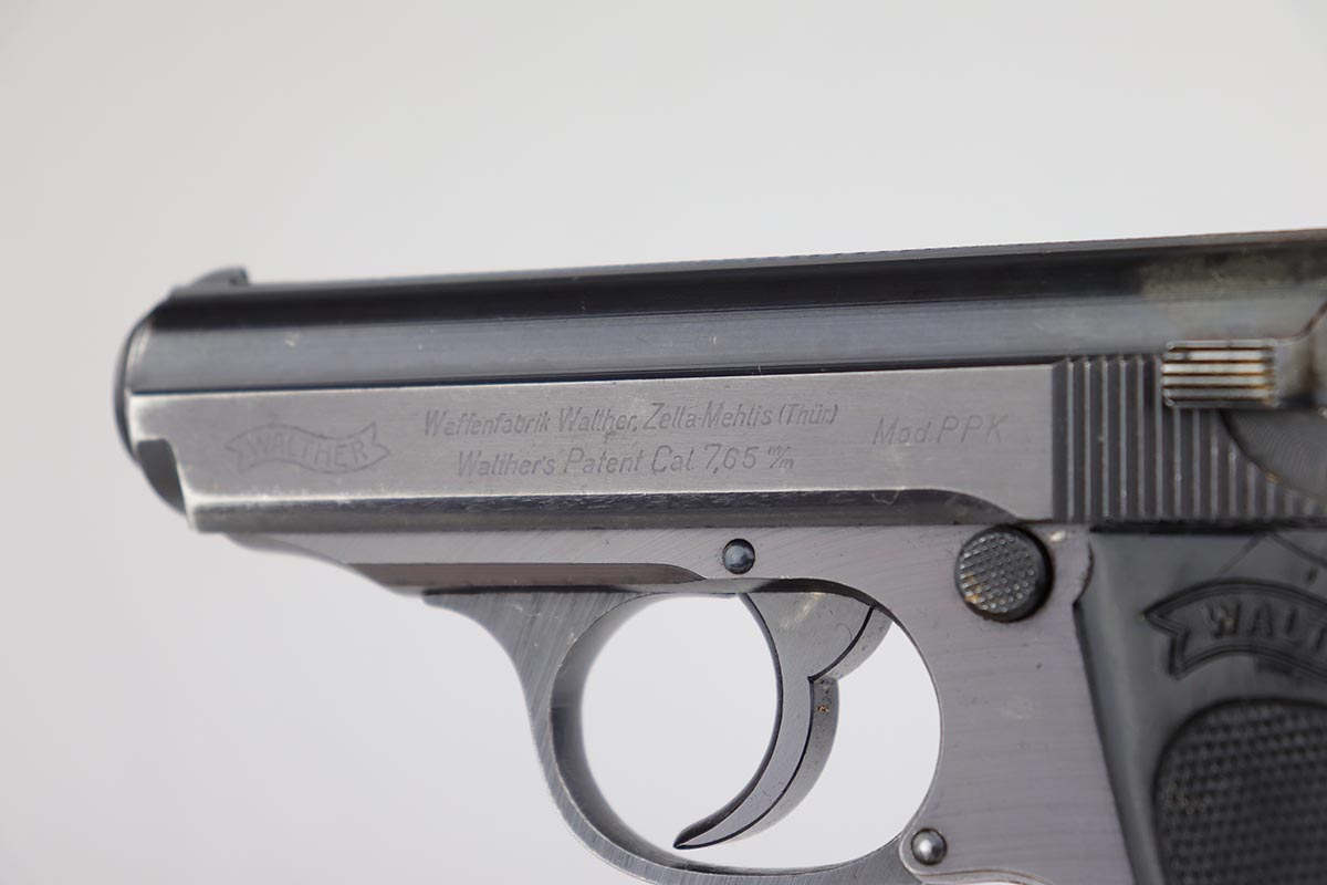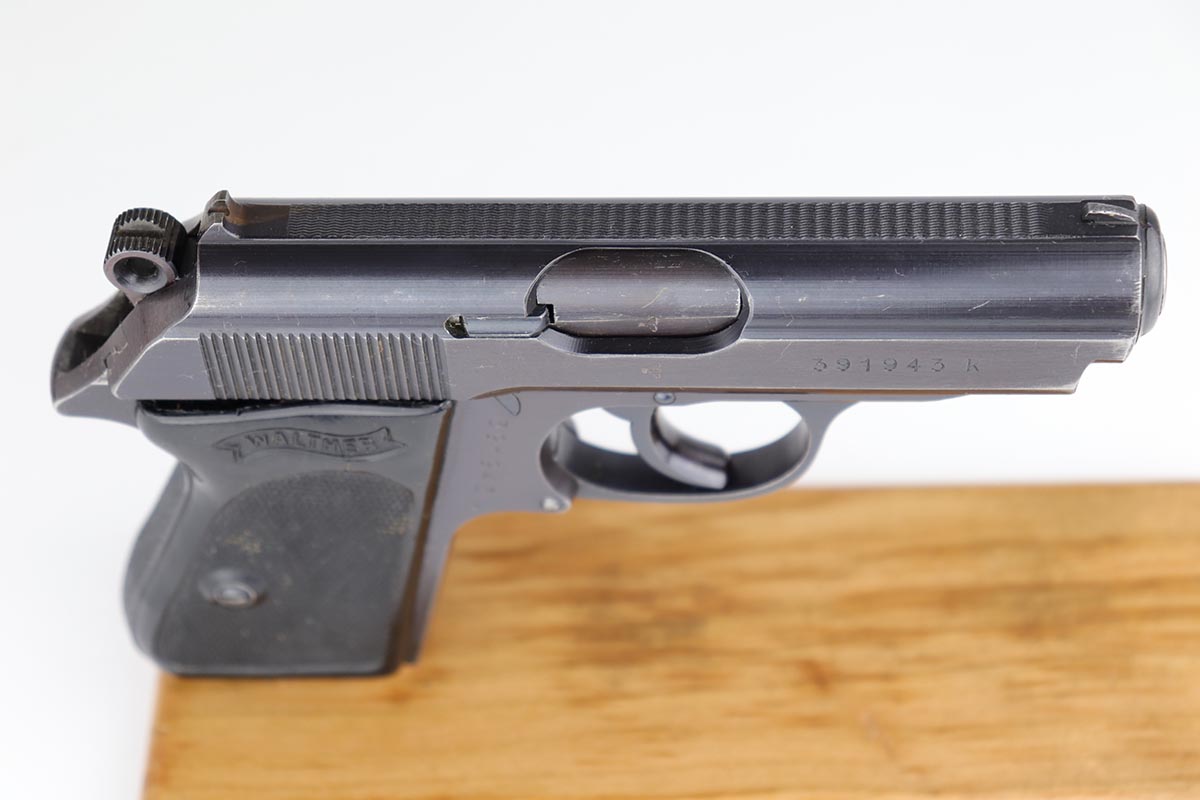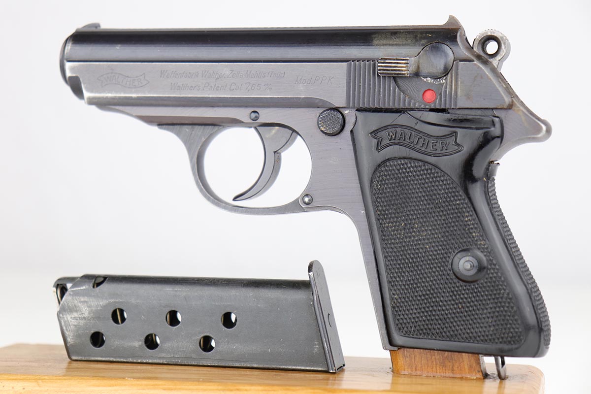 5/7/19 – This is a commercial Walther PPK from the Nazi era in matching, original condition. The military style bluing rates at about 93-94% with muzzle wear on both sides of the slide, minor thinning of the front strap and a couple splotchy areas on the slide. Original black grip with a few notable scratches but no actual cracks. Minty bore.