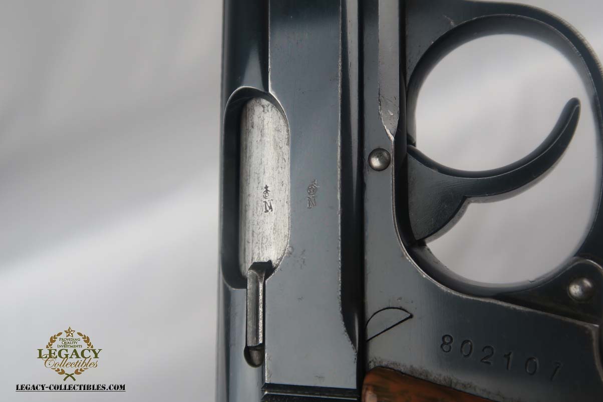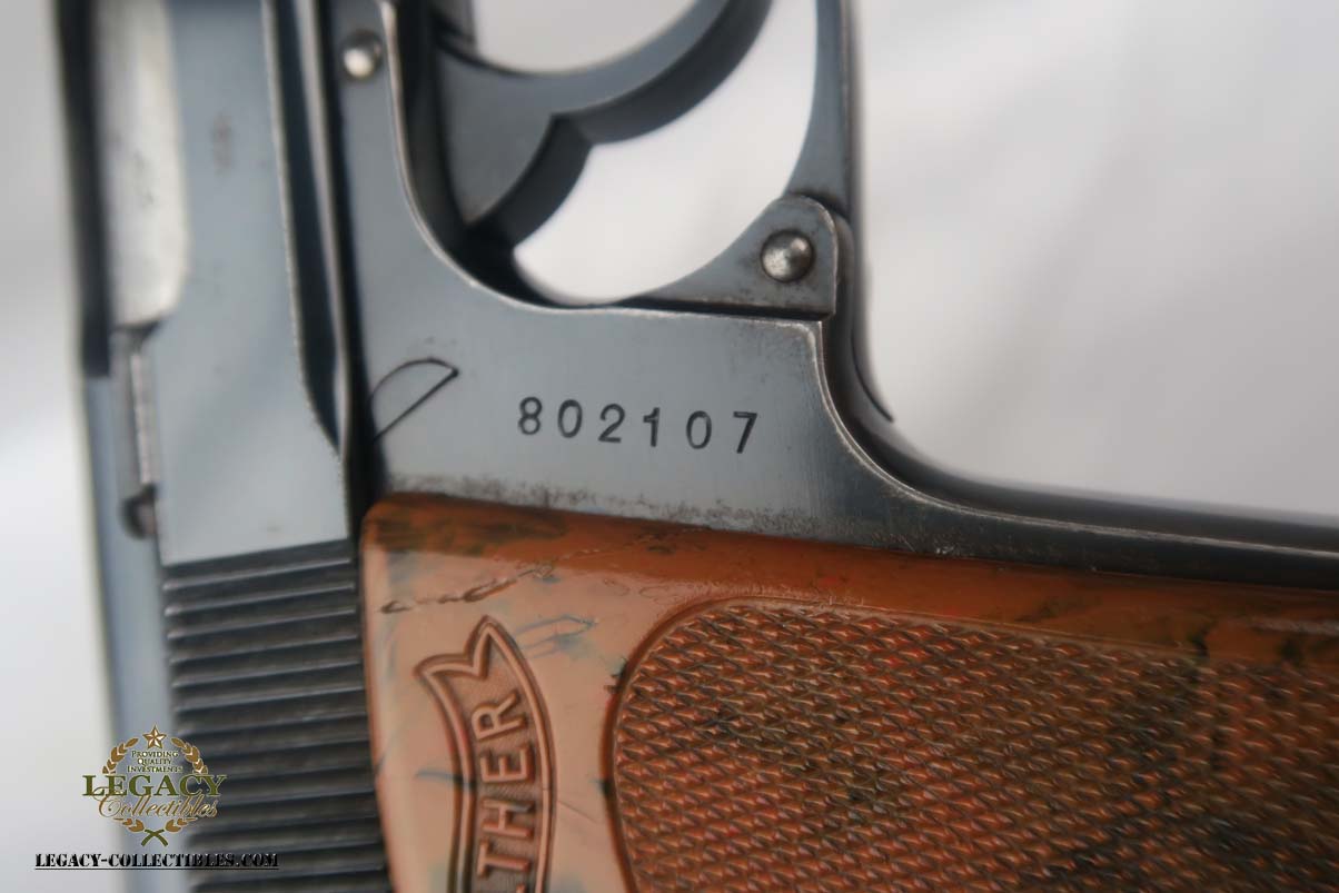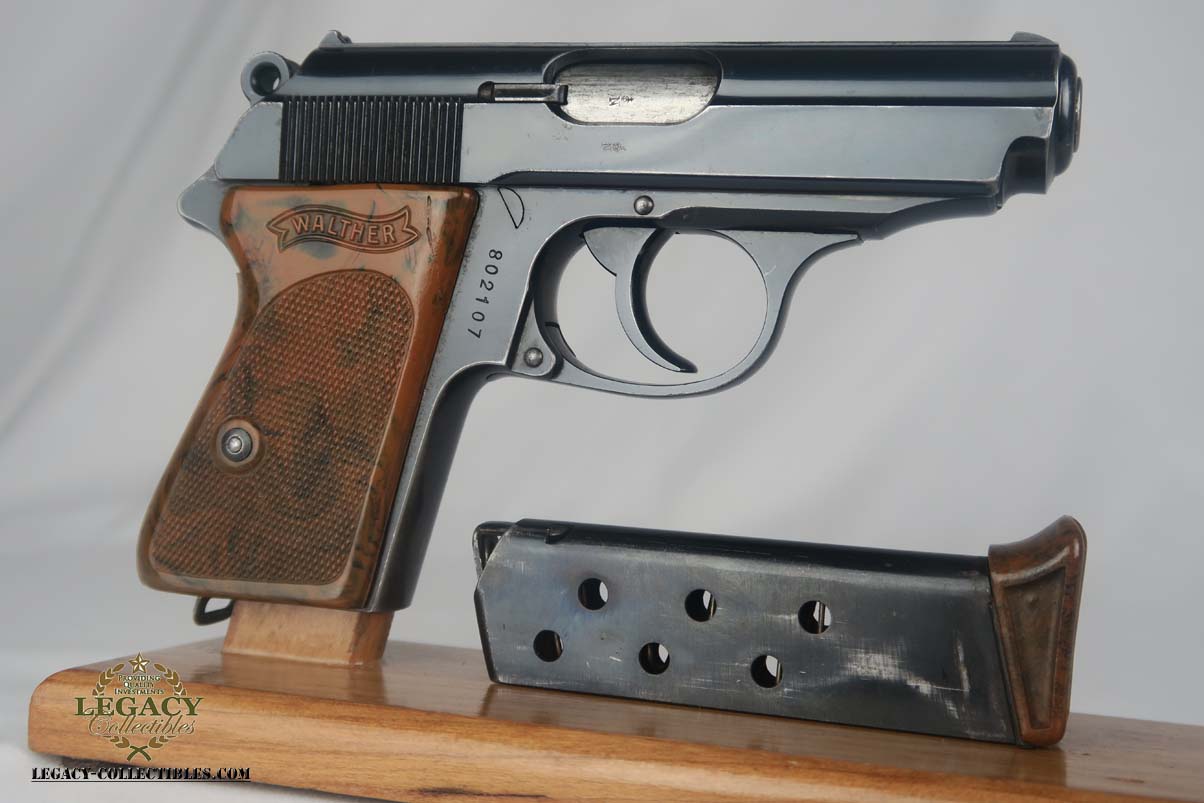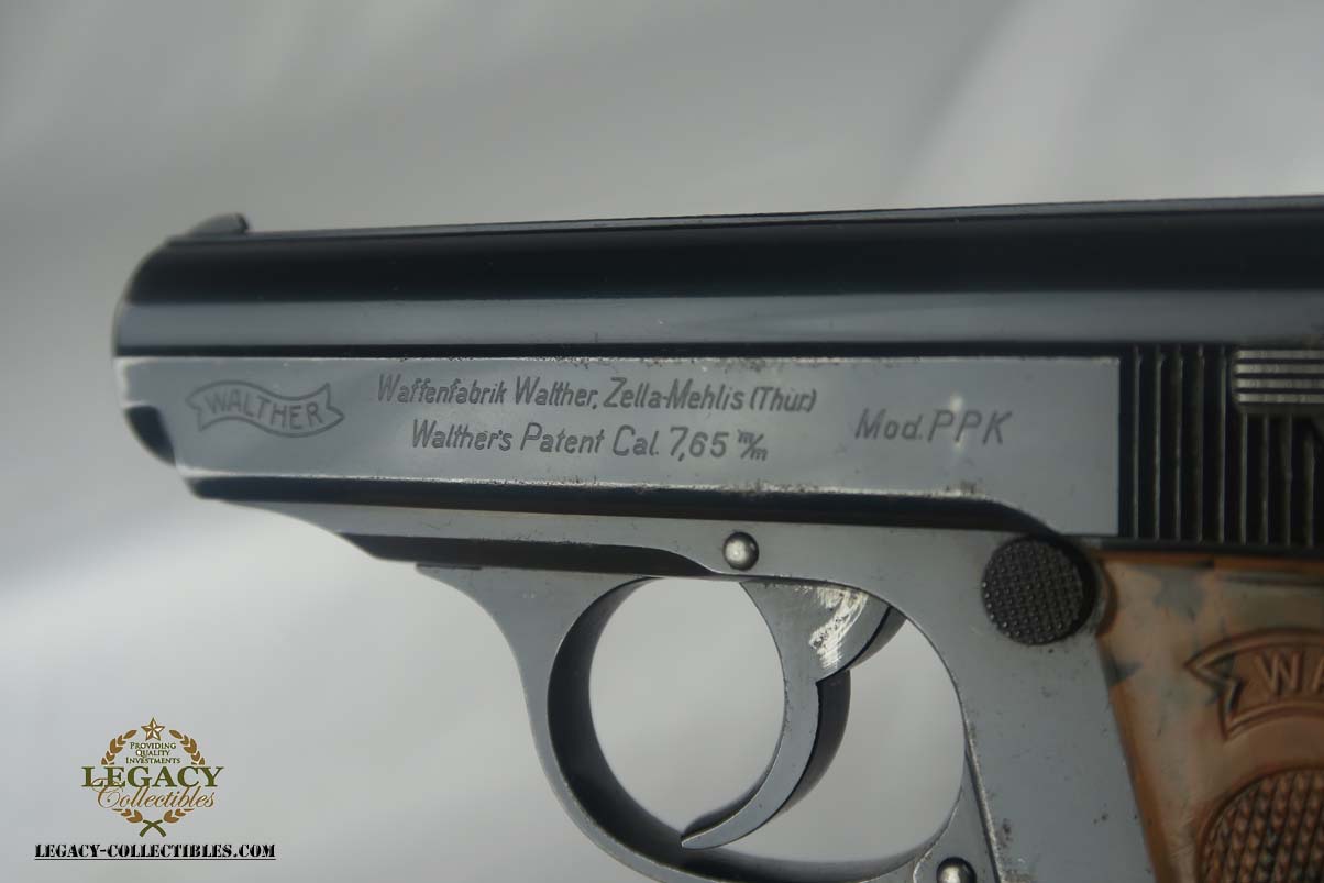 6/2/17 – This is a commercially produced Walther PPK, manufactured in the 1933-1934 range.  It has early features such as the 90 degree safety and Crown/N proofs, as well as the left to right grip screw.  The original bluing rates at about 95%, with most of the wear on the front strap.  The right side of the grip shows a small repaired crack.  Early banner magazine with finger extension is in excellent condition.  Safety shows very little fire blue remaining.  Strong bore with no issues.