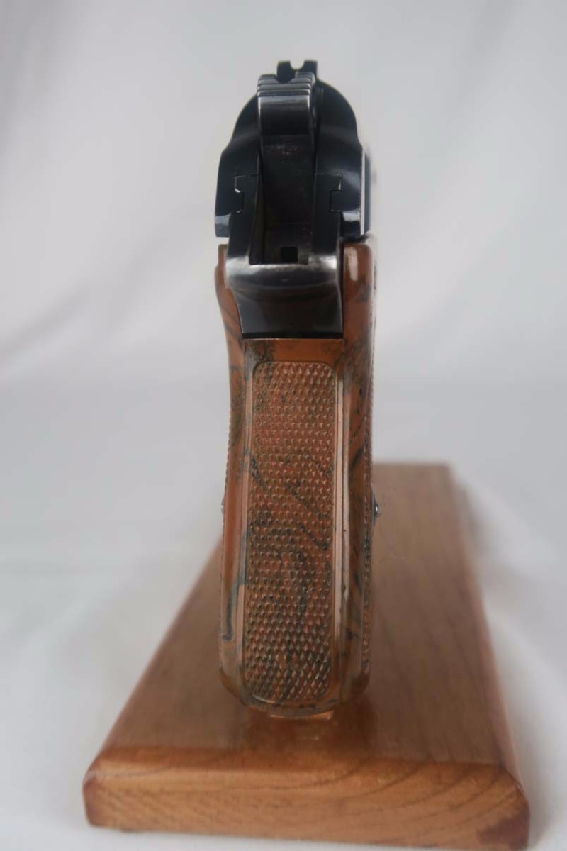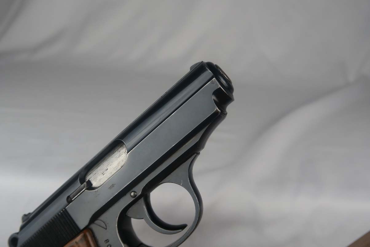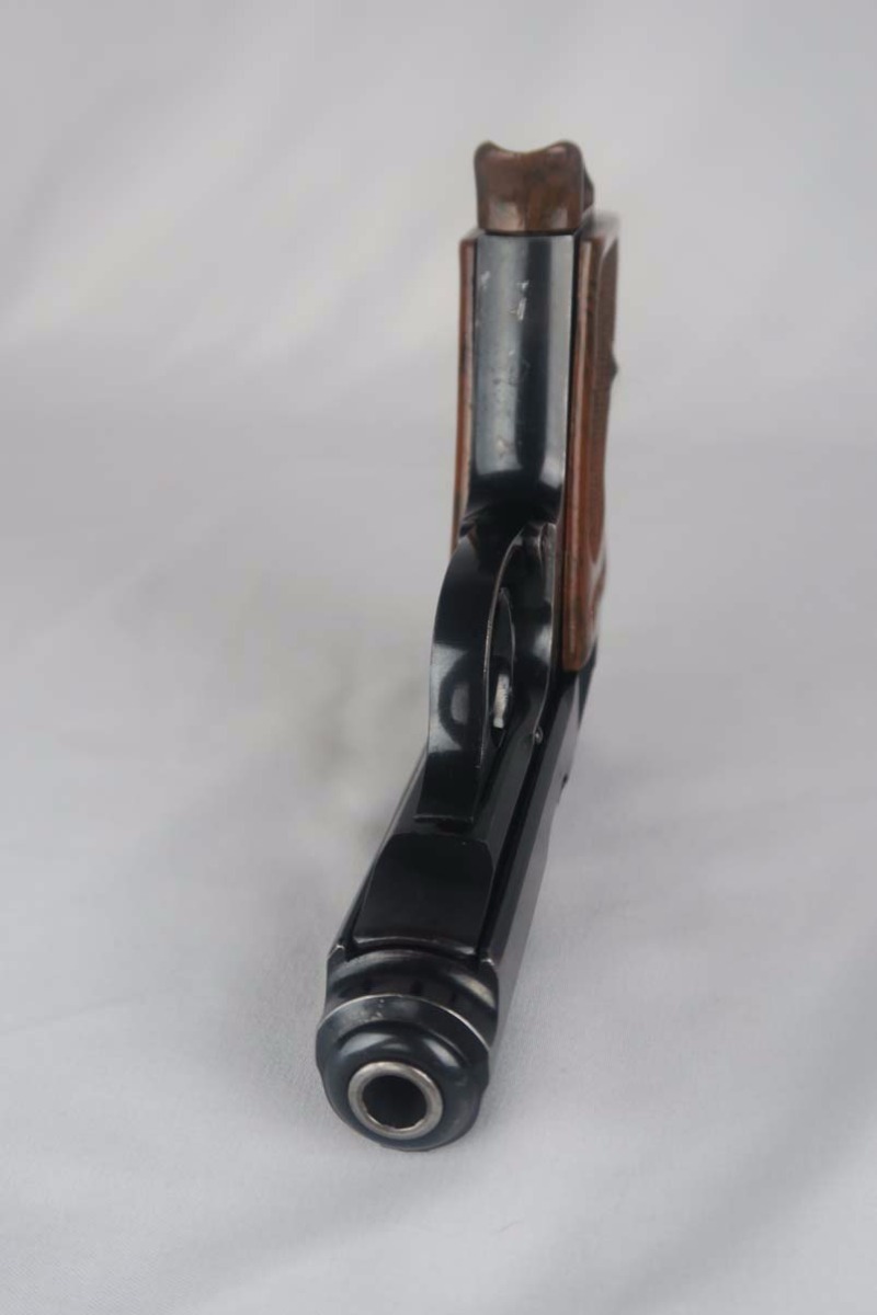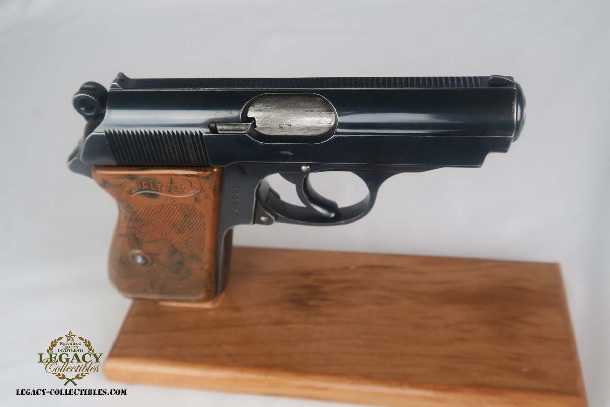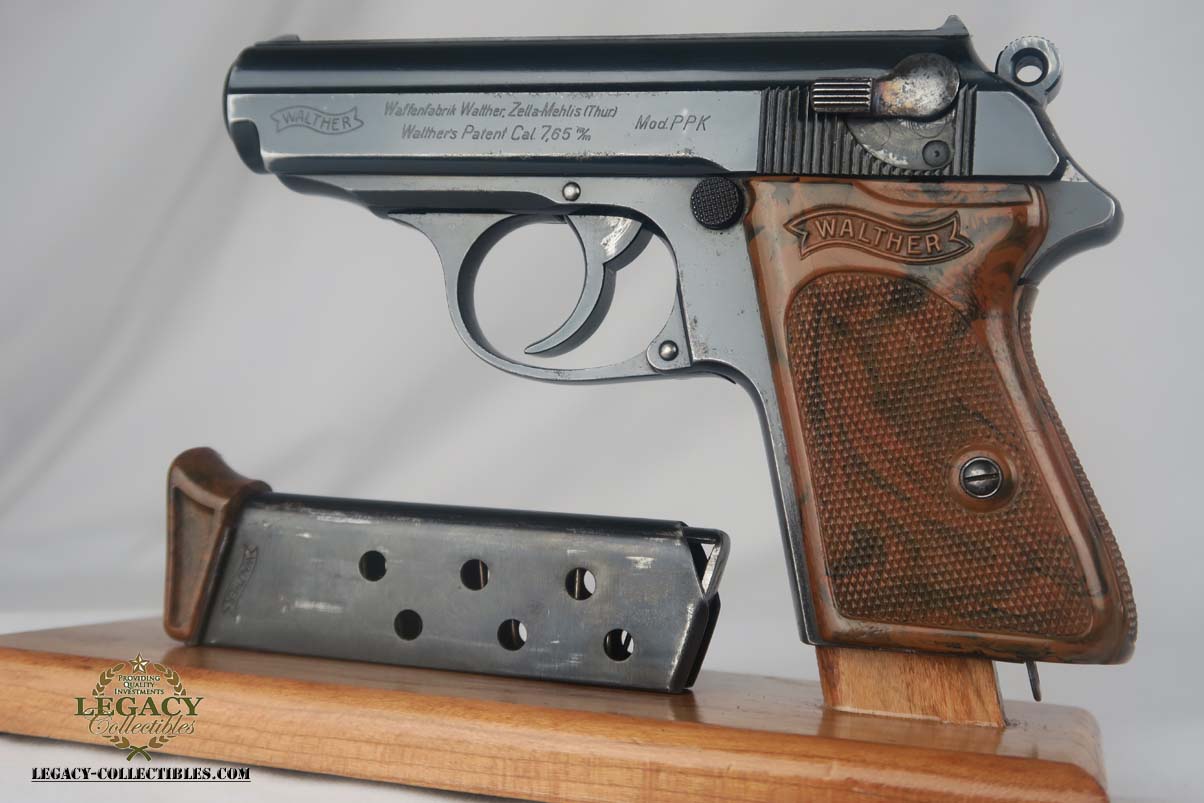 6/2/17 – This is a commercially produced Walther PPK, manufactured in the 1933-1934 range.  It has early features such as the 90 degree safety and Crown/N proofs, as well as the left to right grip screw.  The original bluing rates at about 95%, with most of the wear on the front strap.  The right side of the grip shows a small repaired crack.  Early banner magazine with finger extension is in excellent condition.  Safety shows very little fire blue remaining.  Strong bore with no issues.