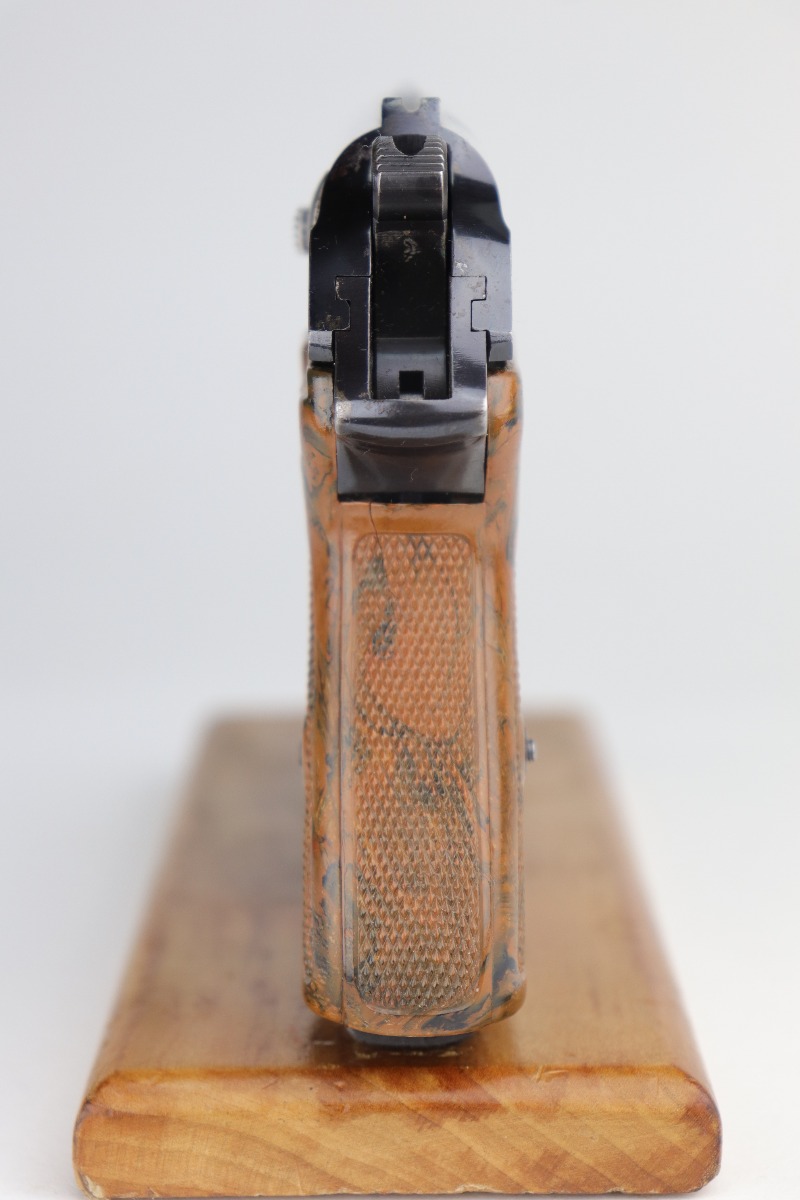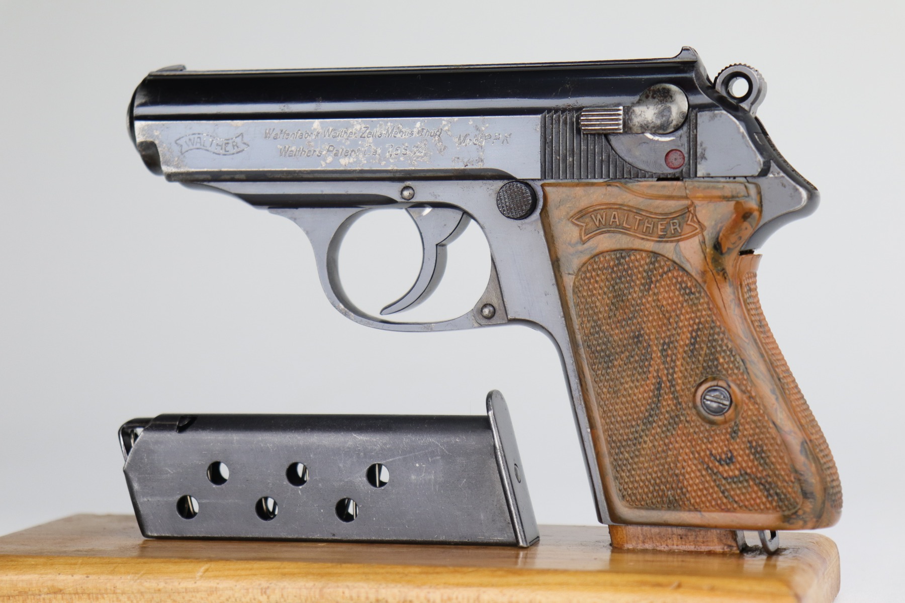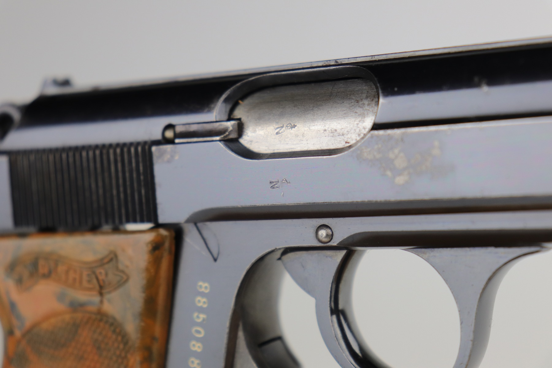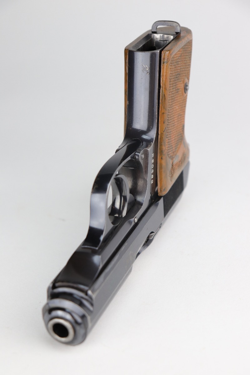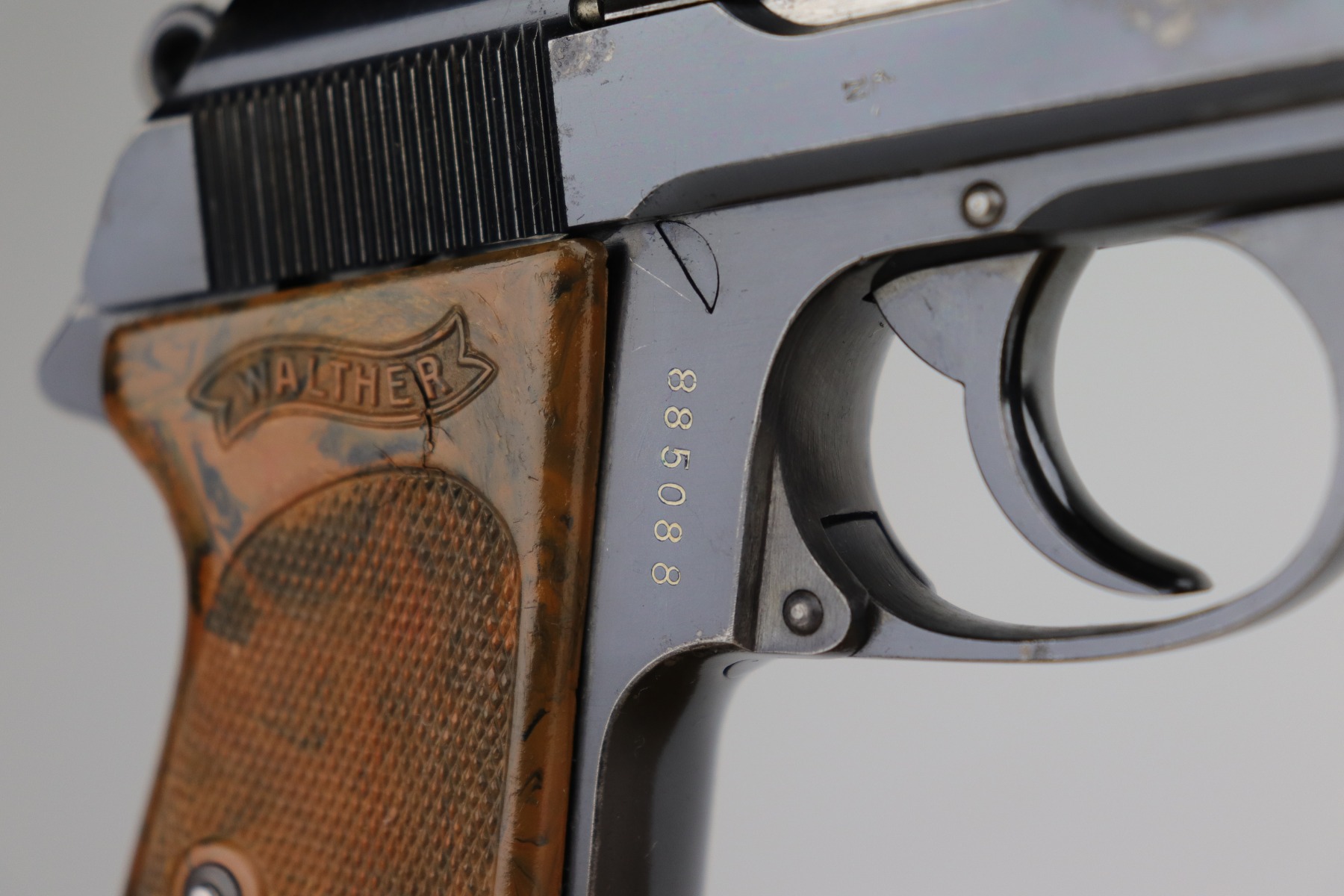 12/21/20 – This is a very nice example of a Walther PPK sold in the commercial market in 1935. It is all matching and has the proper “Crown N” proofs. It has retained about 90% of its high polish bluing. There is minor wear around the muzzle, but most of the bluing loss is spotty discoloration on the left side of the slide and a couple of small areas on the right side of the slide. There is some pin-pricking in the same areas. There is what looks like a small script letter “H” on the front strap. Likely someone’s initials engraved by a local jewelry during the period. It comes with a nice brown grip. There is a noticeable crack on the left side and a small crack on the right side. It comes with a proper Walther banner magazine. The bore is excellent – shiny with strong rifling.