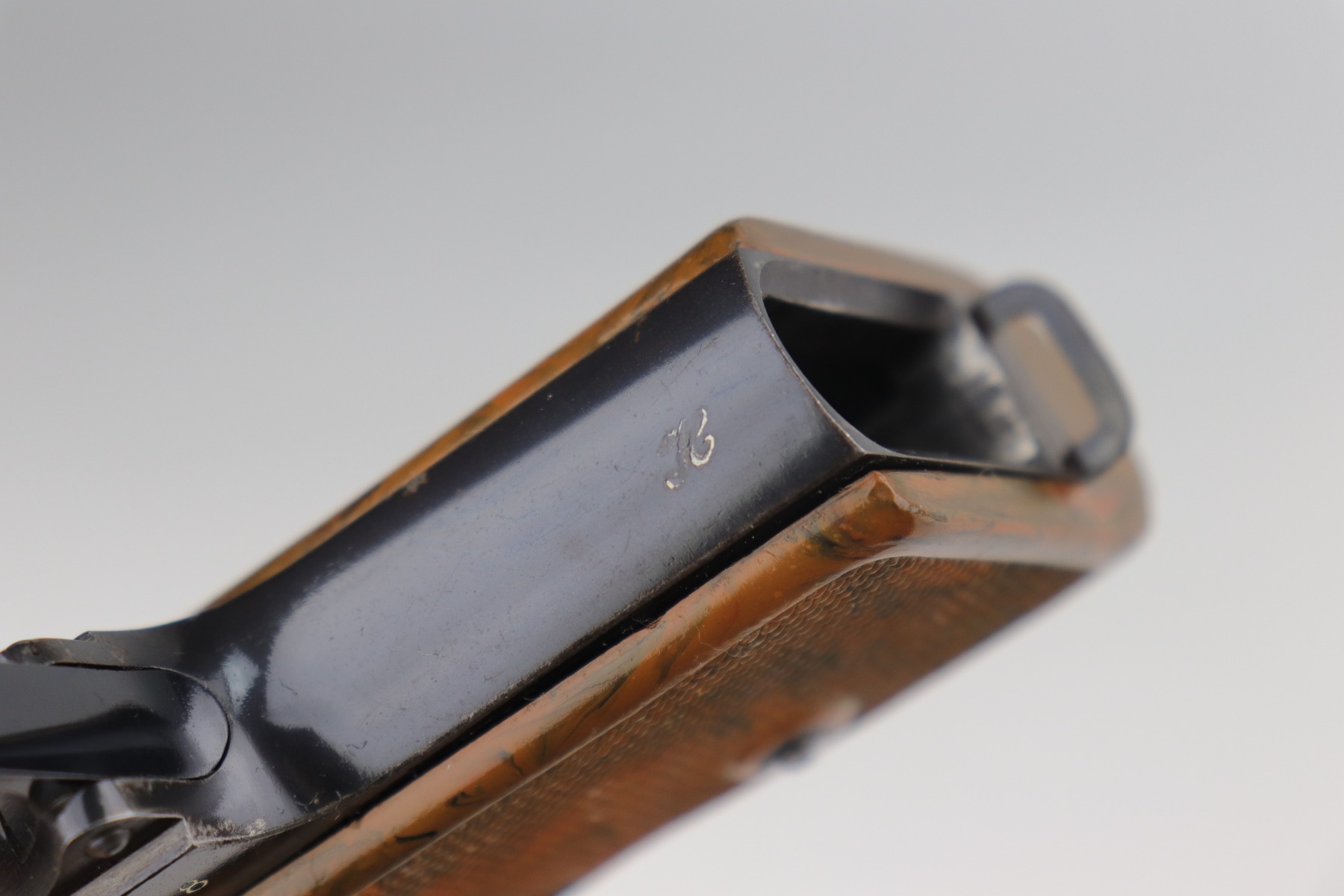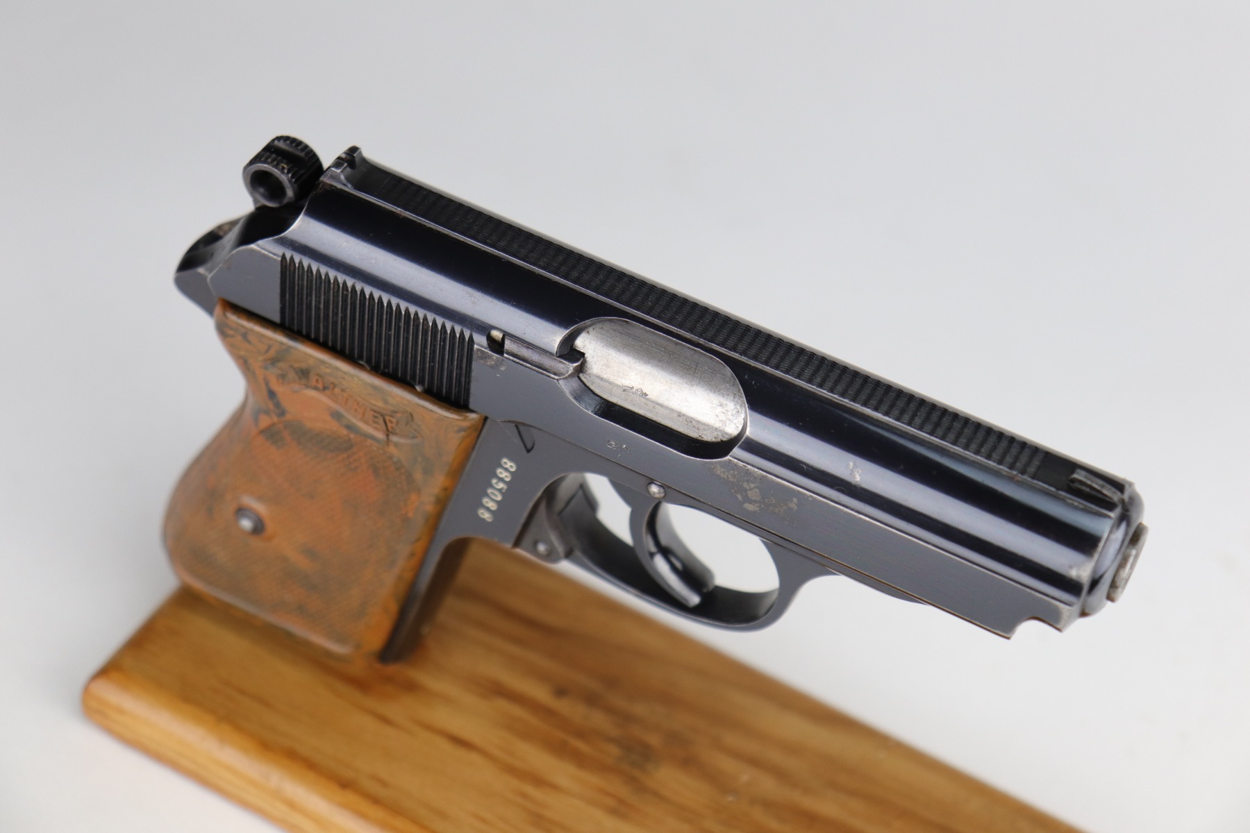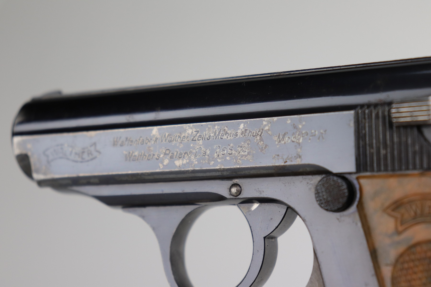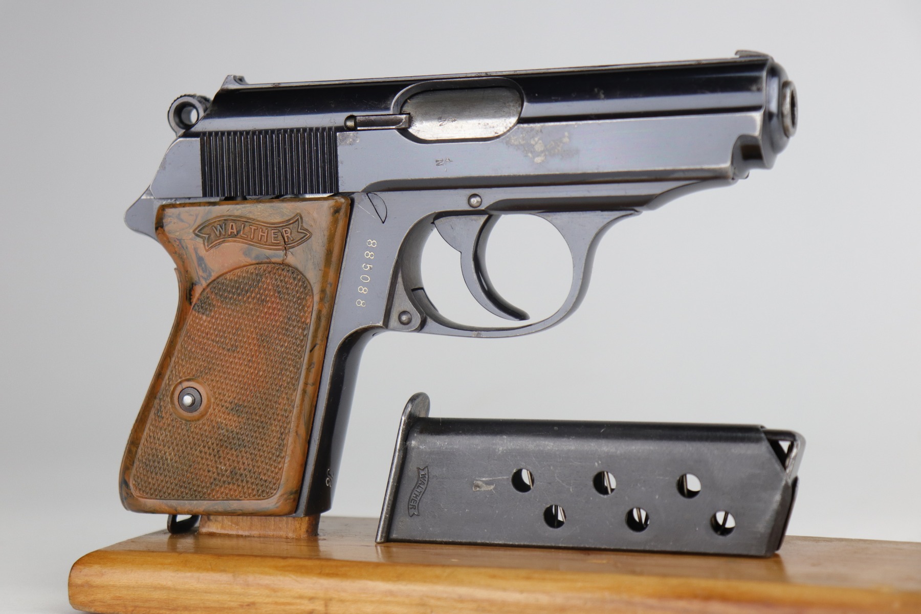 12/21/20 – This is a very nice example of a Walther PPK sold in the commercial market in 1935. It is all matching and has the proper “Crown N” proofs. It has retained about 90% of its high polish bluing. There is minor wear around the muzzle, but most of the bluing loss is spotty discoloration on the left side of the slide and a couple of small areas on the right side of the slide. There is some pin-pricking in the same areas. There is what looks like a small script letter “H” on the front strap. Likely someone’s initials engraved by a local jewelry during the period. It comes with a nice brown grip. There is a noticeable crack on the left side and a small crack on the right side. It comes with a proper Walther banner magazine. The bore is excellent – shiny with strong rifling.