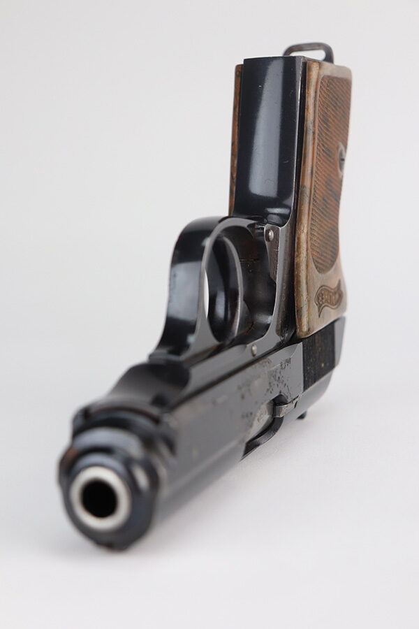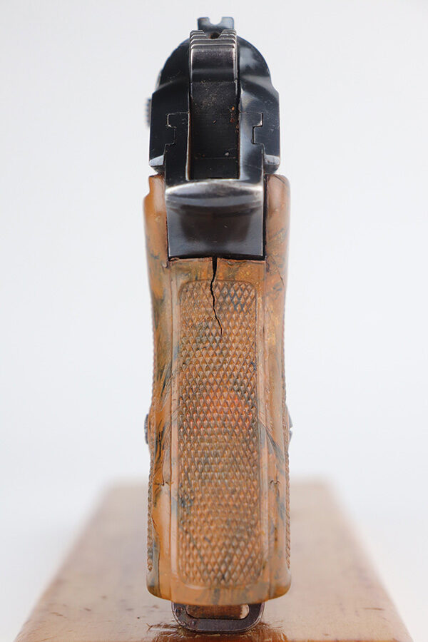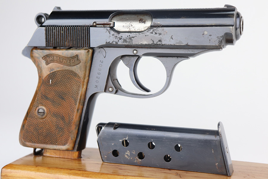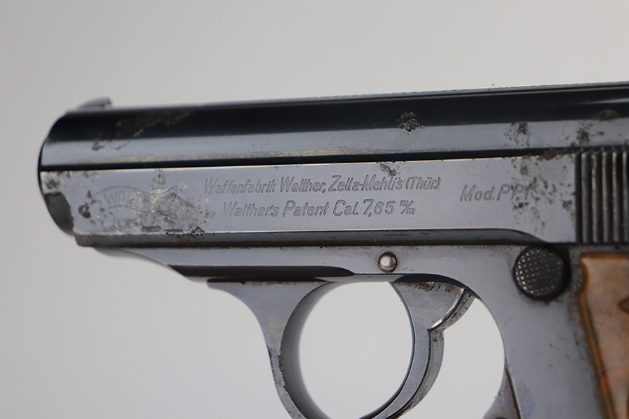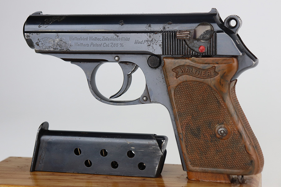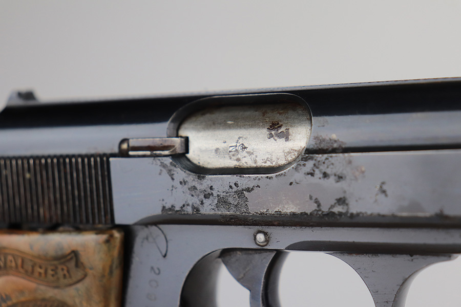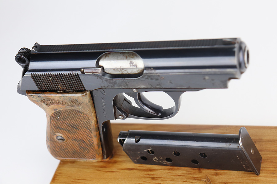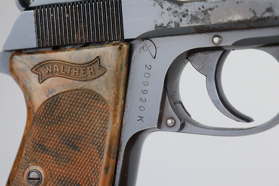 6/2/21 – This is a very nice example of a Walther PPK sold in the commercial market in 1938. It is all matching and has the proper “Crown N” proofs. It has retained about 95% of its original high polish finish. While there isn’t much actual finish loss, there are areas of heavy pitting on both sides of the slide. Some very tiny handling marks on the front strap. Nice brown grip – small crack in the spine. Comes with a correct banner-only magazine. Minty bore.