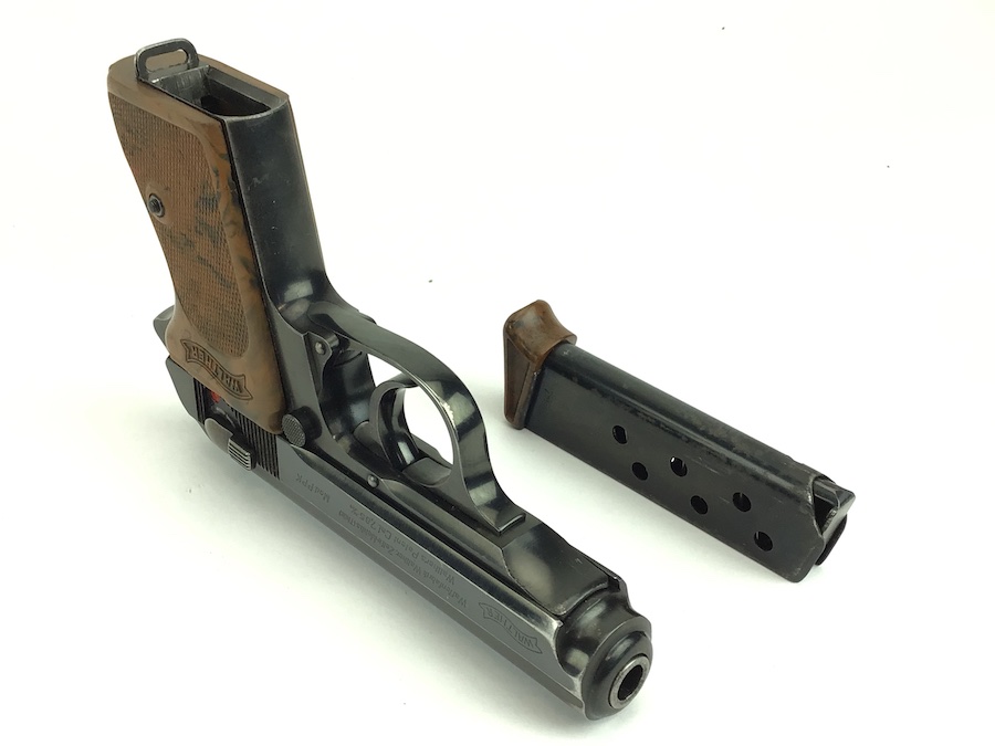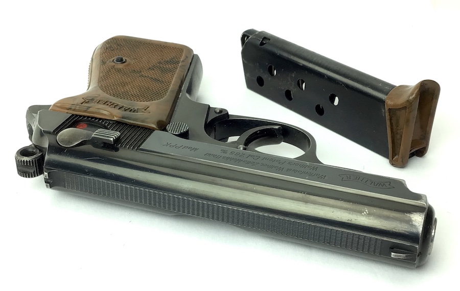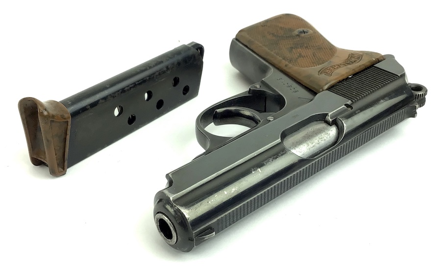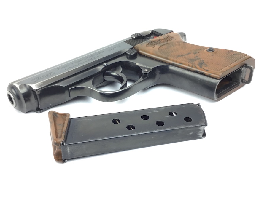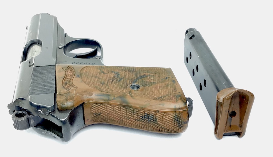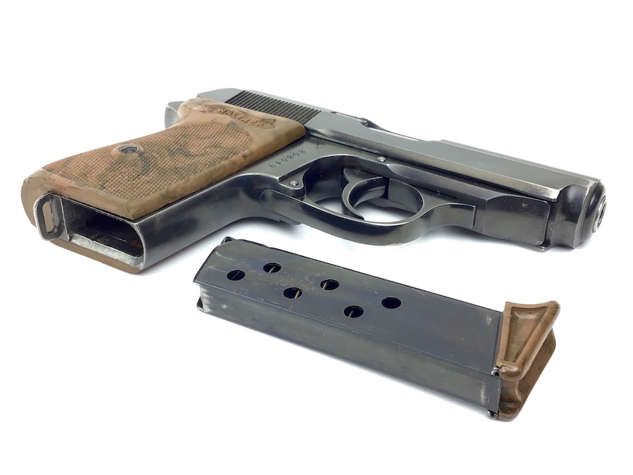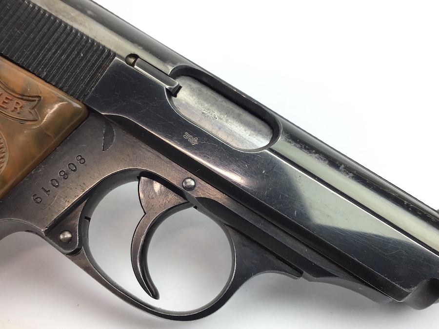 8/12/21 – Original and in great condition. Commercial Walther PPK. Finish rates about 93-94% with most wear around the muzzle and right side of the slide. Very clean front strap. Matching slide and frame. Beautiful one piece grip with only minor hairline cracks that are nearly invisible. Correct banner only magazine with thin lip finger extension. Bore is shiny with strong rifling and rates about 9 of 10.