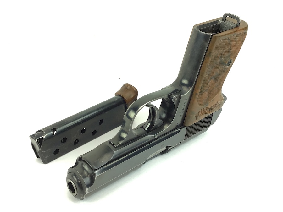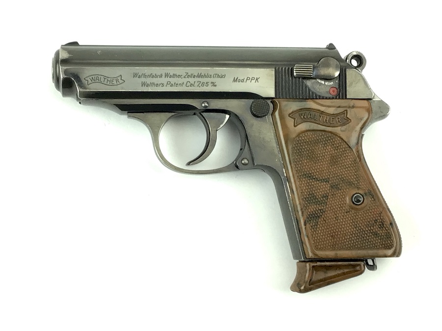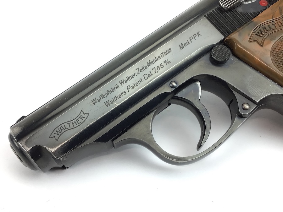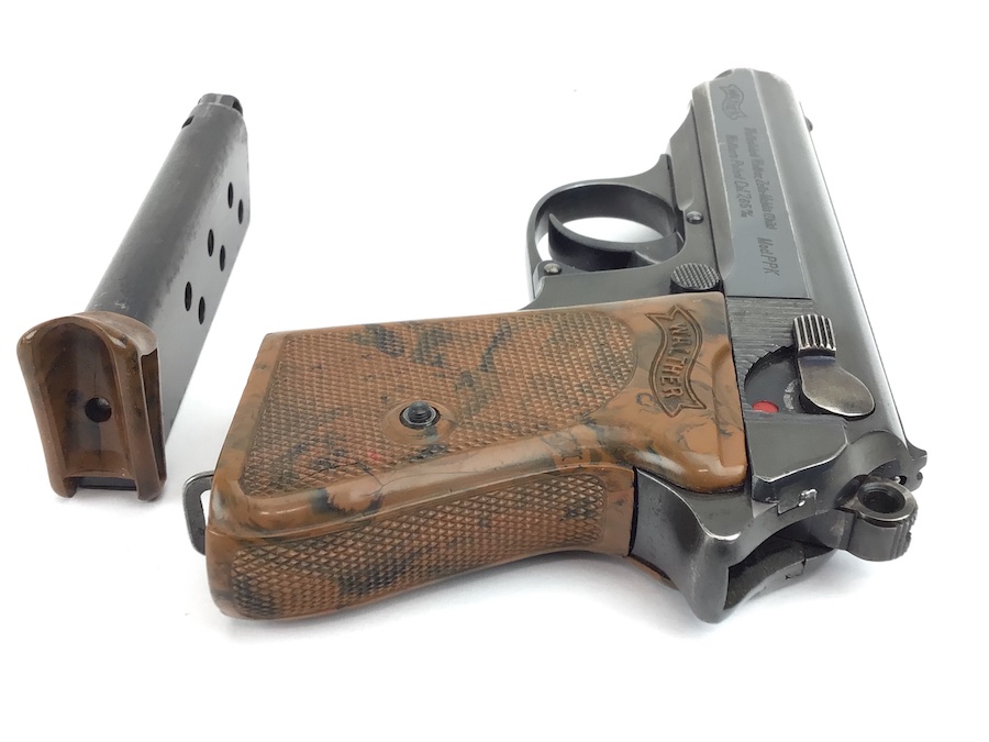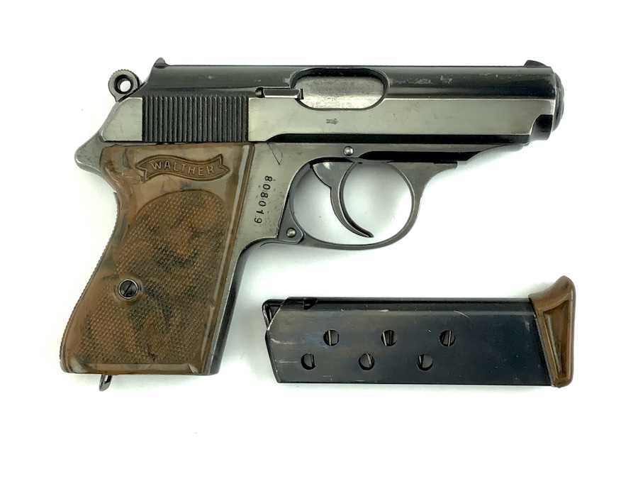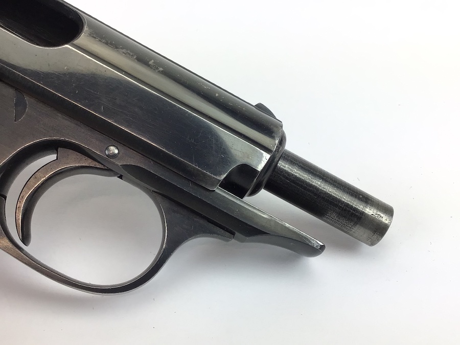 8/12/21 – Original and in great condition. Commercial Walther PPK. Finish rates about 93-94% with most wear around the muzzle and right side of the slide. Very clean front strap. Matching slide and frame. Beautiful one piece grip with only minor hairline cracks that are nearly invisible. Correct banner only magazine with thin lip finger extension. Bore is shiny with strong rifling and rates about 9 of 10.