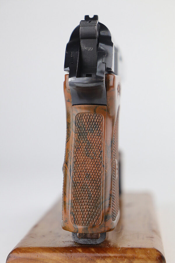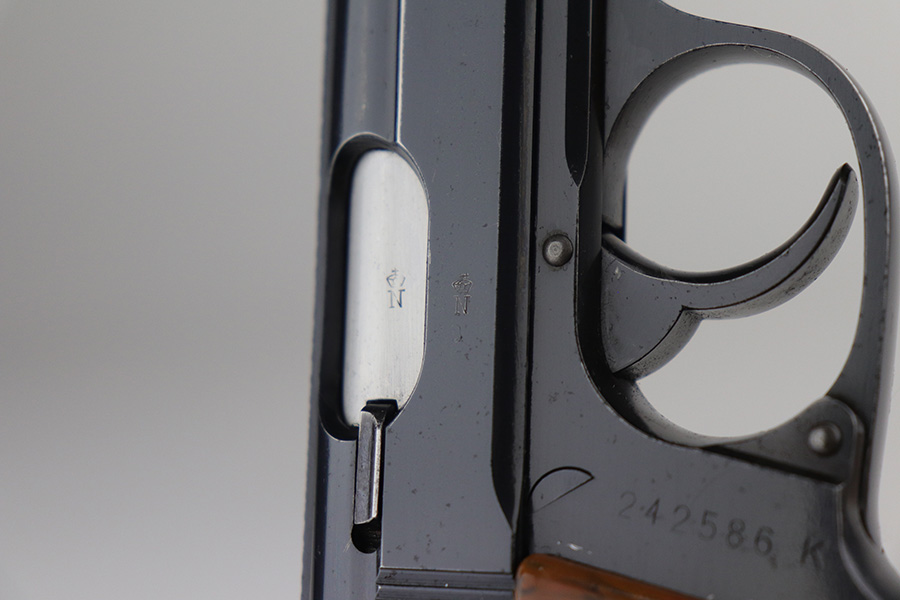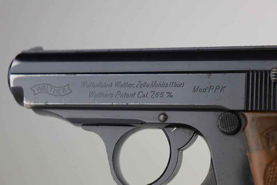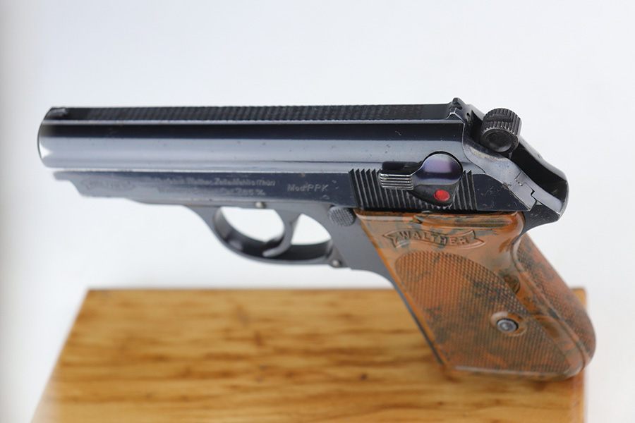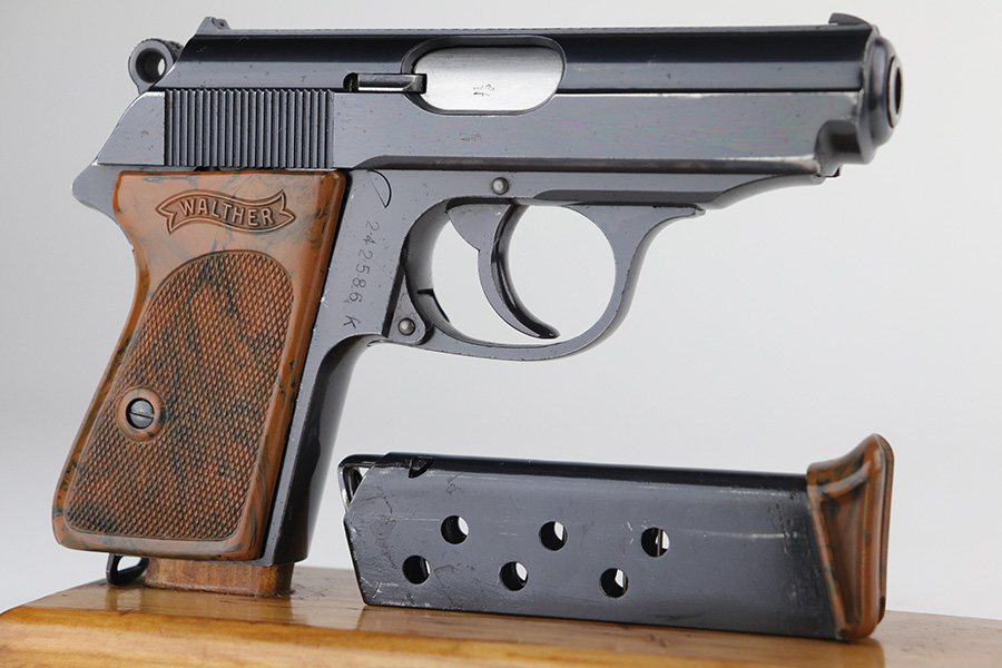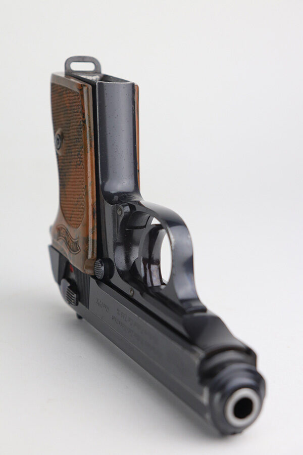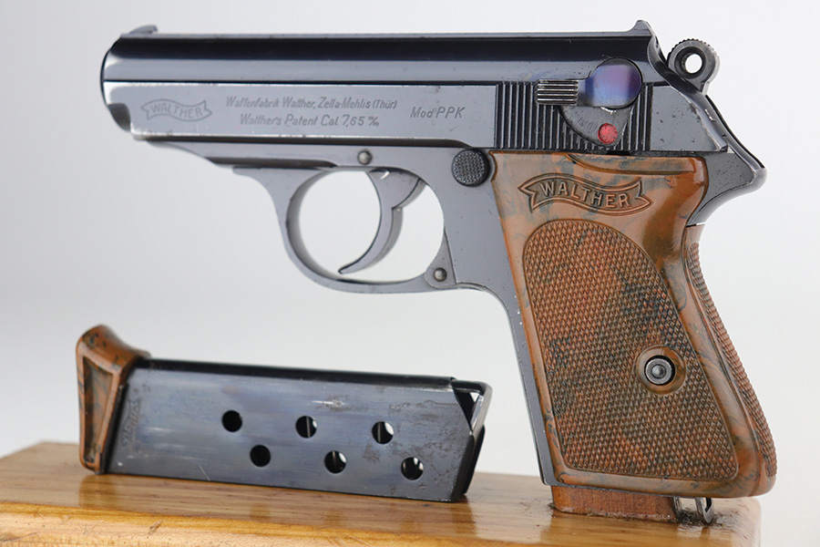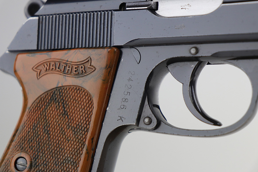 11/23/21 – This is a beautiful, near-mint example of a Walther PPK sold in the commercial market in 1939. It is all matching and has the proper “Crown N” commercial proofs. It has retained about 97% of its original high polish finish with very minor wear on the high edges of the slide, on the underside of the trigger guard, and around the muzzle. While there is very little actual finish loss, there are tiny freckles in the finish throughout. Comes with an excellent brown bakelite grip and a period-correct Walther banner-only brown finger extension magazine. Mint bore.