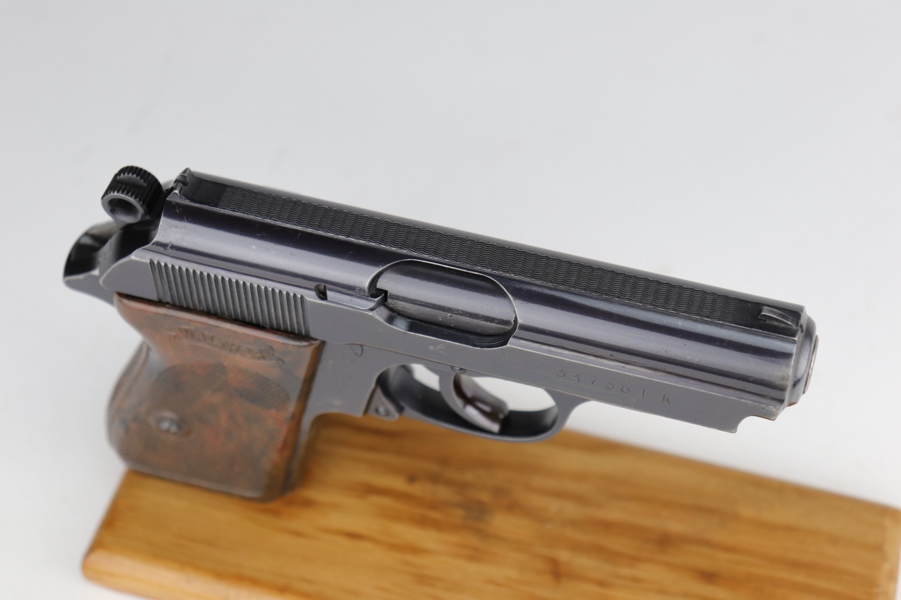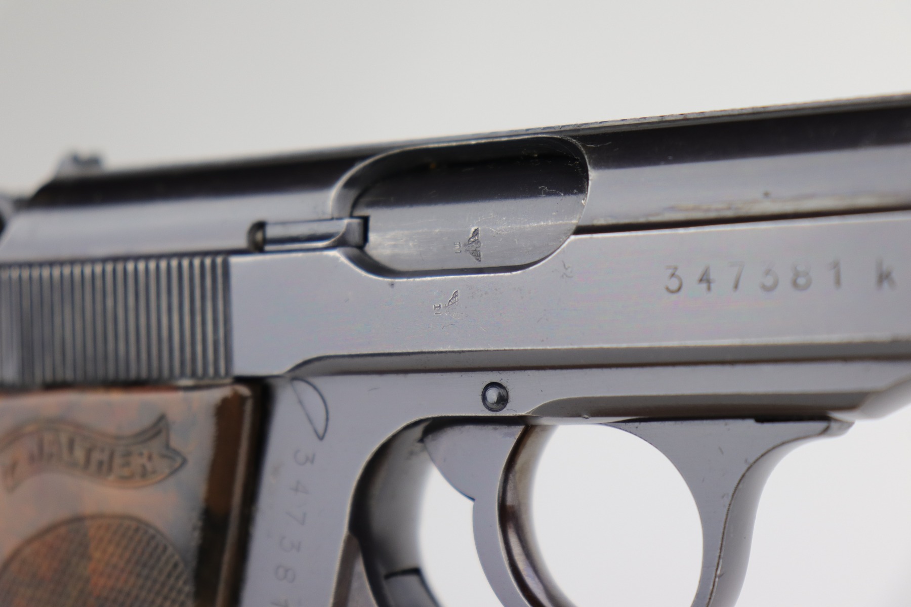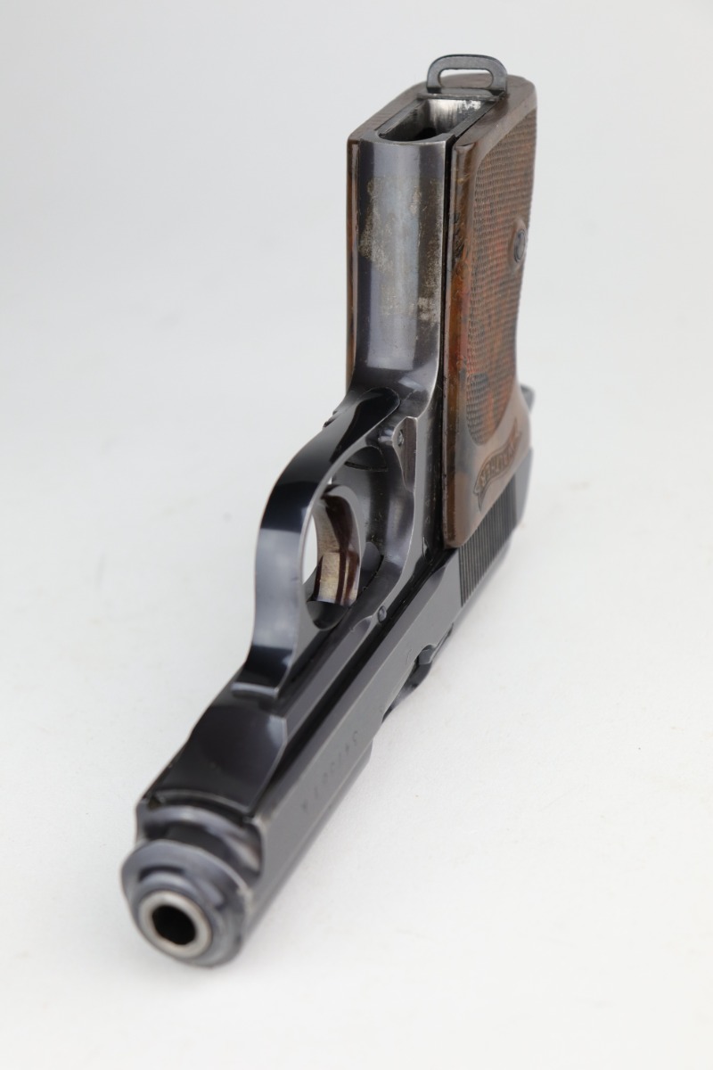 7/19/22 – This is an excellent example of a Walther PPK sold in the commercial market in 1941. It is all matching and has the proper “Eagle N” commercial proofs. It has retained about 95% of its original finish. The majority of the finish loss is on the front strap, but there is also very minor wear around the muzzle and high edges of the slide. Comes with a really nice chocolately-brown colored Walther grip with pops of red marbling on the left side. It also comes with a period-correct brown finger extension magazine with the same pops of beautiful red color. Mint bore.