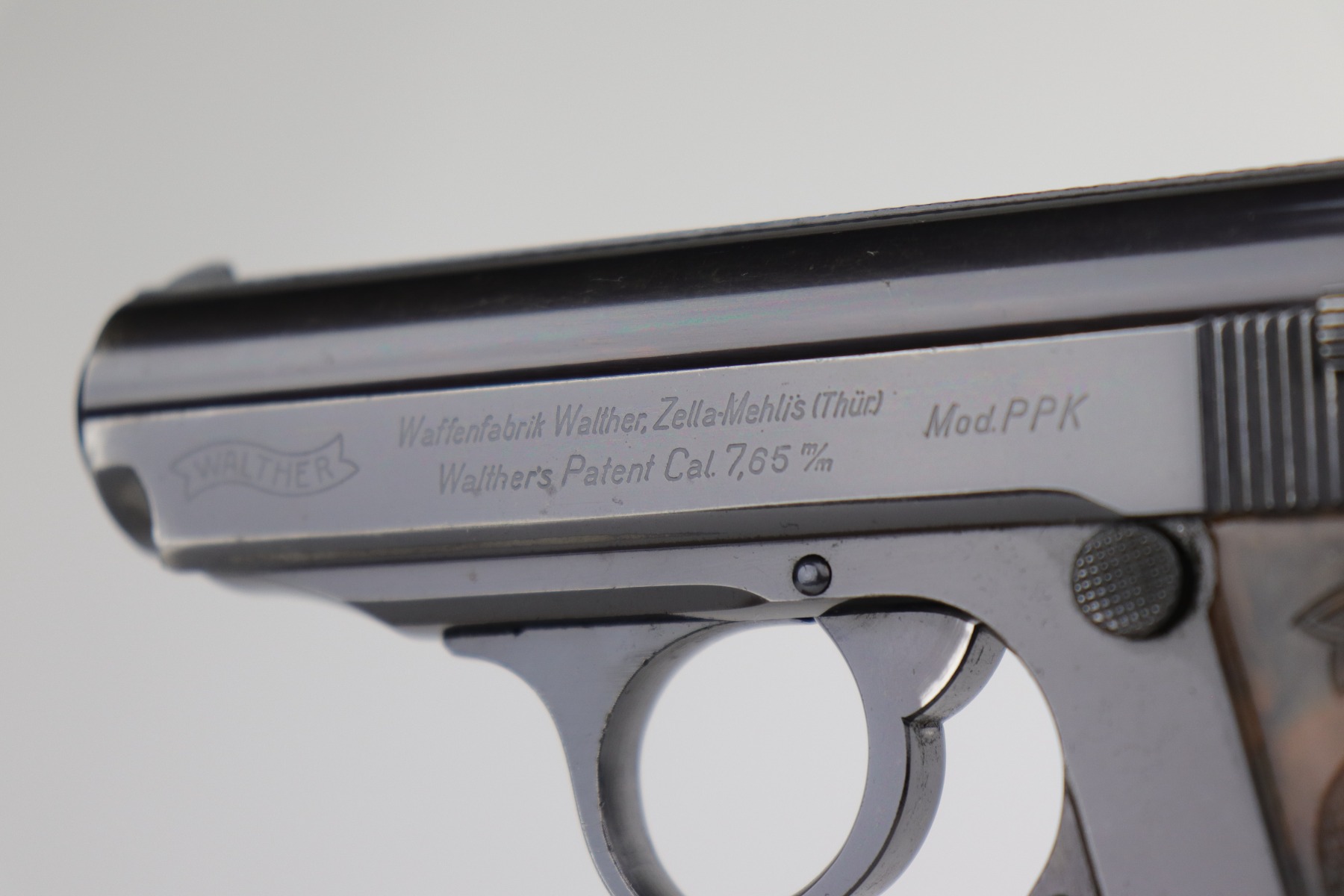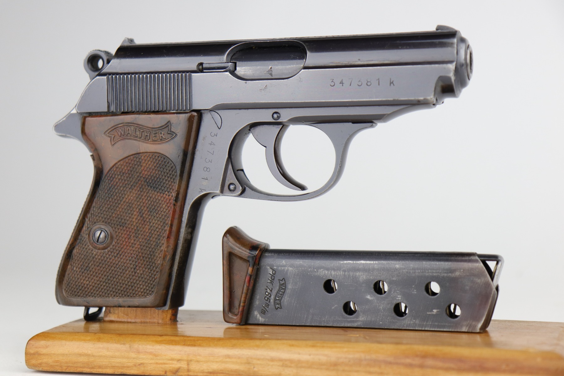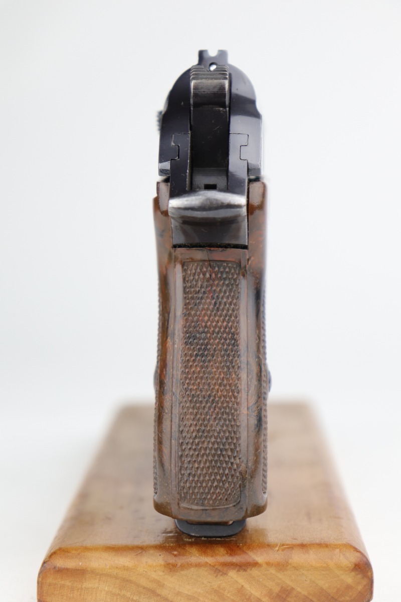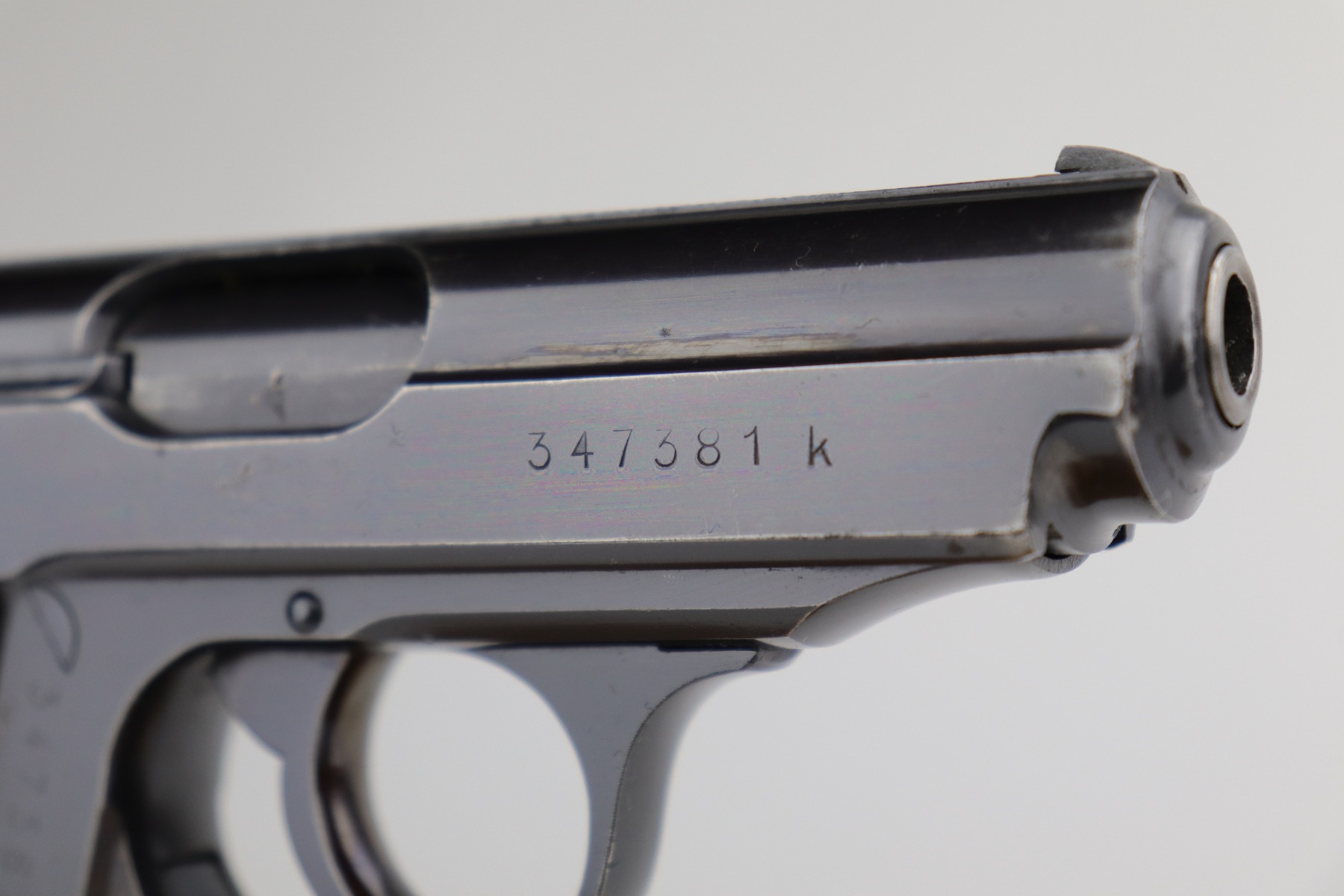 7/19/22 – This is an excellent example of a Walther PPK sold in the commercial market in 1941. It is all matching and has the proper “Eagle N” commercial proofs. It has retained about 95% of its original finish. The majority of the finish loss is on the front strap, but there is also very minor wear around the muzzle and high edges of the slide. Comes with a really nice chocolately-brown colored Walther grip with pops of red marbling on the left side. It also comes with a period-correct brown finger extension magazine with the same pops of beautiful red color. Mint bore.