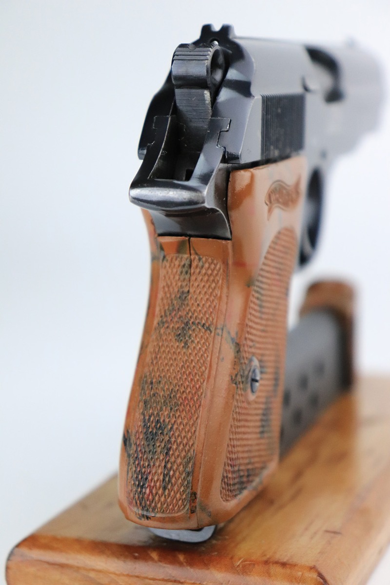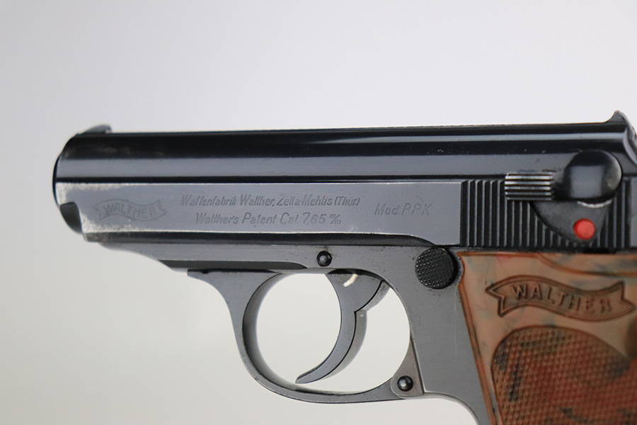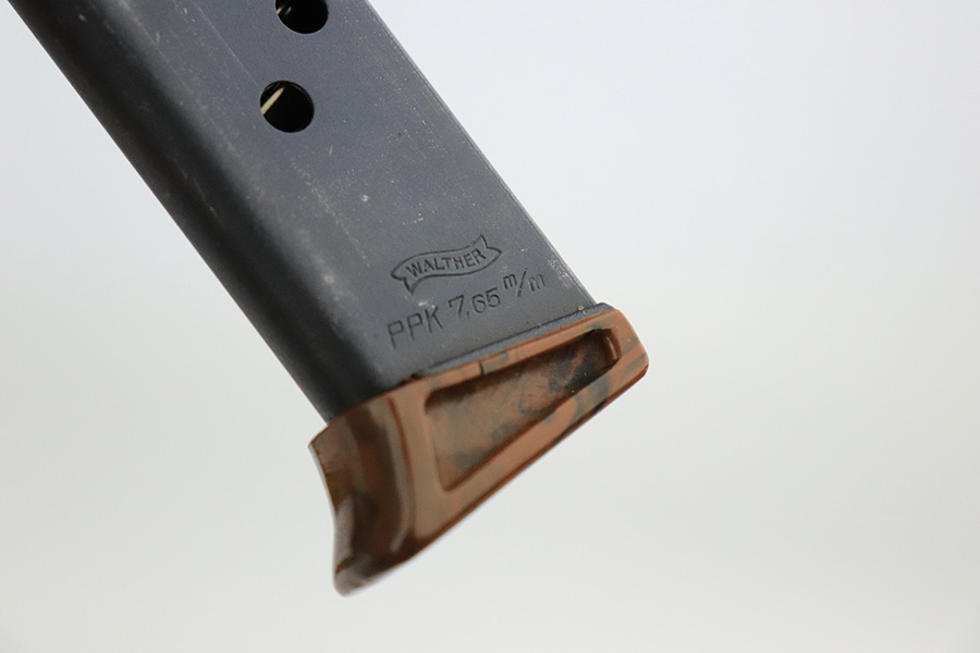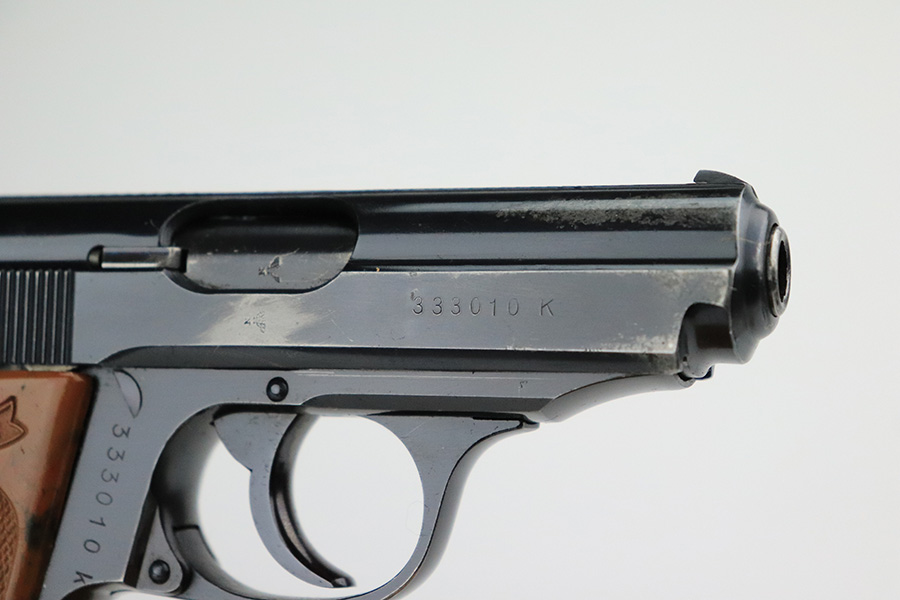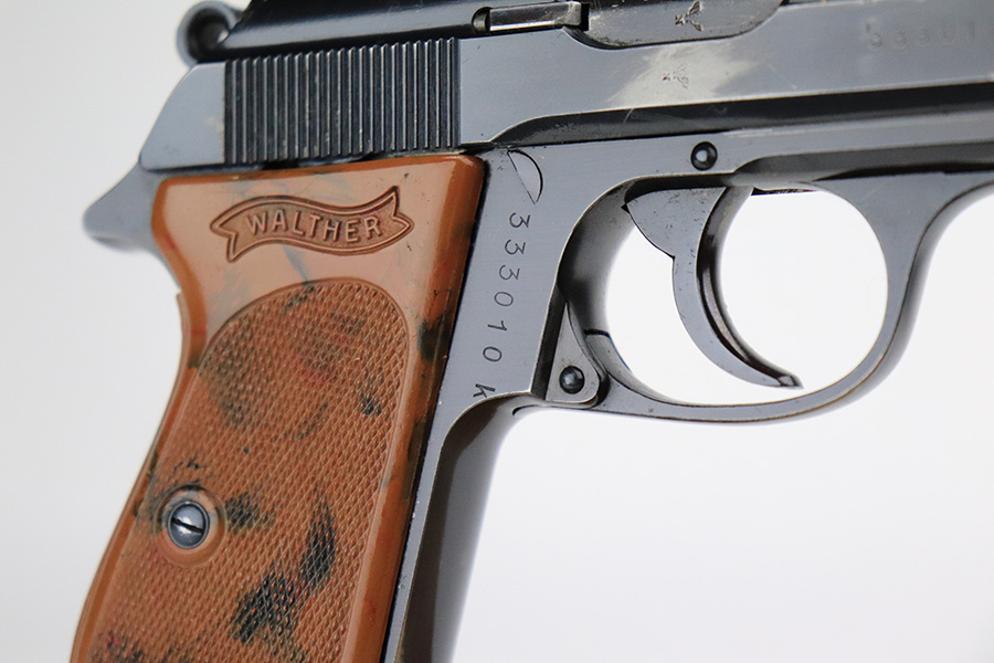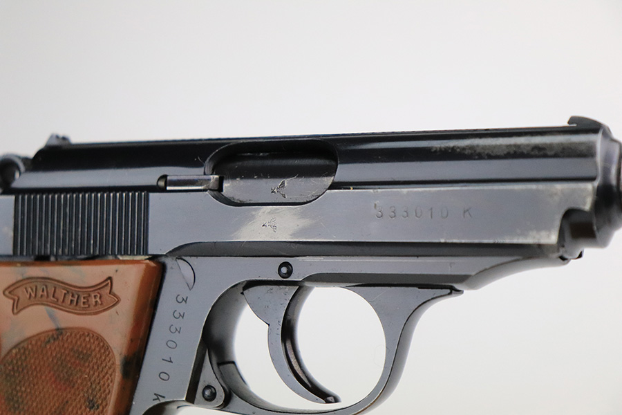 7/25/22 – This is a nice example of a Walther PPK sold in the commercial market in 1941. It is all matching and has the proper “Eagle N” commercial proofs. It has retained somewhere between 85-90% of its original high polish finish. Generally, there is splotchy discoloration and wear around the muzzle and an area of wear on the right side of the slide. A few small dots of wear on the front strap. Comes with a very nice brown Walther grip (hairline crack in the spine) and a period-correct wartime finger extension magazine (one tiny crack in the bakelite bottom). Mint bore. The hold-open does not work properly with this magazine.