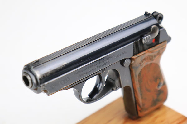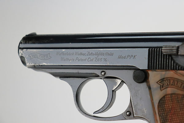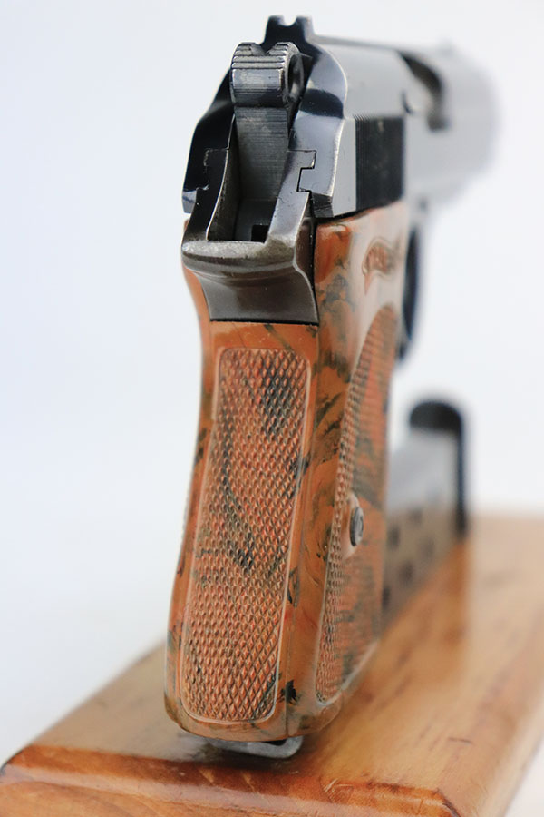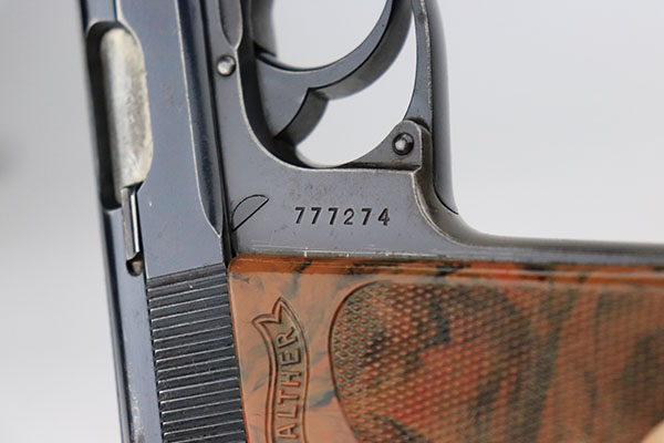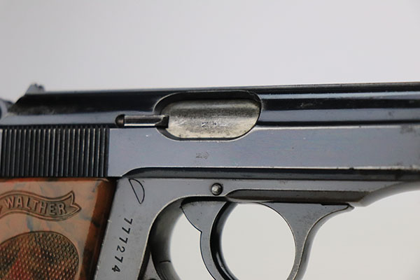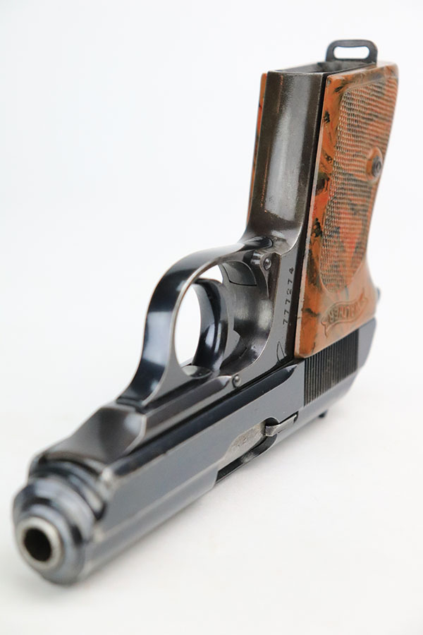 10/4/22 – This is a nice example of an early Walther PPK sold in the commercial market in 1933. It is all matching and has the proper “Crown N” commercial proofs. It has retained somewhere between 85-90% of its original high polish finish. There are areas of somewhat spotty wear around the muzzle and along the round edges and high edges of the slide. On small area on the left side of the frame. Some small dots of oxidation in those same areas. Comes with an excellent brown Walther grip and a proper Walther banner-only magazine. Mint bore.