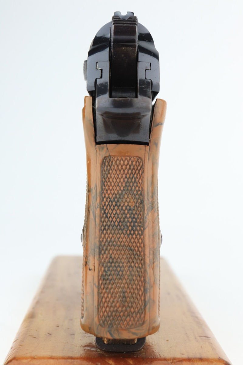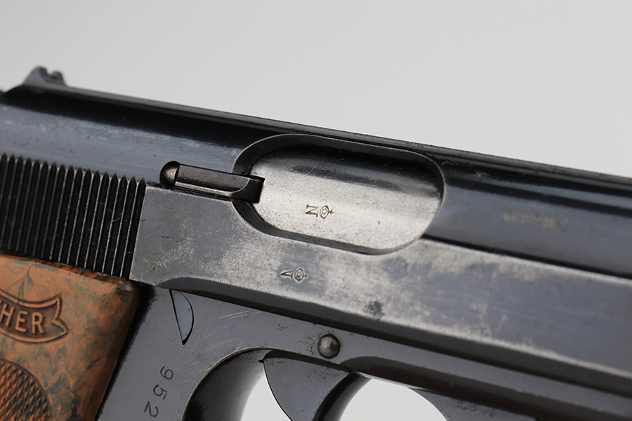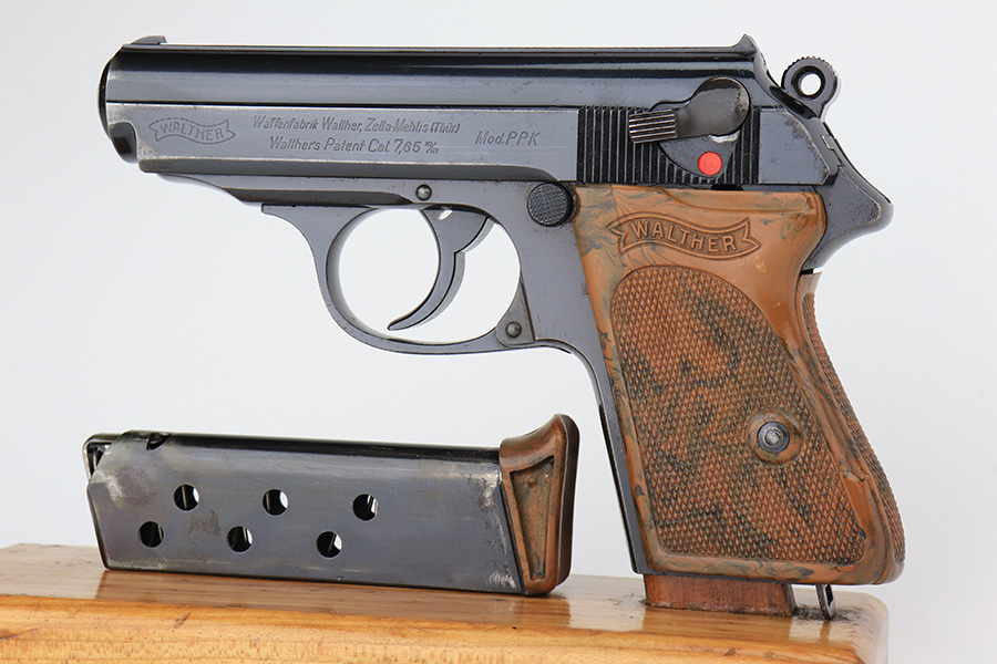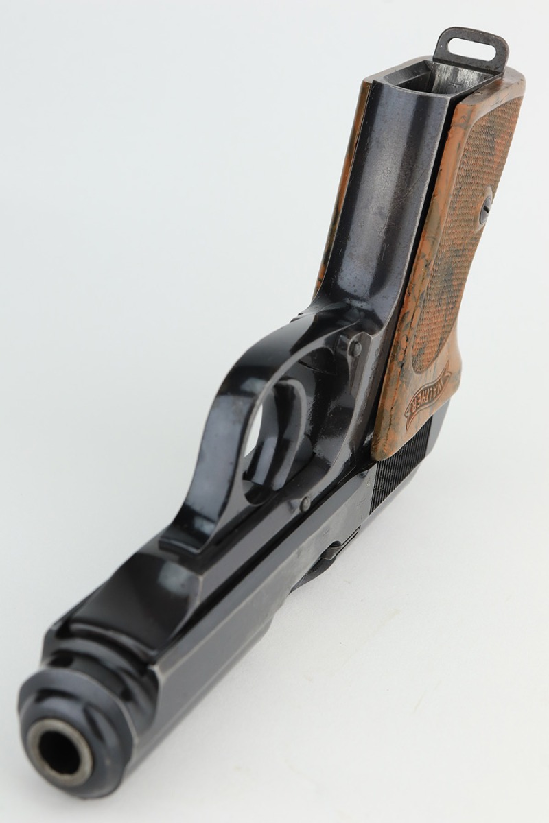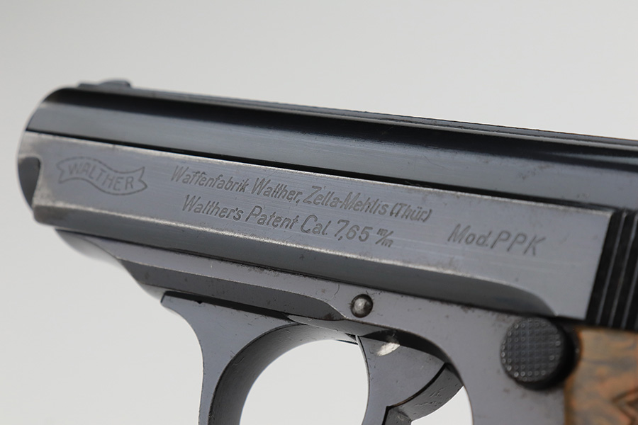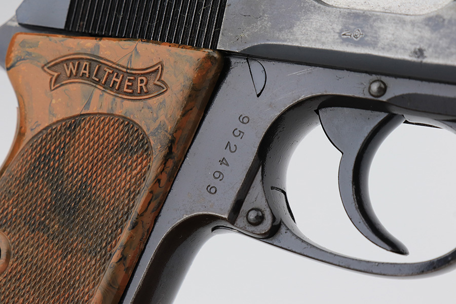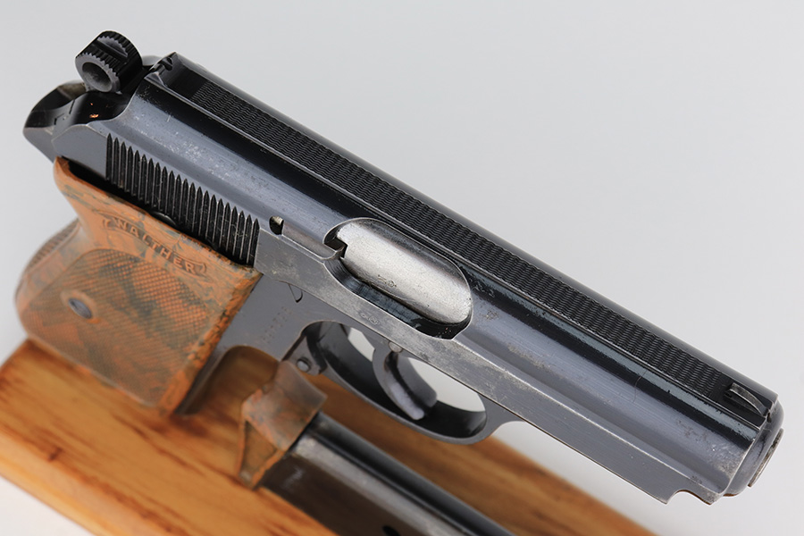 2/17/23 – This is an all original finish and matching Walther PPK. It was made in about 1937 and has a beautiful high polish finish. While the original finish covers about 90% of the gun it also has some holster wear, mostly found on the left right of the slide. The front strap has fairly nice bluing, but some thinning and surface patina from handling and age. The original grip is correct and has no significant cracks or scratches. A correct early banner only magazine with a proper finger extension is included. The bore is shiny and rates about 9 out of 10. The etching inside the slide matches the frame. Overall, an honest example of an early Commercial PPK.