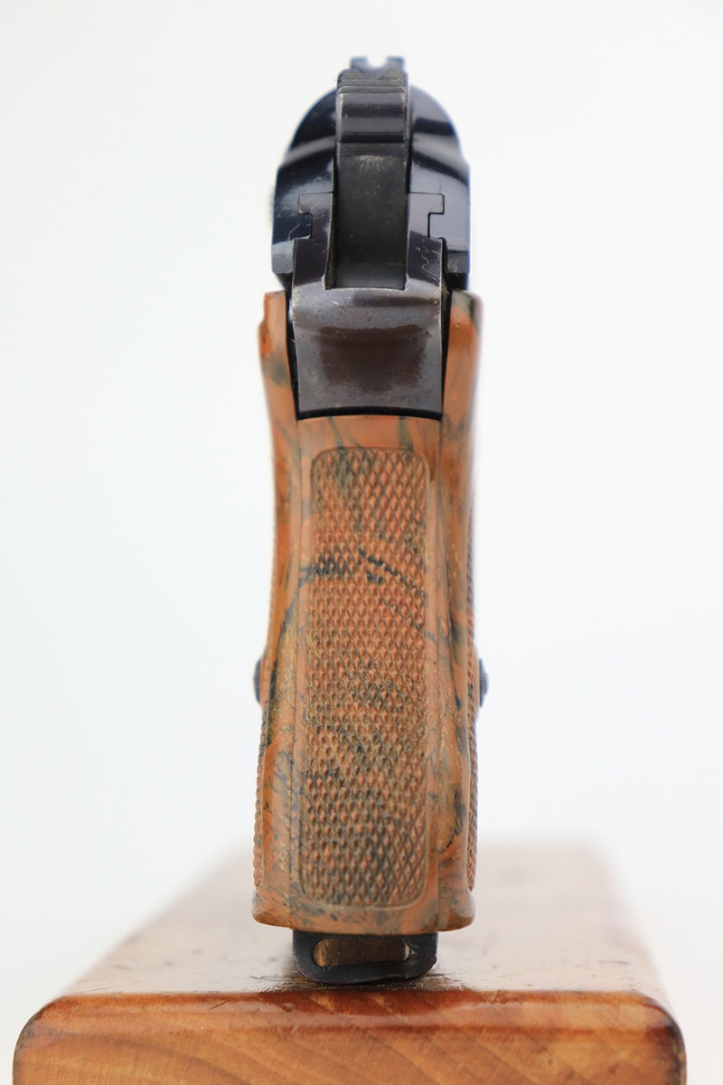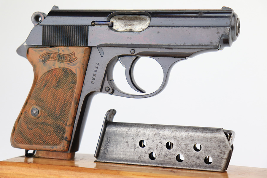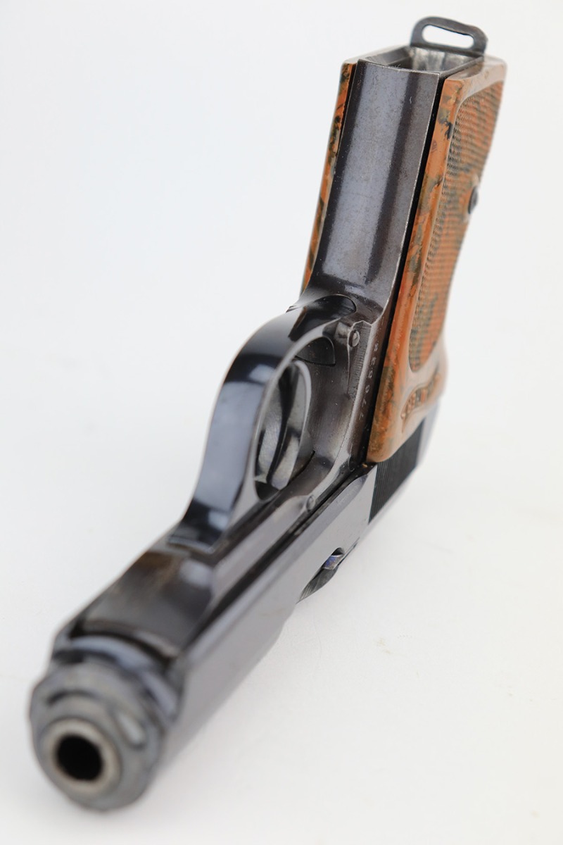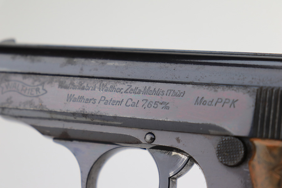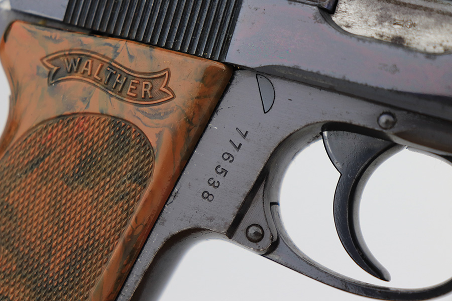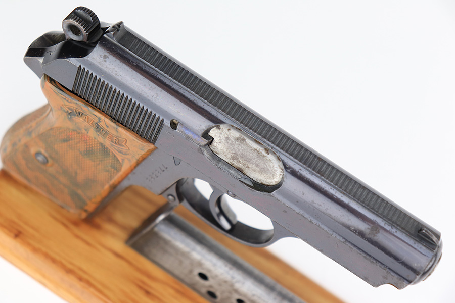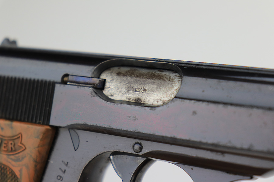 3/30/23 – This is a very nice example of a Walther PPK made in 1933 for the commercial market. Its all matching and has proper “Crown N” commercial proofs, as well as a 90-degree safety. There is almost no actual finish loss on this gun, however there is spotty oxidation and some pin pricking along both sides of the slide. The finish has a nice plum tint to it. Fitted with an excellent brown Walther grip – no cracks or chips. Comes with a period-correct magazine, but it is missing a piece of the baseplate. The bore is like new.