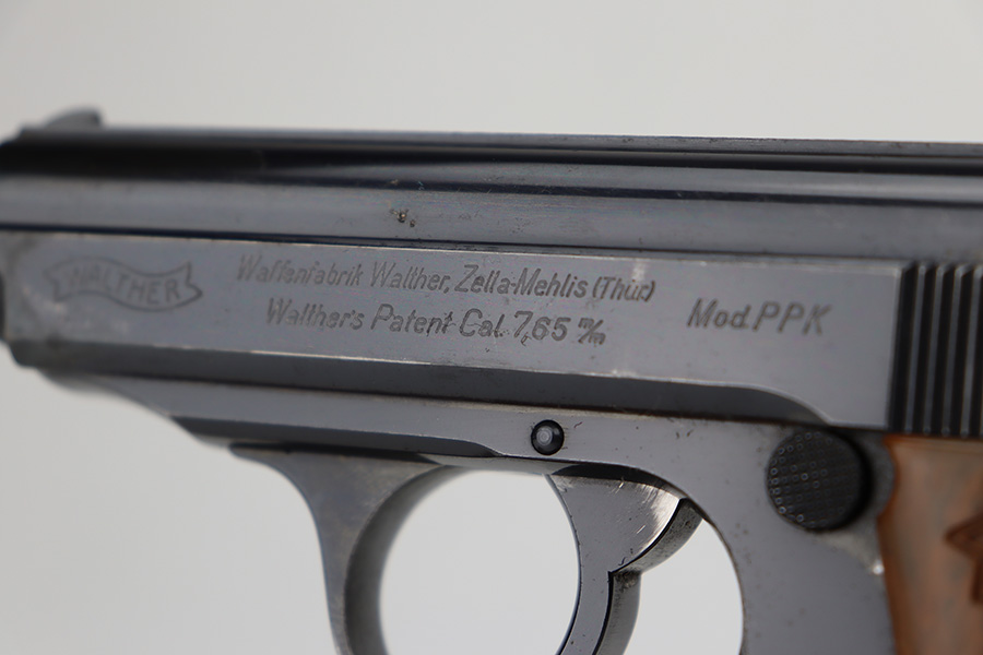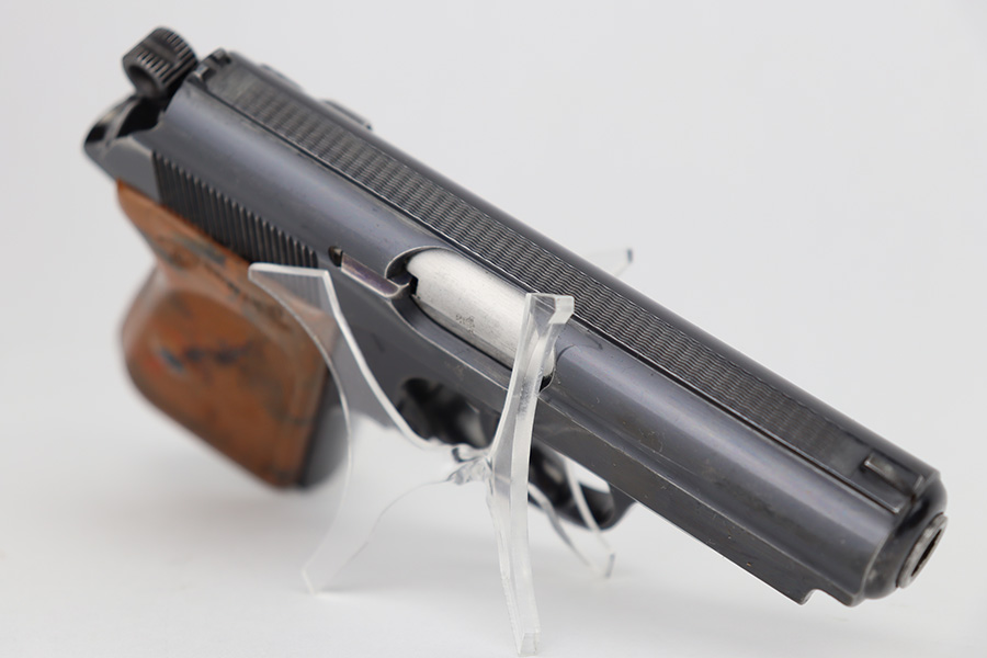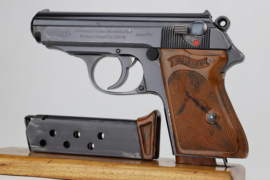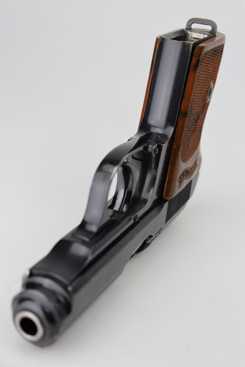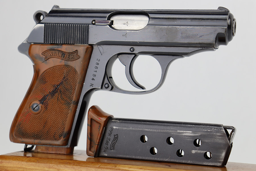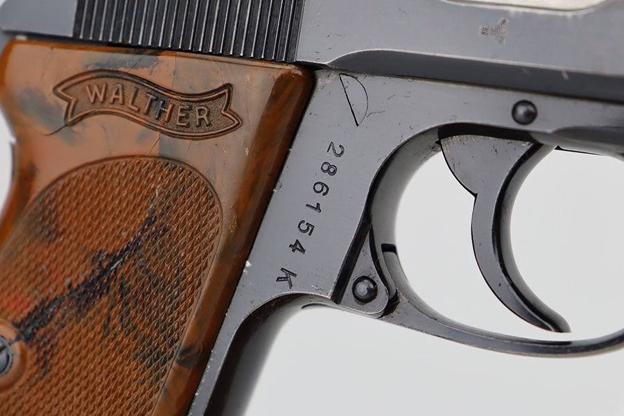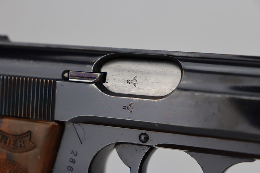 6/12/23 – This is an excellent example of a Walther PPK sold in the commercial market in 1940. It is all matching with the proper “Eagle N” commercial proofs. It has retained about 95-96% of its high polish finish. There is minor wear along both sides of the slide, concentrated mostly around the high edges. There is an area of discoloration at the right front of the slide where it looks like it was touched-up with cold-blue. Fitted with a nice brown Walther grip – hairline cracks on both sides. Comes with a proper wartime finger extension magazine. Mint bore.