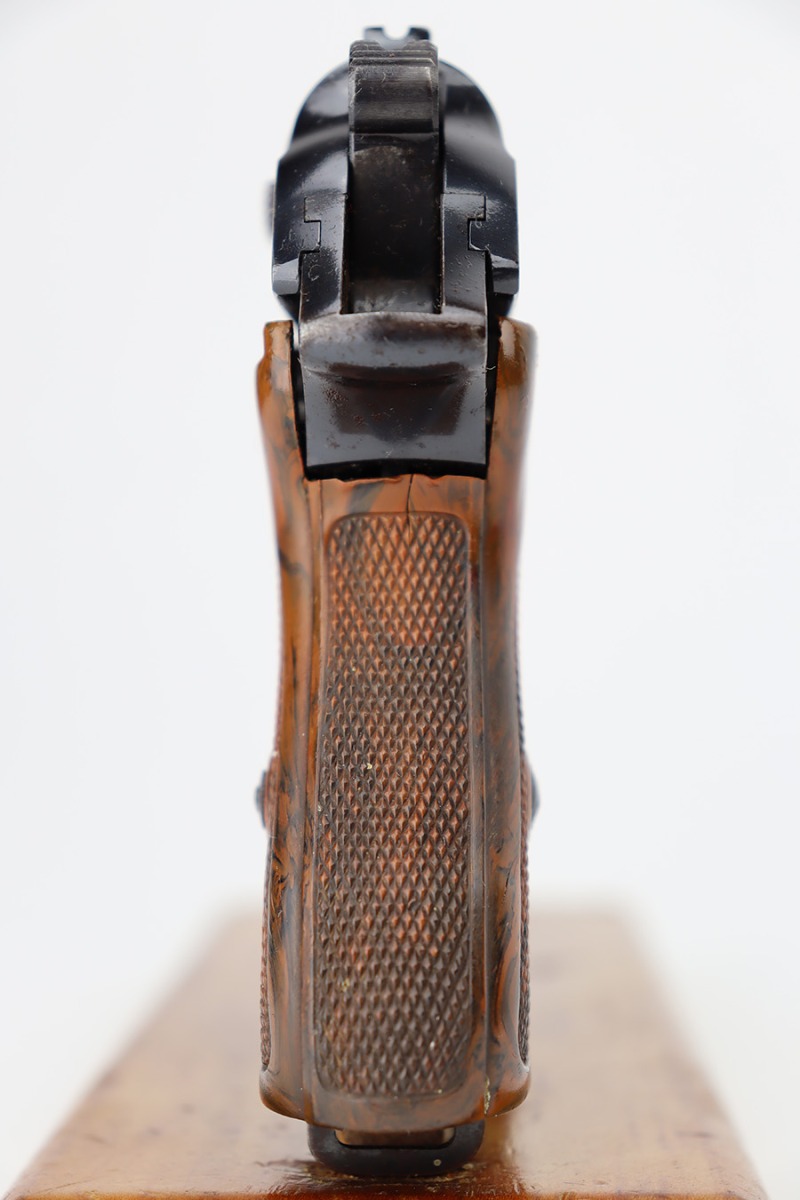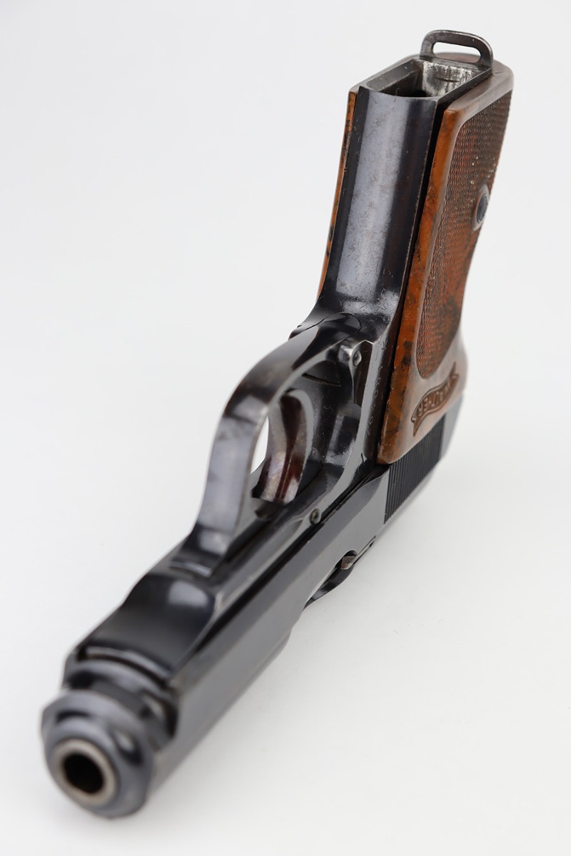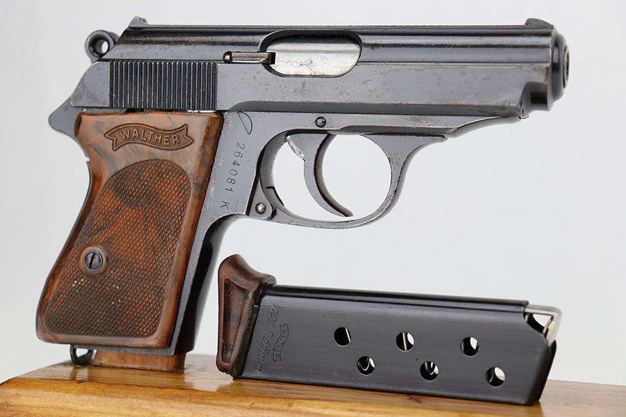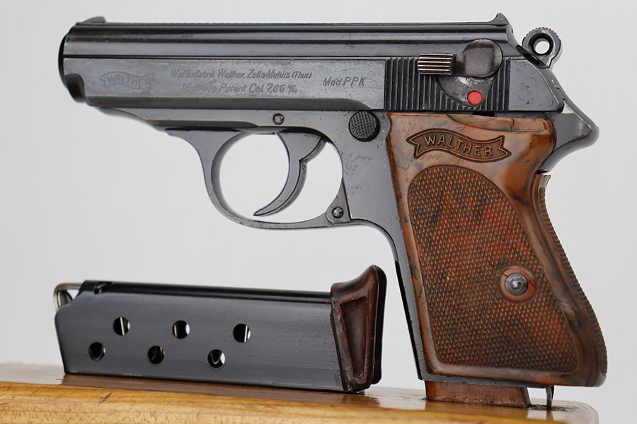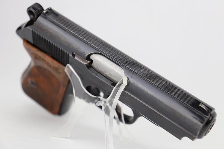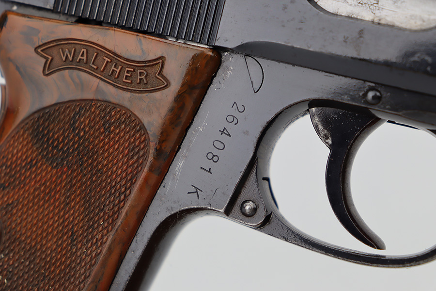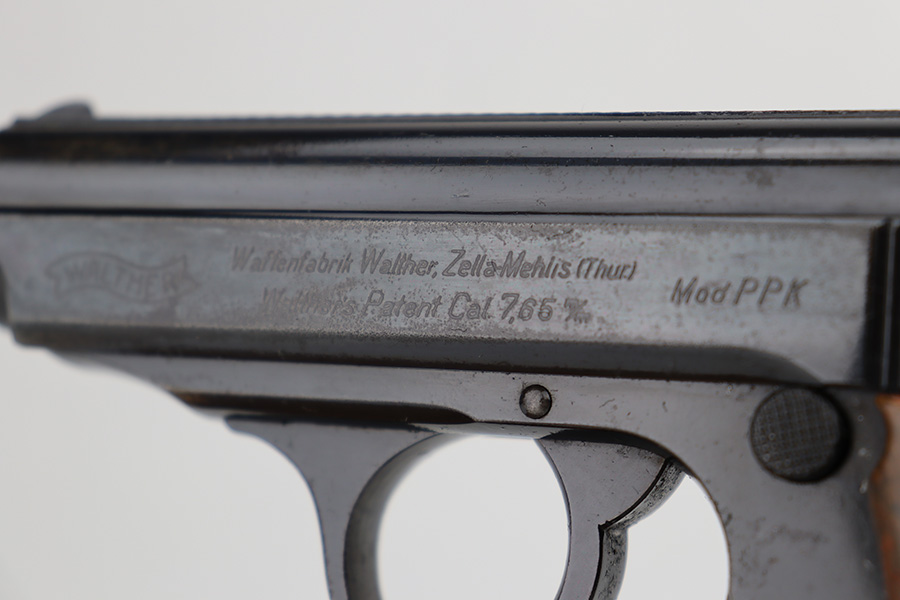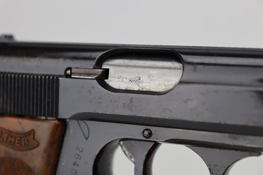 6/13/23 – This is a nice example of a Walther PPK sold in the commercial market in 1940. It is all matching and has the proper “Eagle N” commercial proofs. It has retained roughly 90% of its high polish finish. The majority of the wear comes in the form of discoloration along the round edges of the slide, especially the right side. While there isn’t a ton of actual finish loss, there are areas of spotty oxidation throughout and obvious pin-pricking on both sides of the slide, on the front strap, and on the trigger guard. Fitted with a nice period-correct brown grip – a hairline crack on the left side and a small crack in the spine. Comes with a post-war magazine. Excellent, shiny bore with great rifling.