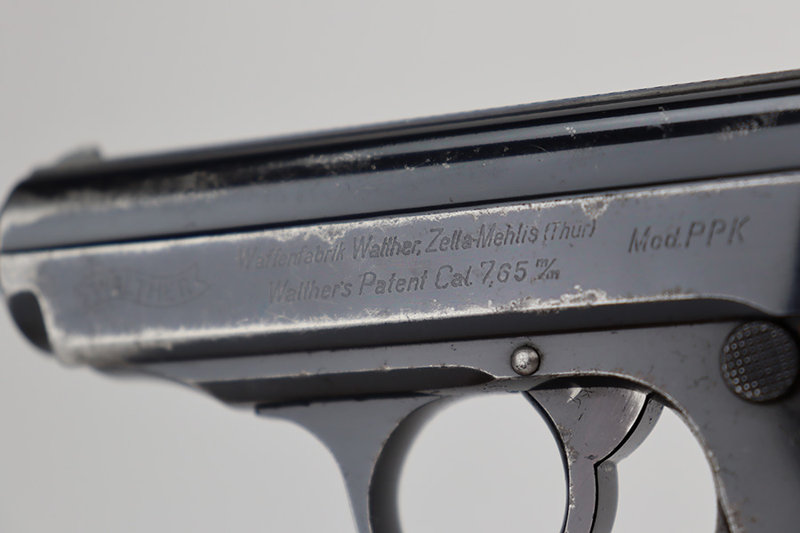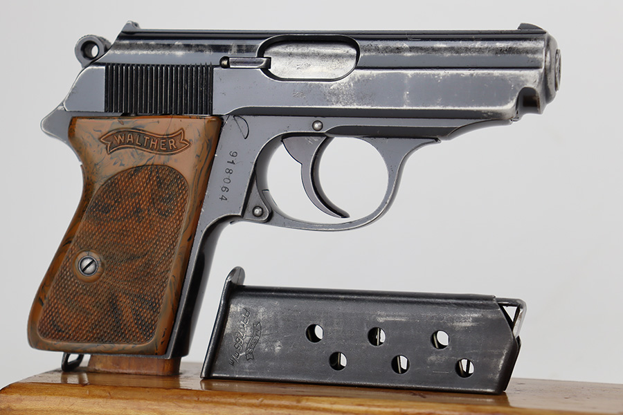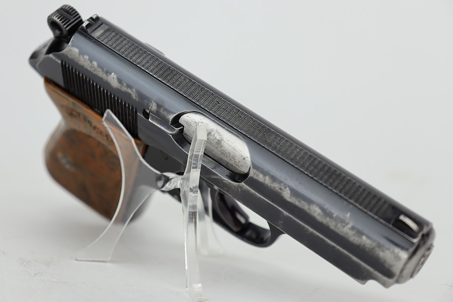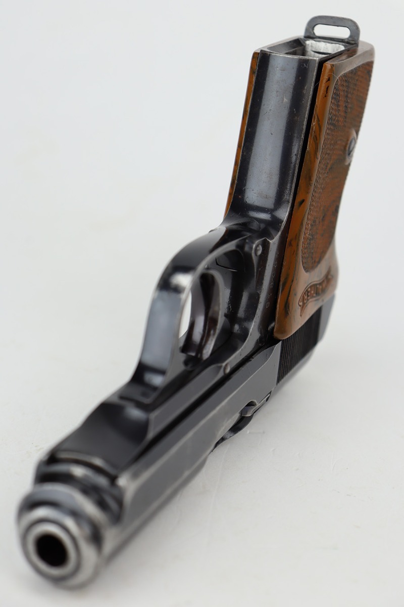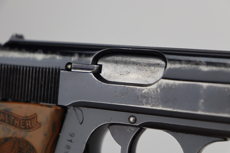 6/21/23 – This is a nice example of a Walther PPK sold in the commercial market in 1935. It is all matching and has the proper “Crown N” commercial proofs. It has retained roughly 80% of its original high polish finish. There is light spotty wear on the front strap, but the majority of the wear is along both sides of the slide, concentrated mostly around the high edges. Fitted with a nice period-correct brown Walther grip – hairline cracks on both sides. Comes with a wartime magazine. Excellent bore with strong rifling.