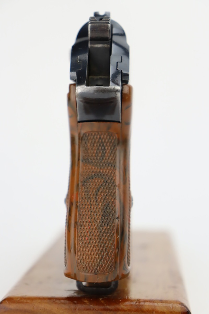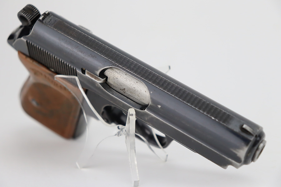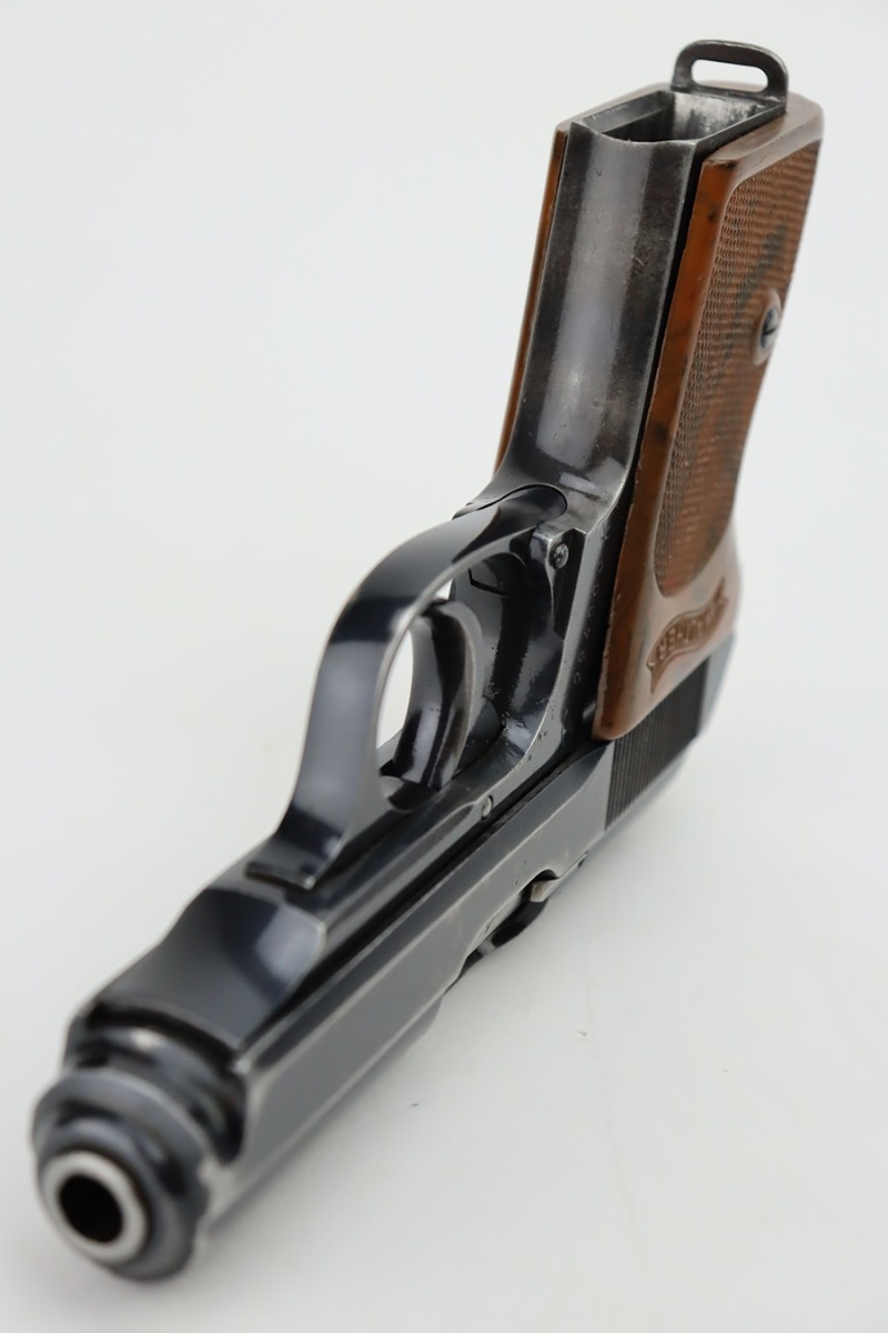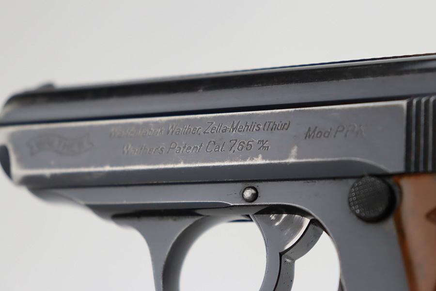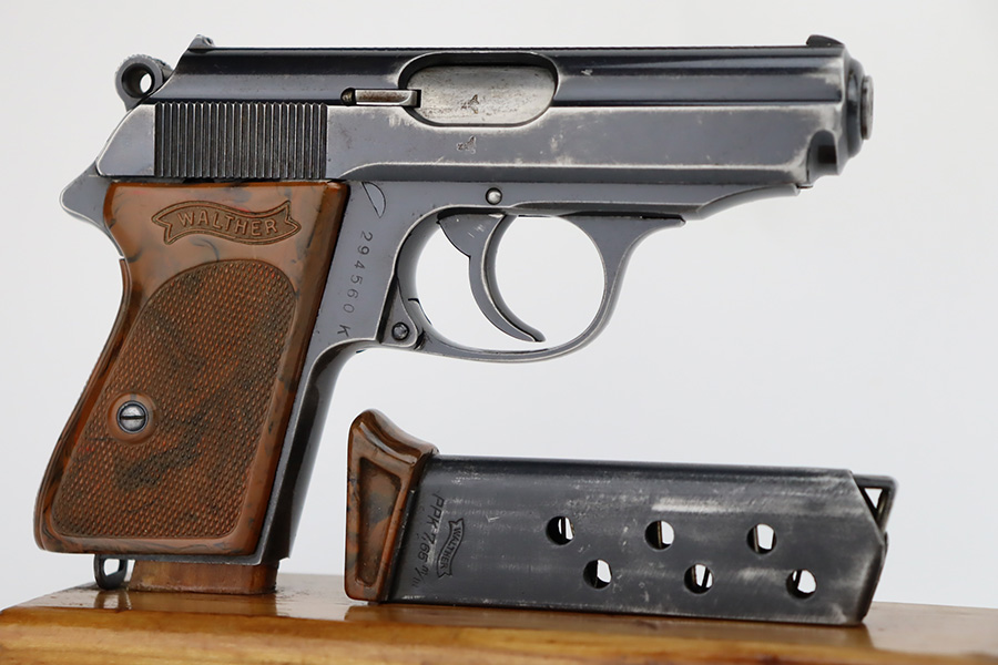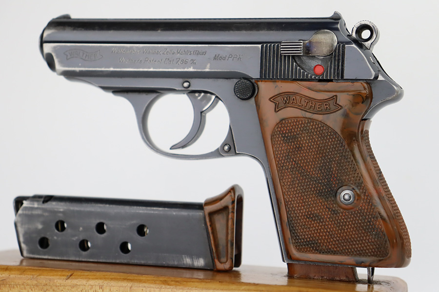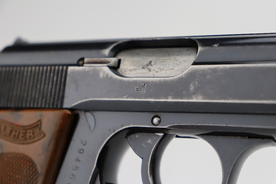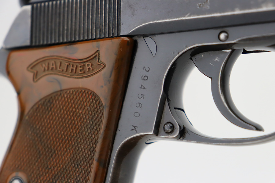 10/4/23 – This is a nice Walther PPK sold in the commercial market in 1940. It is all matching and has retained roughly 85% of its original bluing. There is wear around the muzzle and along both sides of the slide, concentrated mostly around the high edges. Minor thinning on the front strap. Excellent brown Walther grip. Comes with a period-correct finger extension magazine. Shiny bore with strong rifling, but there a couple of spots of minor freckling.