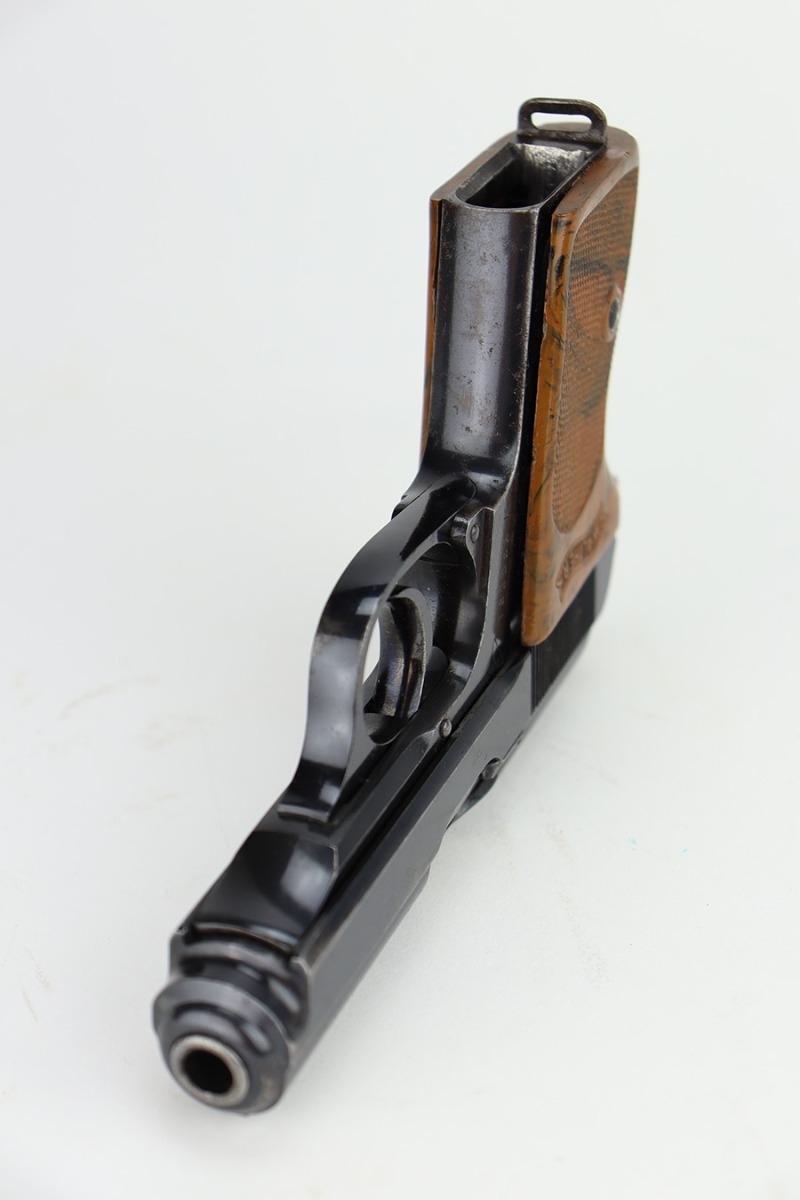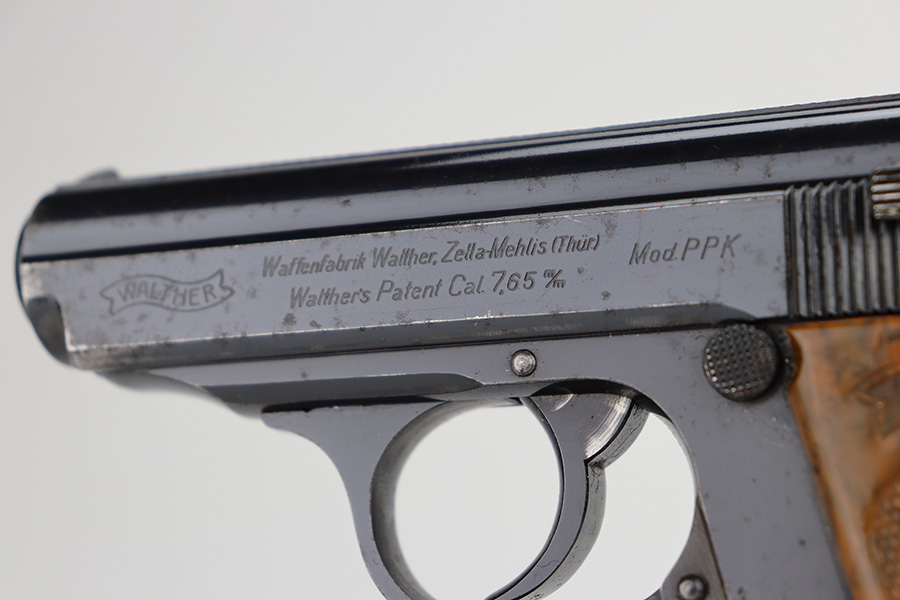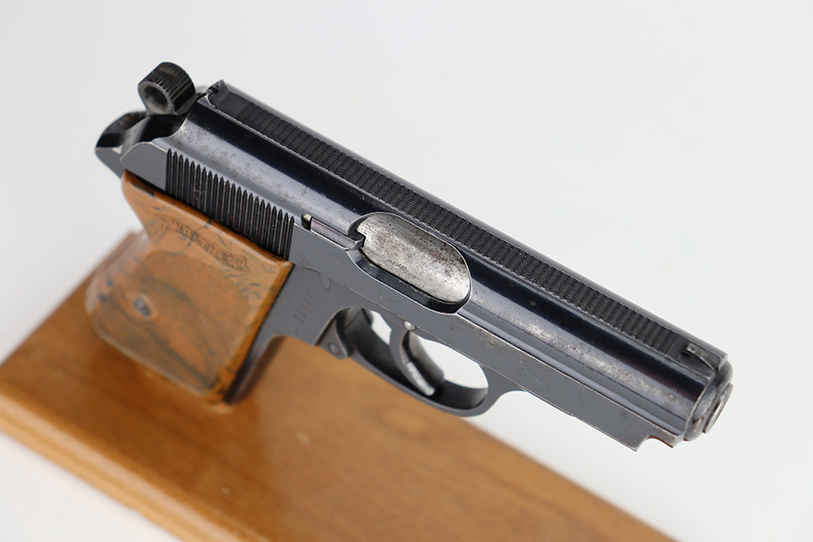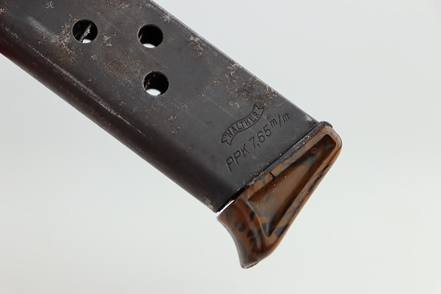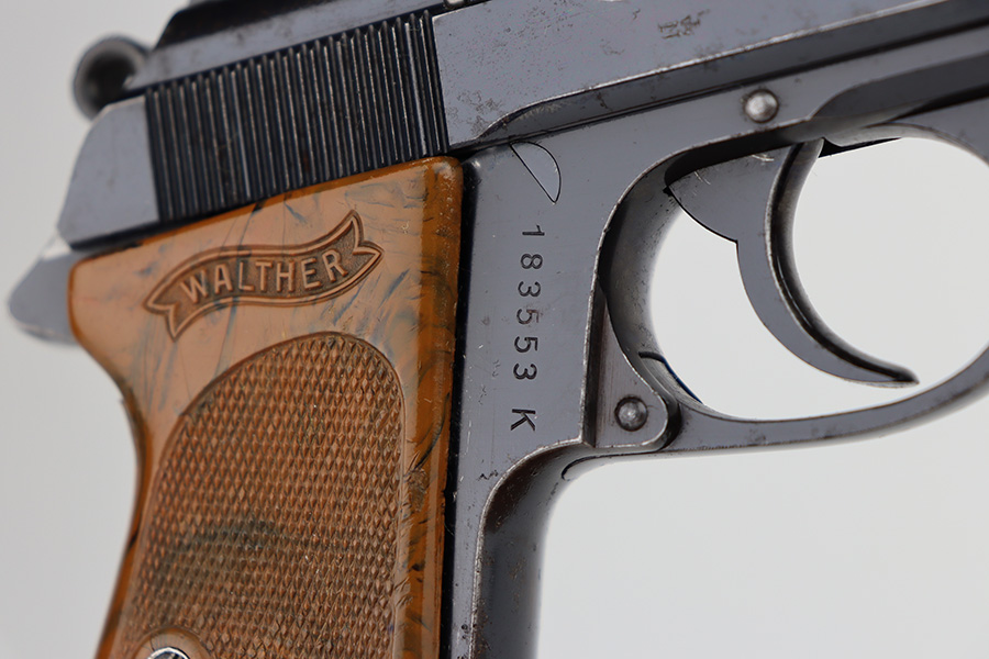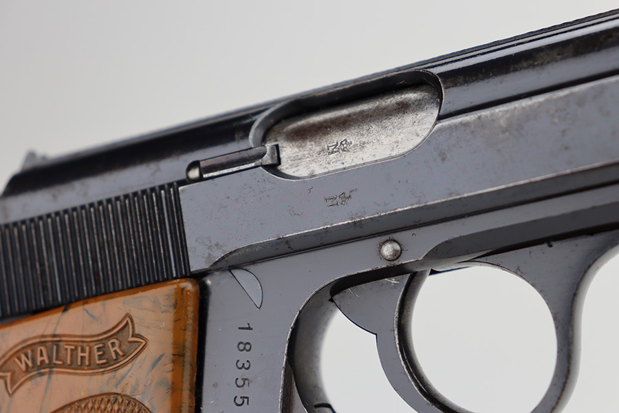 11/13/23 – This is a Walther PPK sold in the commercial market in 1938. All matching with the proper “Crown N” commercial proofs. It has retained about 95% of its original high polish finish with minor muzzle wear and wear along the right side of the slide. While there is not much actual finish loss, there is noticeable spotty oxidation throughout. Fitted with a very nice period-correct brown bakelite grip – a couple of hairline cracks on the left side. Comes with a wartime finger extension magazine. Excellent bore.