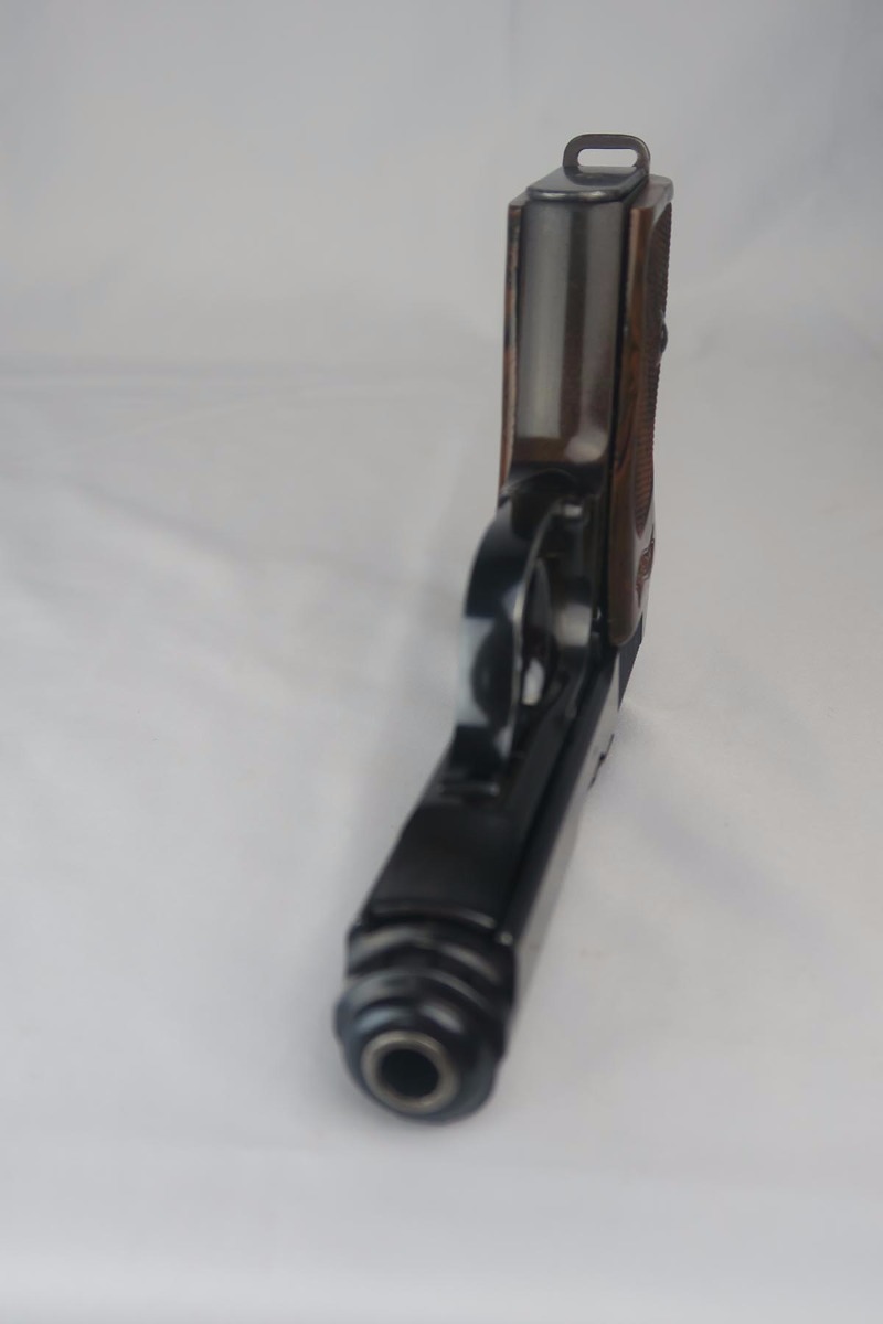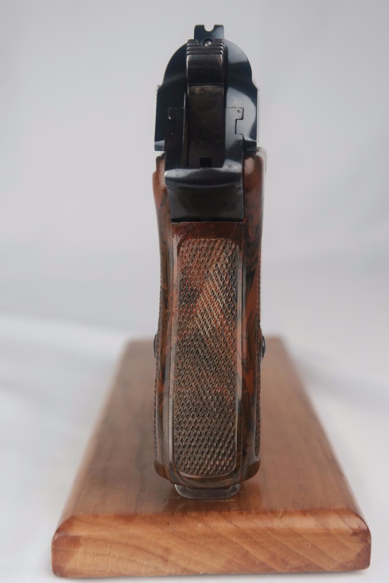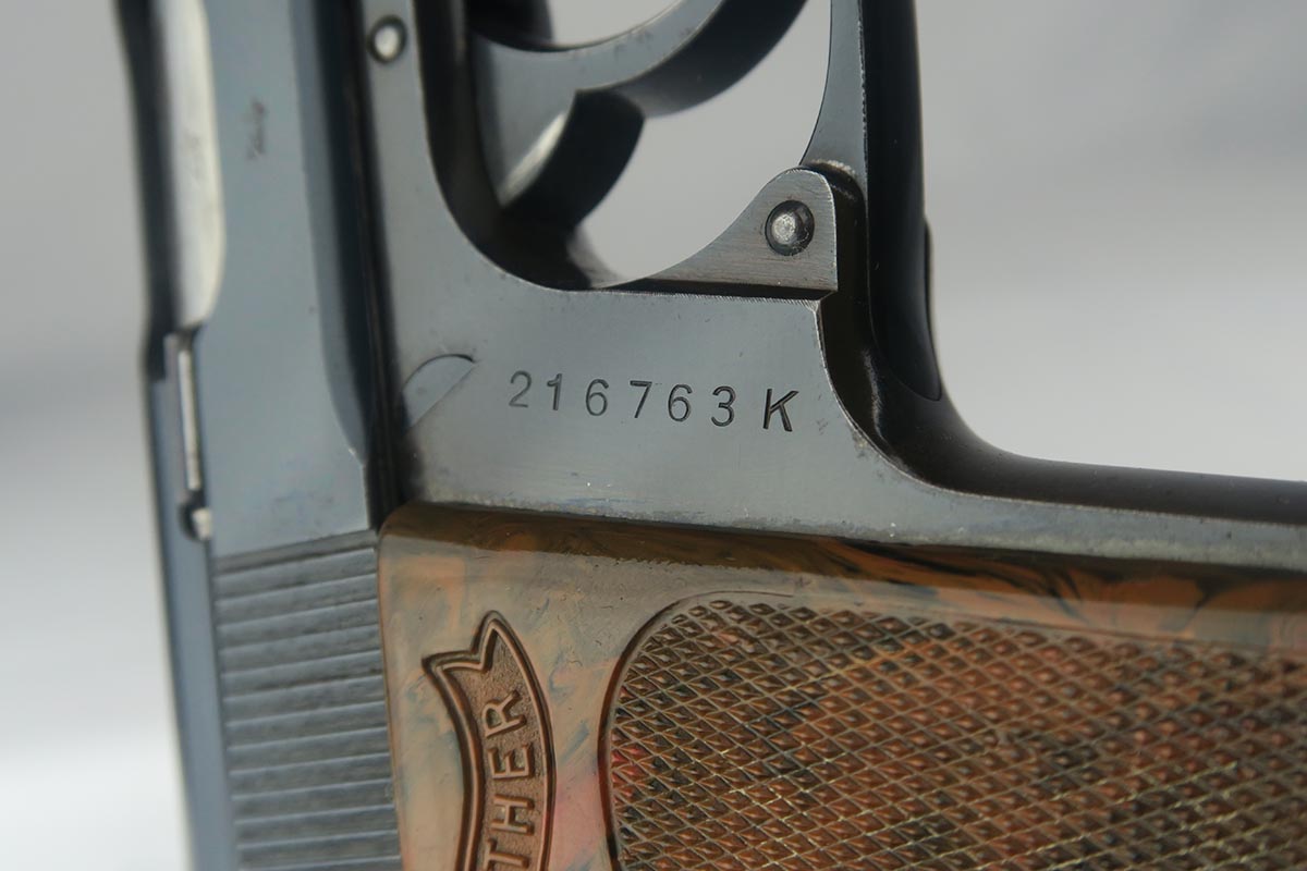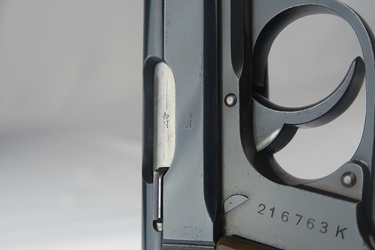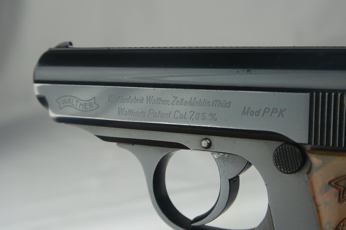 8/24/17 – This is a nice commercial Walther PPK in all original condition.  Manufactured in 1939, it has Crown/N proofs.  All parts are matching and correct.  The high-polish finish rates in the low 90’s because the front strap shows a good amount of browning.  The slide is beautiful, though.  Flat-bottom Walther banner magazine.  Excellent grip and mint bore.