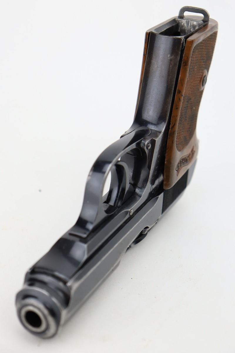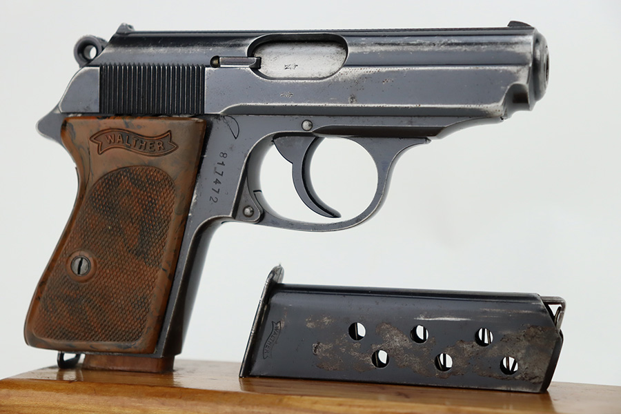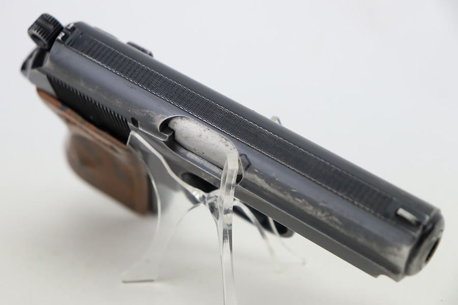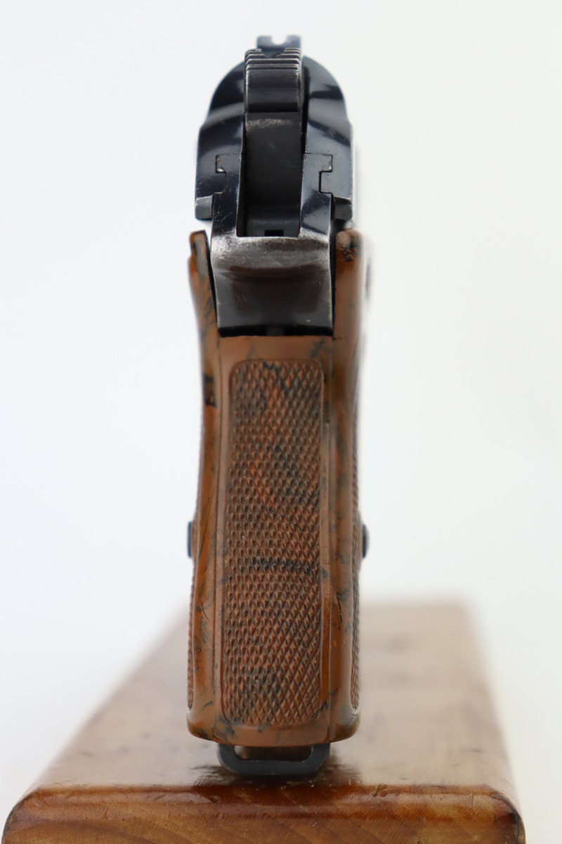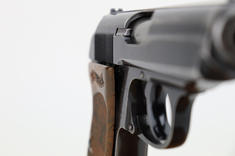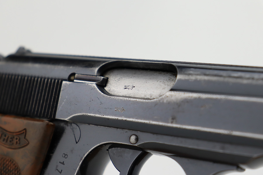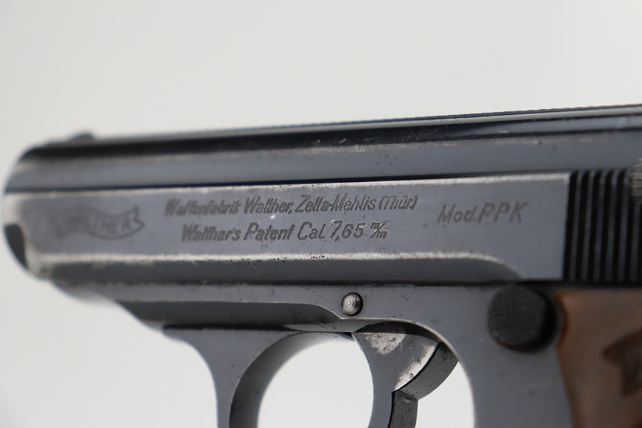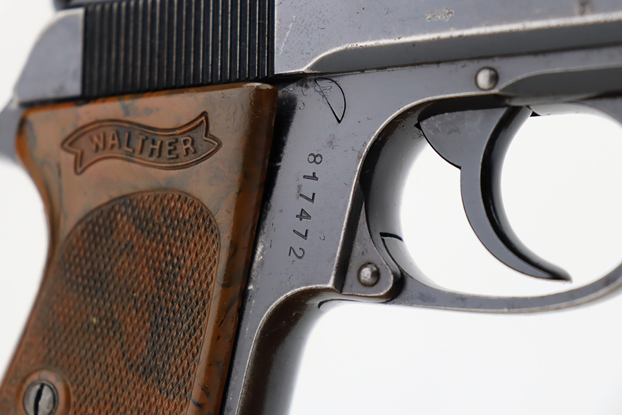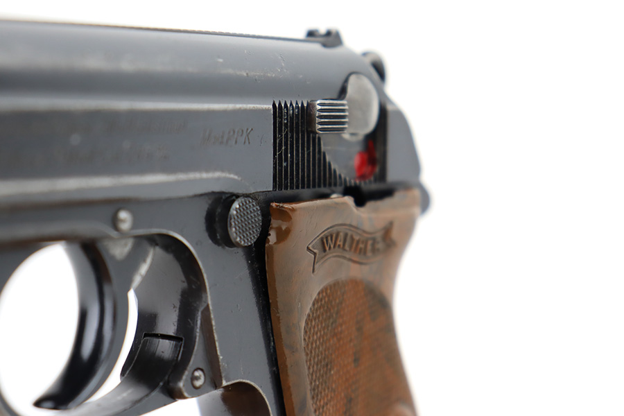 12/27/23 – This is a Walther PPK sold in the commercial market in 1934. All matching and “Crown N” proofed. The original high polish finish rates roughly 85% with minor thinning on the front strap and noticeable wear along both sides of the slide. Fitted with a period-correct grip – there is warping and chipping on the left side. Comes with a Walther banner-only magazine. Minty bore.