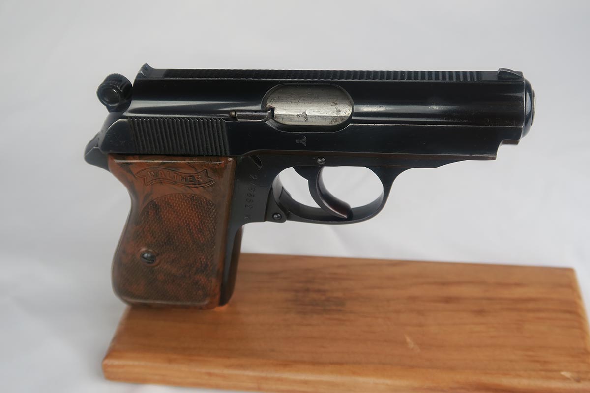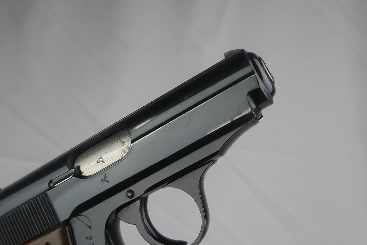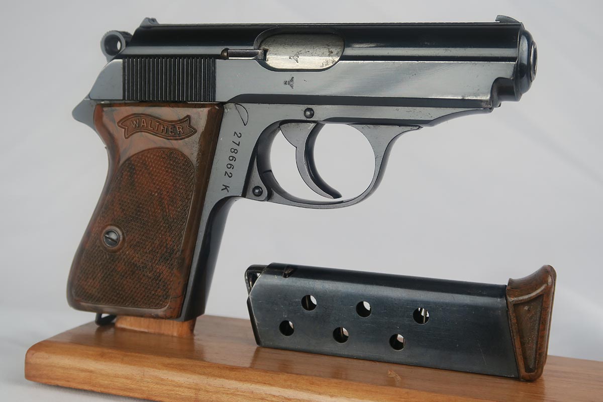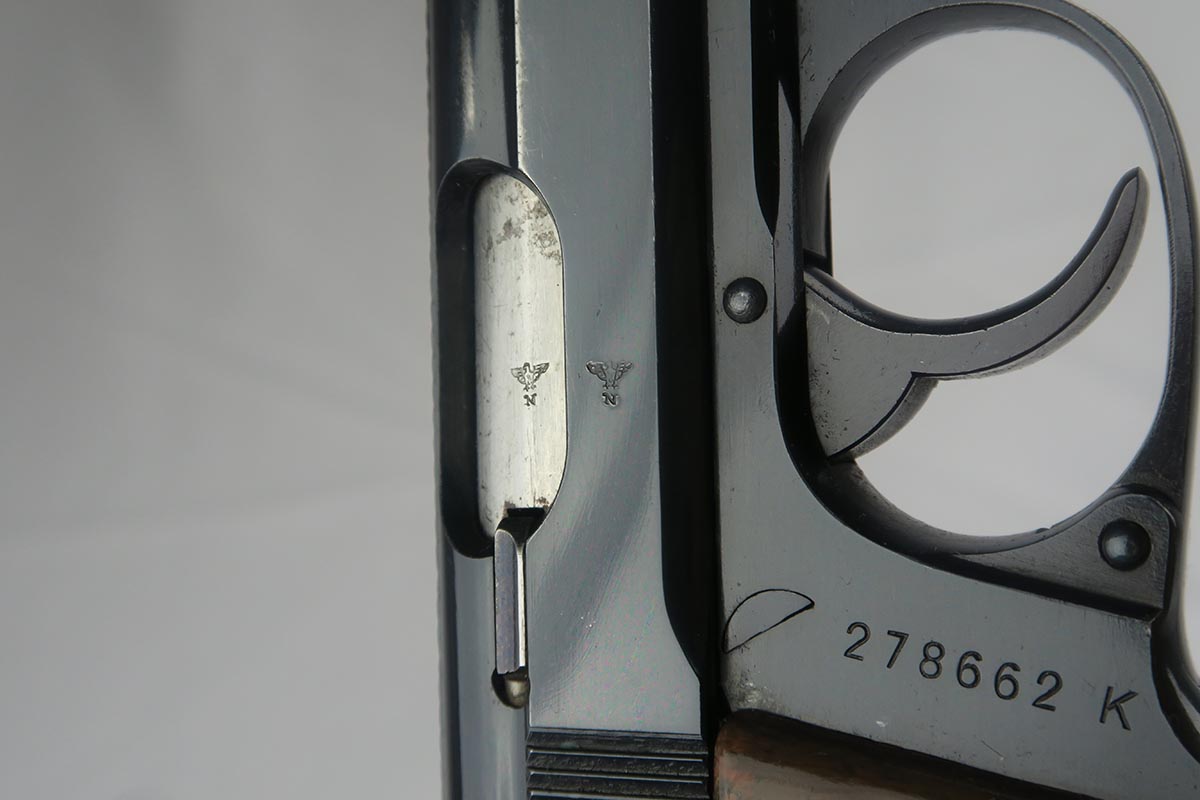 9/12/17 – This is a very nice, all original Walther PPK from the World War II era. Serial on this one dates it to about 1940, and it appropriately has Eagle/N proofs on slide and frame, as well as 60 degree safety. High-polish blue rates at about 96% with some muzzle wear, as well as a spot of finish loss on the trigger guard and in front of the ejection port. Excellent grip and finger extension magazine with no chips or cracks. Excellent bore, as well.
