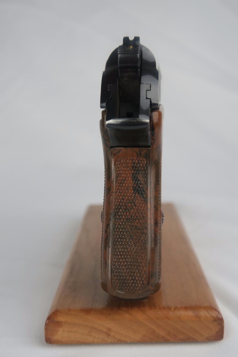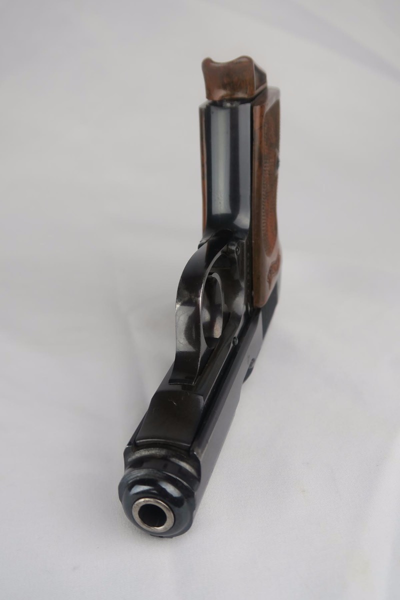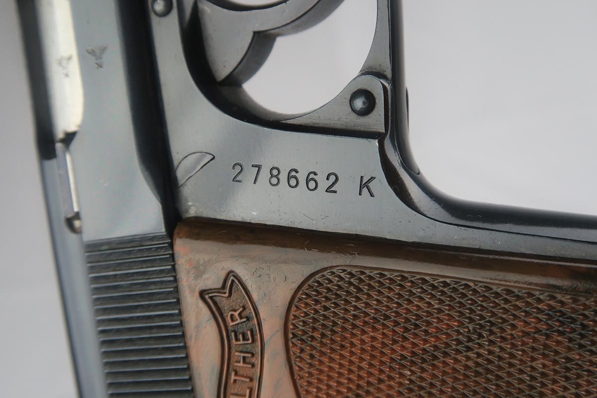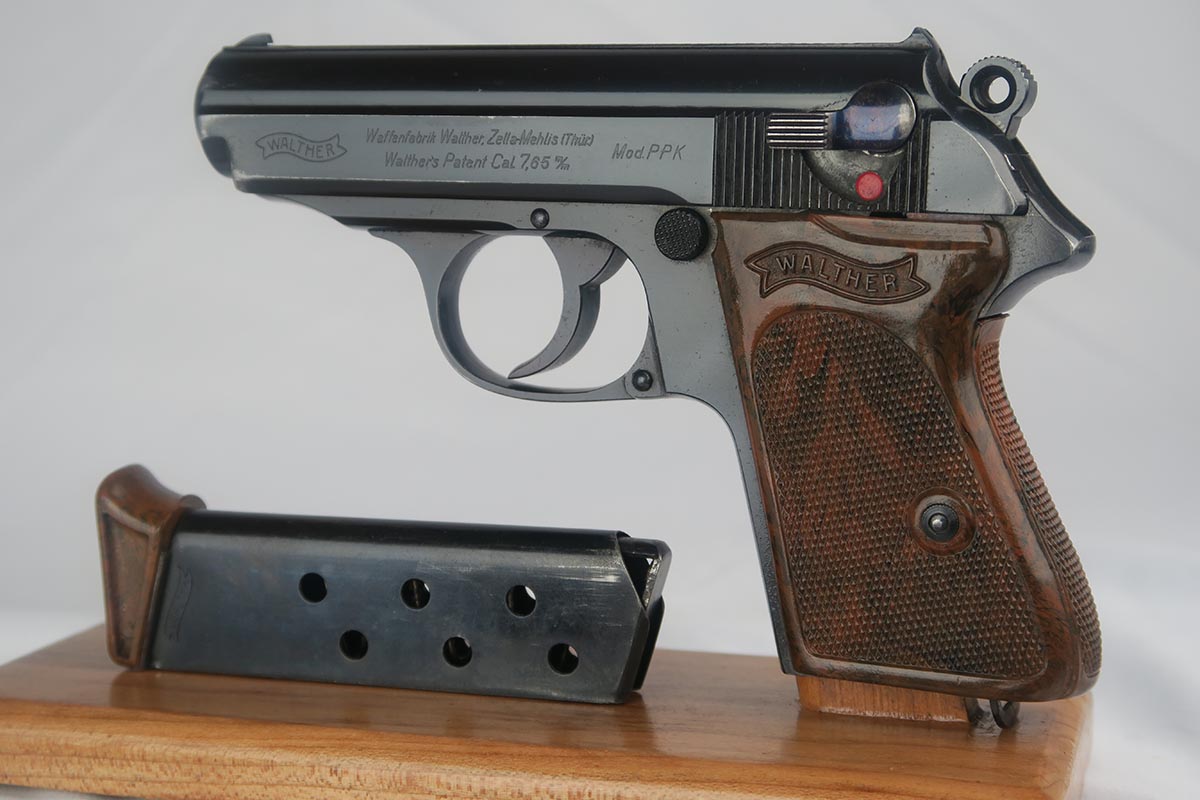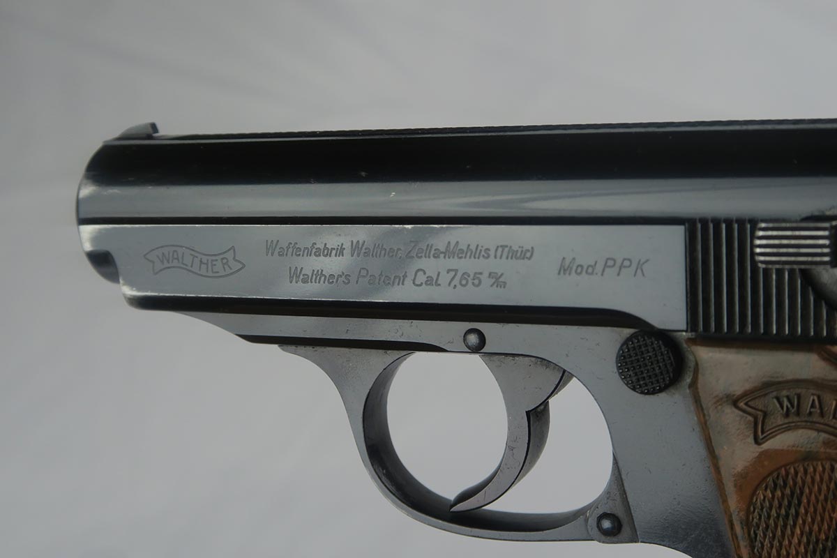 9/12/17 – This is a very nice, all original Walther PPK from the World War II era. Serial on this one dates it to about 1940, and it appropriately has Eagle/N proofs on slide and frame, as well as 60 degree safety. High-polish blue rates at about 96% with some muzzle wear, as well as a spot of finish loss on the trigger guard and in front of the ejection port. Excellent grip and finger extension magazine with no chips or cracks. Excellent bore, as well.