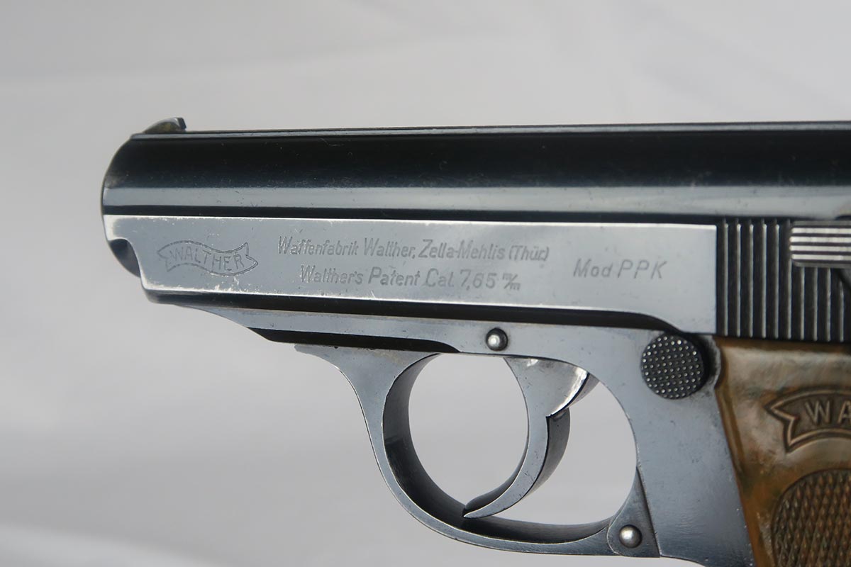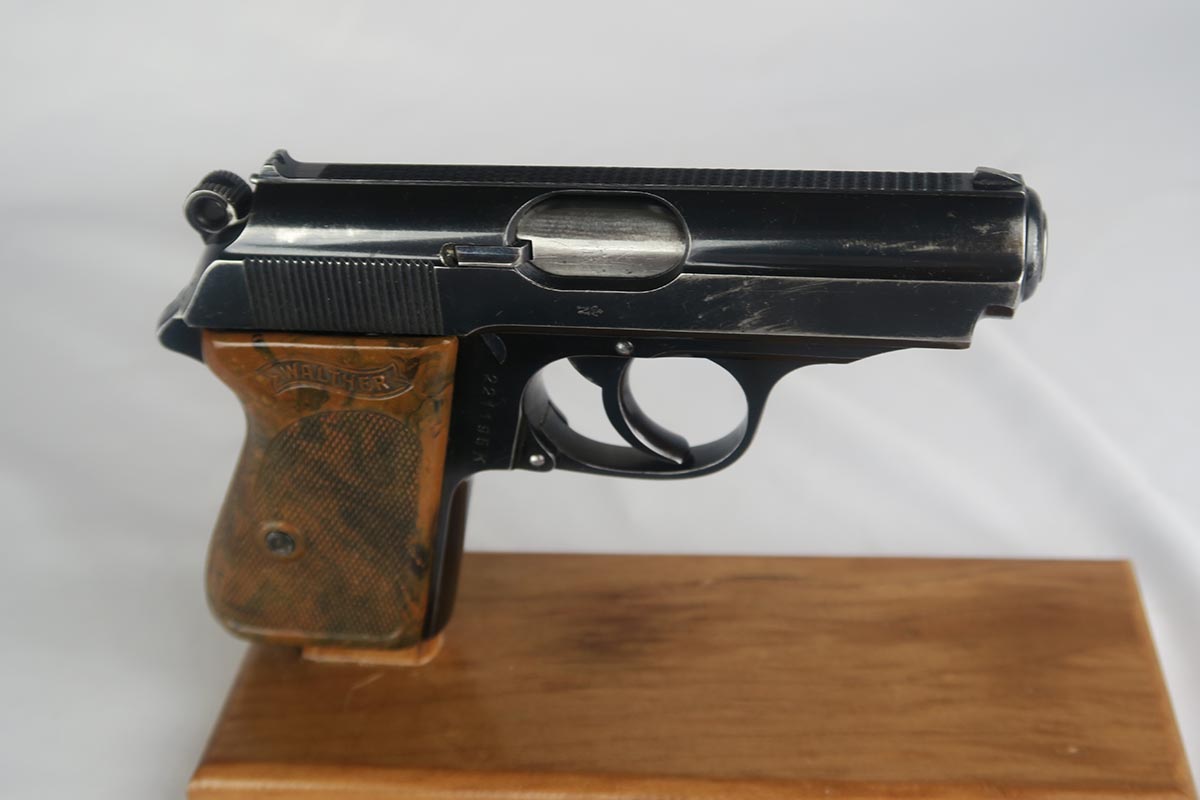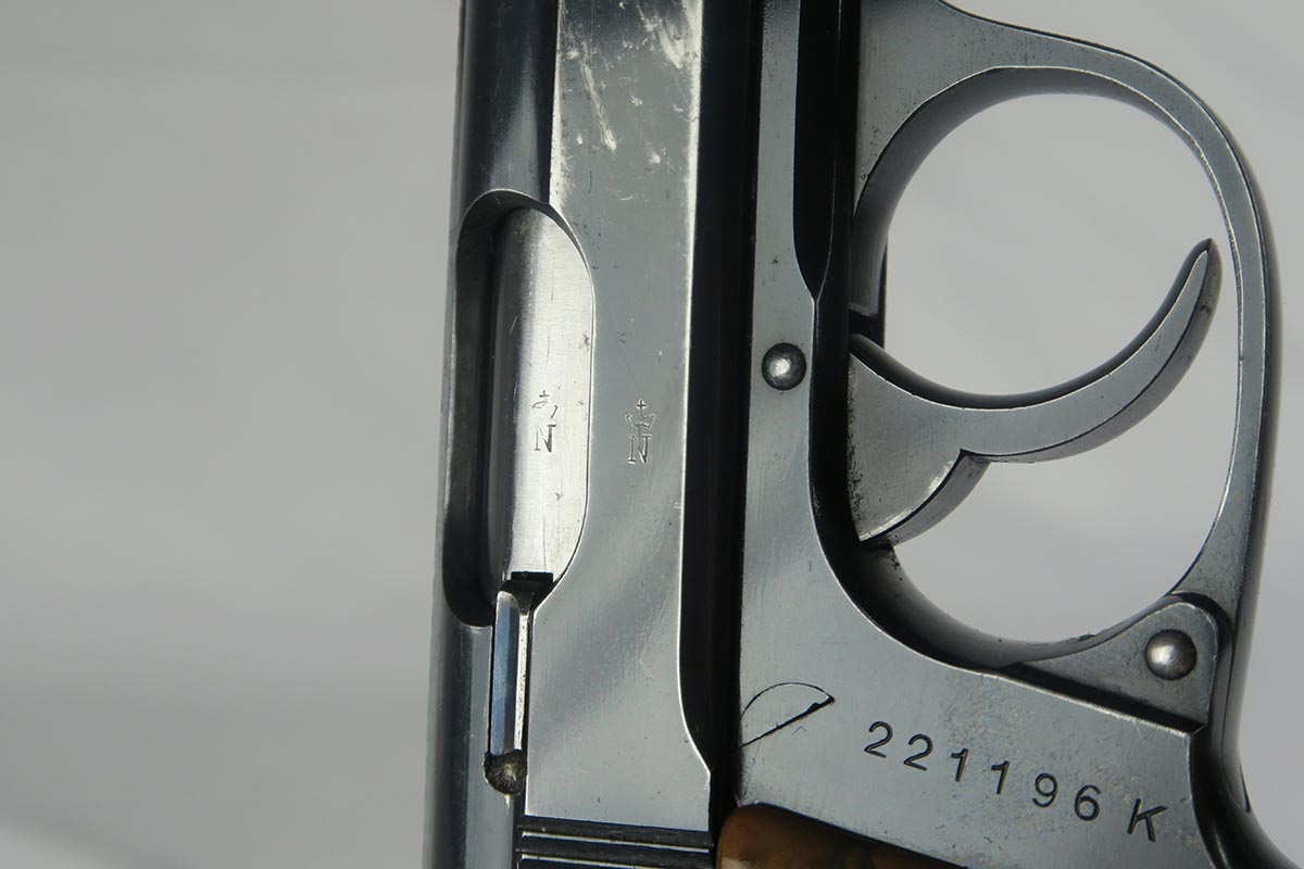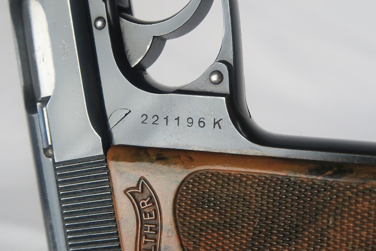 9/15/17 – This is a commercially issued Walther PPK from 1939.  It is all original and correct, with a finish that rates at about 94%.  The most notable spots of wear can be seen on the trigger guard and the right side of the slide.  Crown/N proofs on the slide and frame.  60 degree safety.  Wartime mag with excellent finger extension.  Grip is excellent too with no major flaws.  Very good bore.