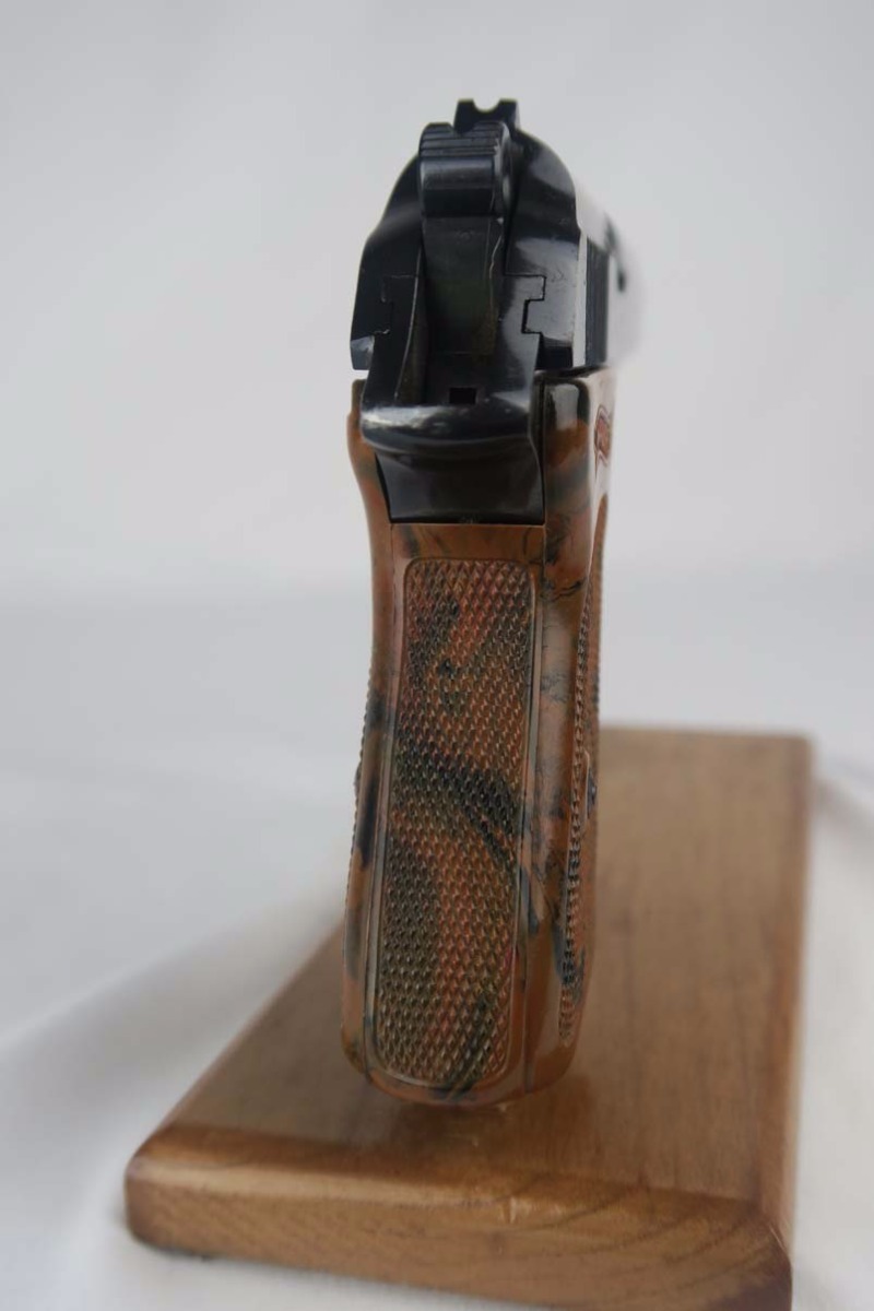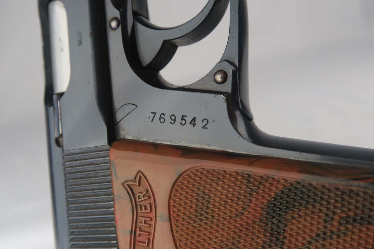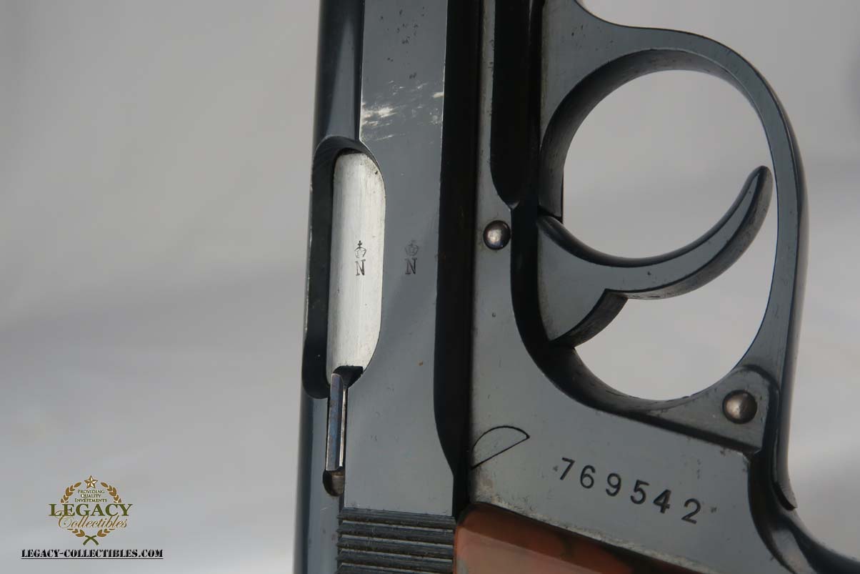 7/18/17 – This is a very early Walther PPK, manufactured in about 1931 for commercial sale.  It is all original and correct with about 97% bluing remaining.  The slide and safety lever have minor freckling, and the right side of the slide is where you’ll find most of the finish loss.  Excellent grip with no major chips or cracks.  90 degree safety and Crown/N proofs.  Early banner magazine.  Minty bore.