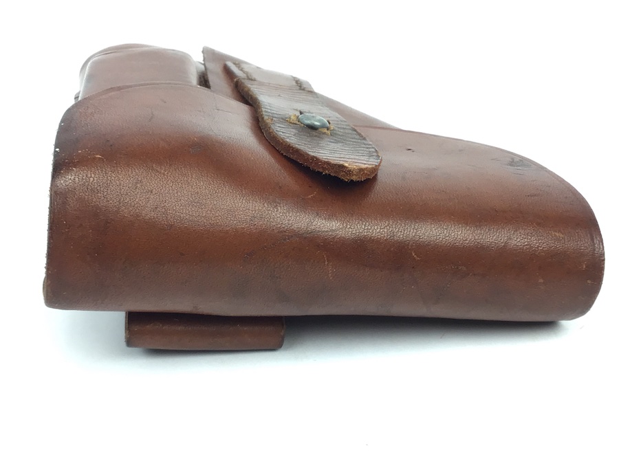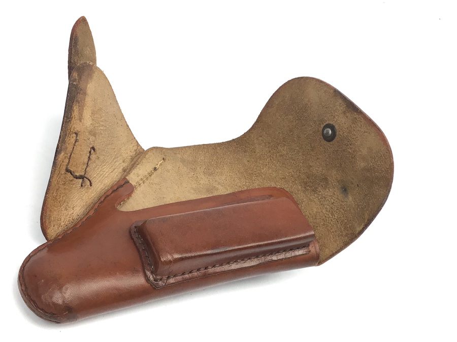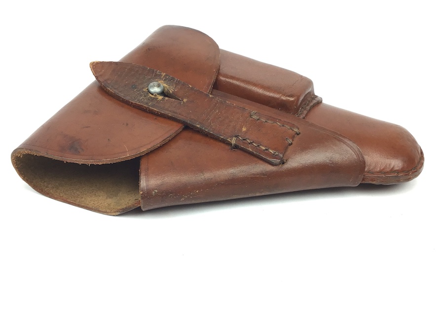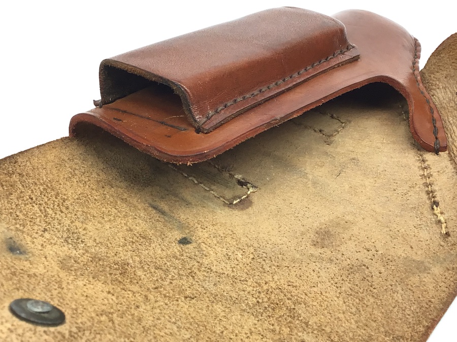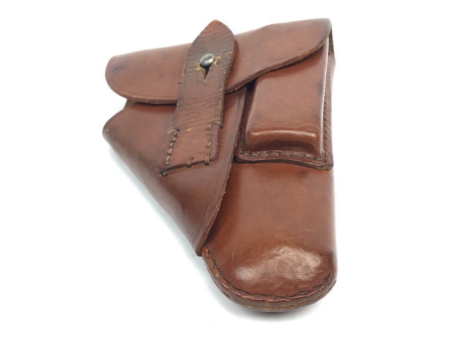 9/15/20 – This is an original Walther PPK holster from WW2 era. The holster has no markings, so we assume commercial issue. The holster has a very nice exterior with minor use wear and some staining. The closure strap has minor wrinkling. The interior leather is clean. The stitching is all tight and original. Guaranteed authentic.